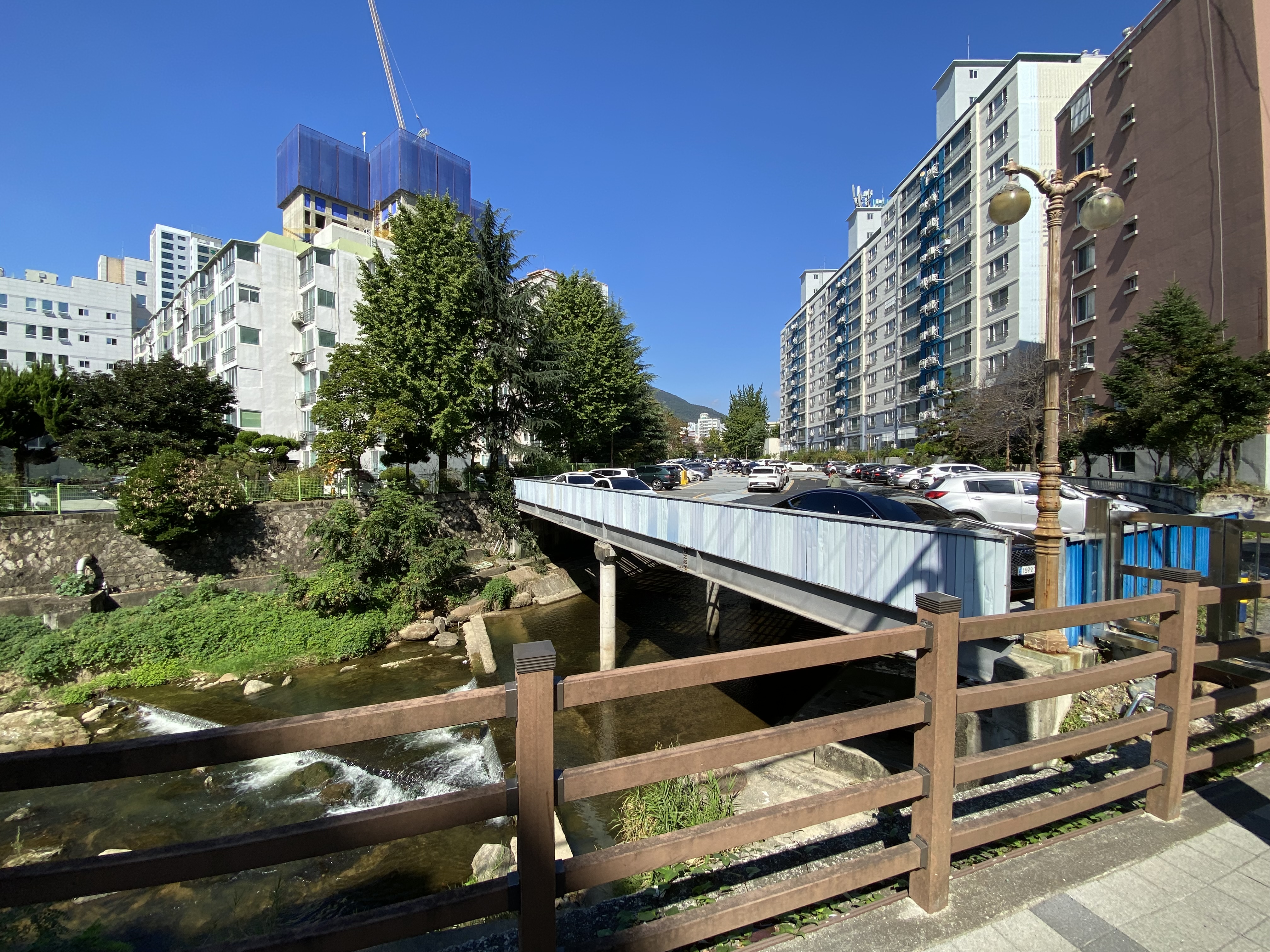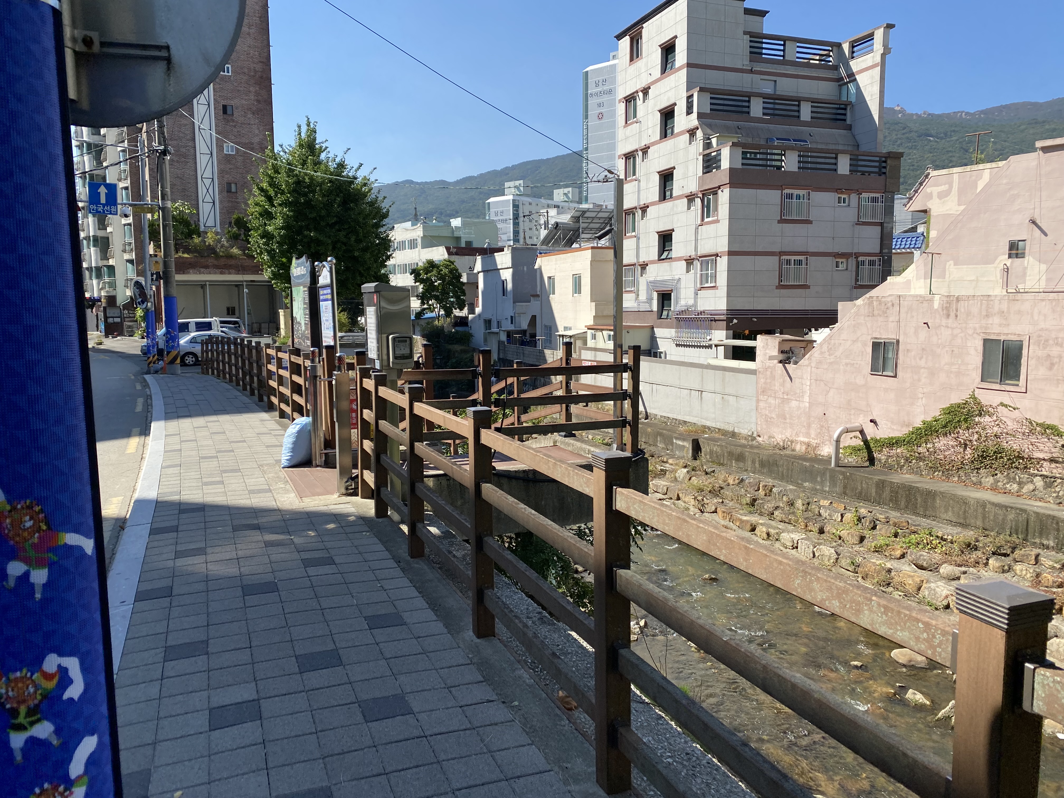 남산역 공영주차장을 나와 온천천을 보니 내려가는 길도 없고 사람이 걸을 수 있는 공간도 없어서 잠깐 당황했습니다. 하지만 걱정뚝. 조금만 더 내려가면 길이 나옵니다.