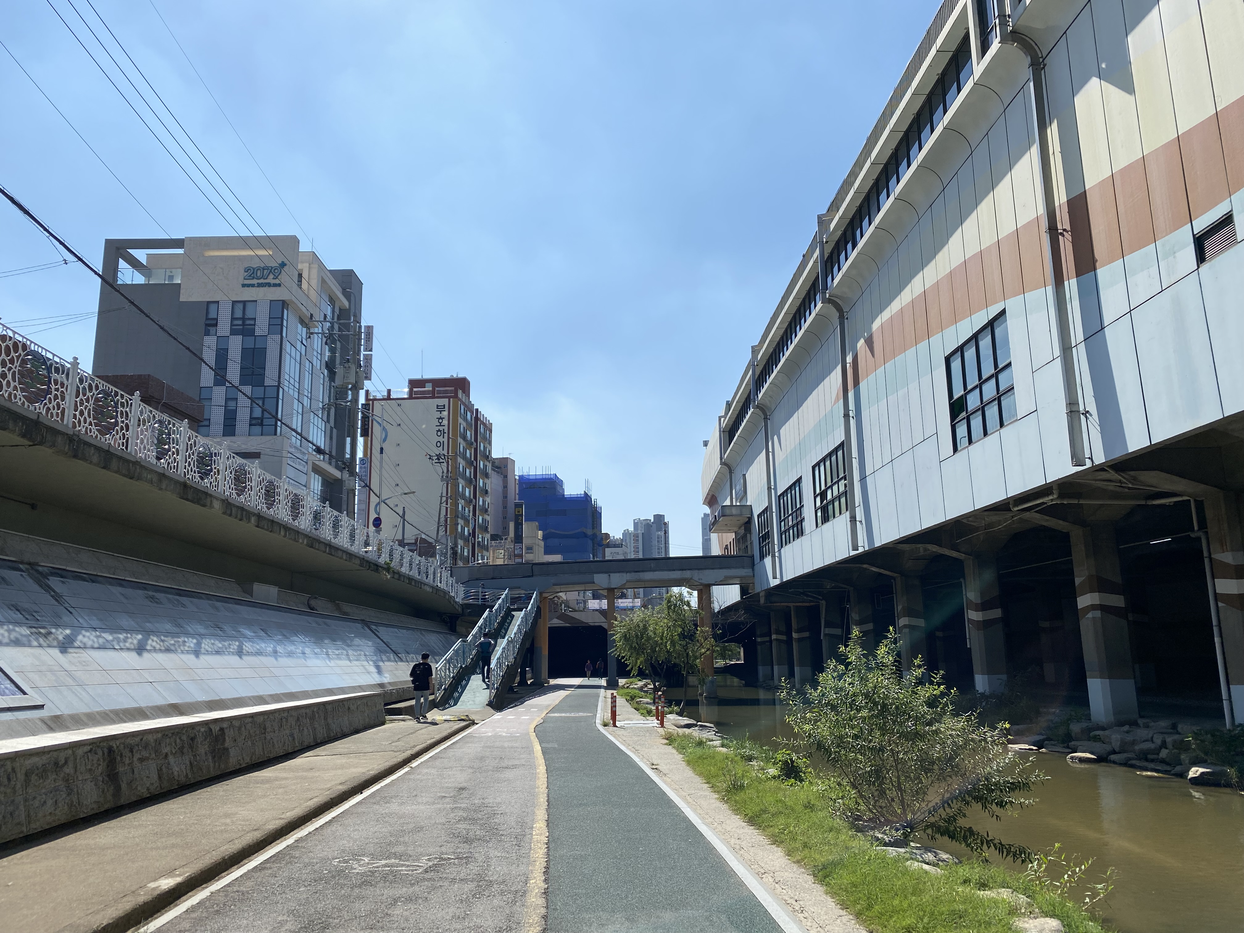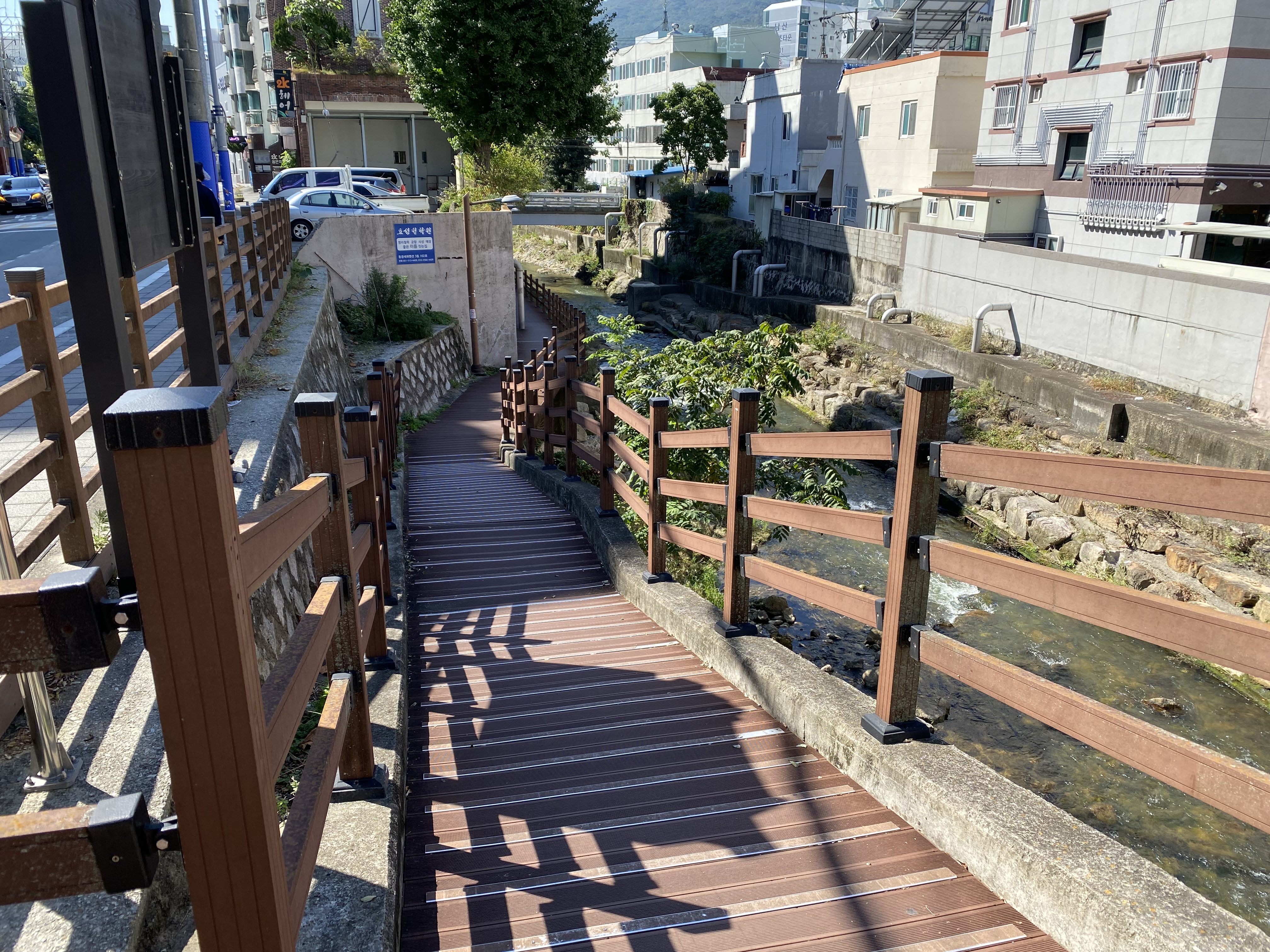 남산역 공영주차장을 나와 온천천을 보니 내려가는 길도 없고 사람이 걸을 수 있는 공간도 없어서 잠깐 당황했습니다. 하지만 걱정뚝. 조금만 더 내려가면 길이 나옵니다.