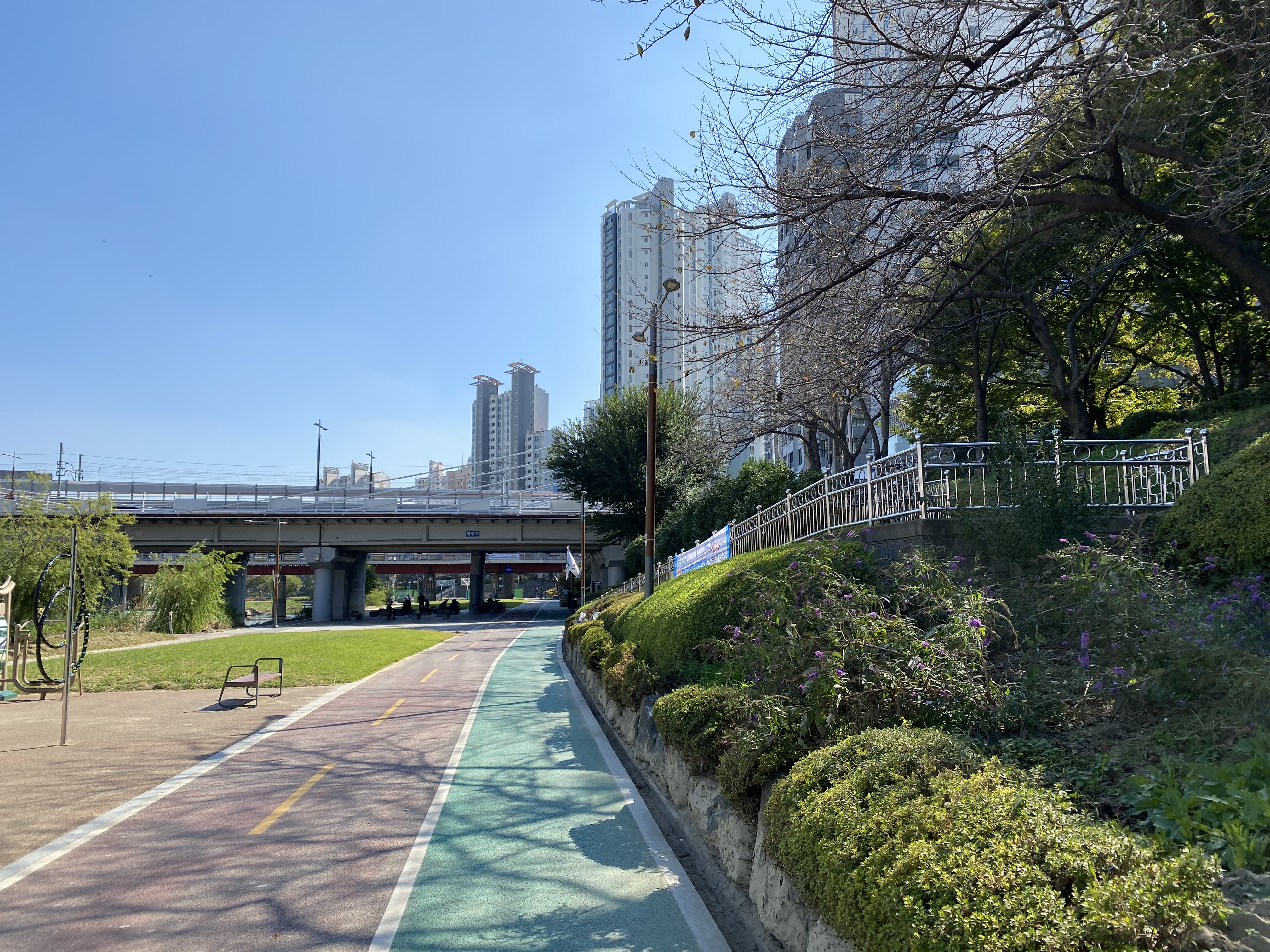 자전거 보행자 겸용도로도 있습니다. 제가 잠시 본 바로는 이런 표지판에 영향을 받지 않고 자전거는 지나갔으며 다행히도 크게 빨리 달리는 자전거는 보이지 않았습니다. 이런 사람들이 많이 이용하는 곳에서는 자전거로 속도를 뽑는 건 아니라고 생각합니다. 진짜진짜 위험하니까요.