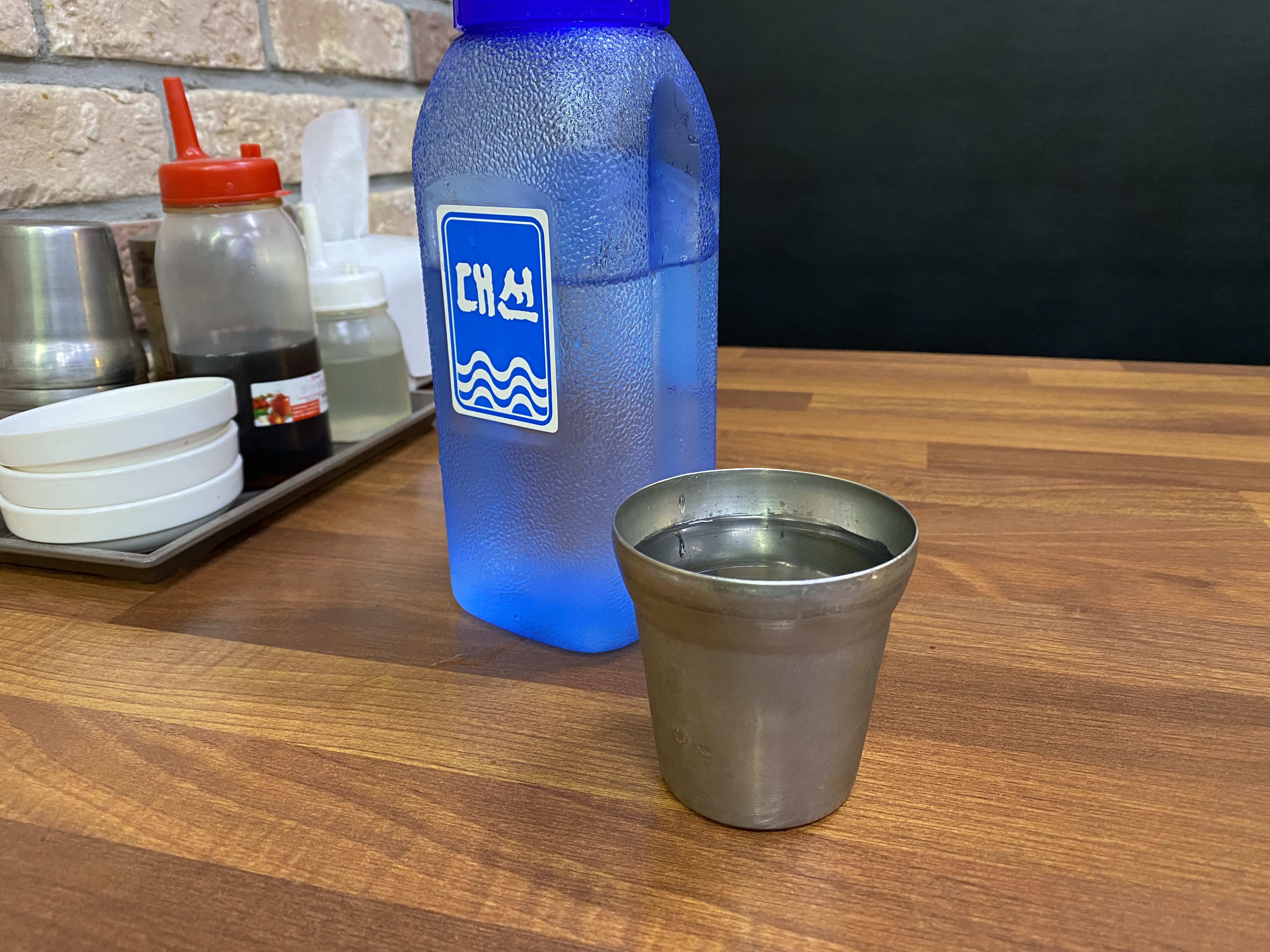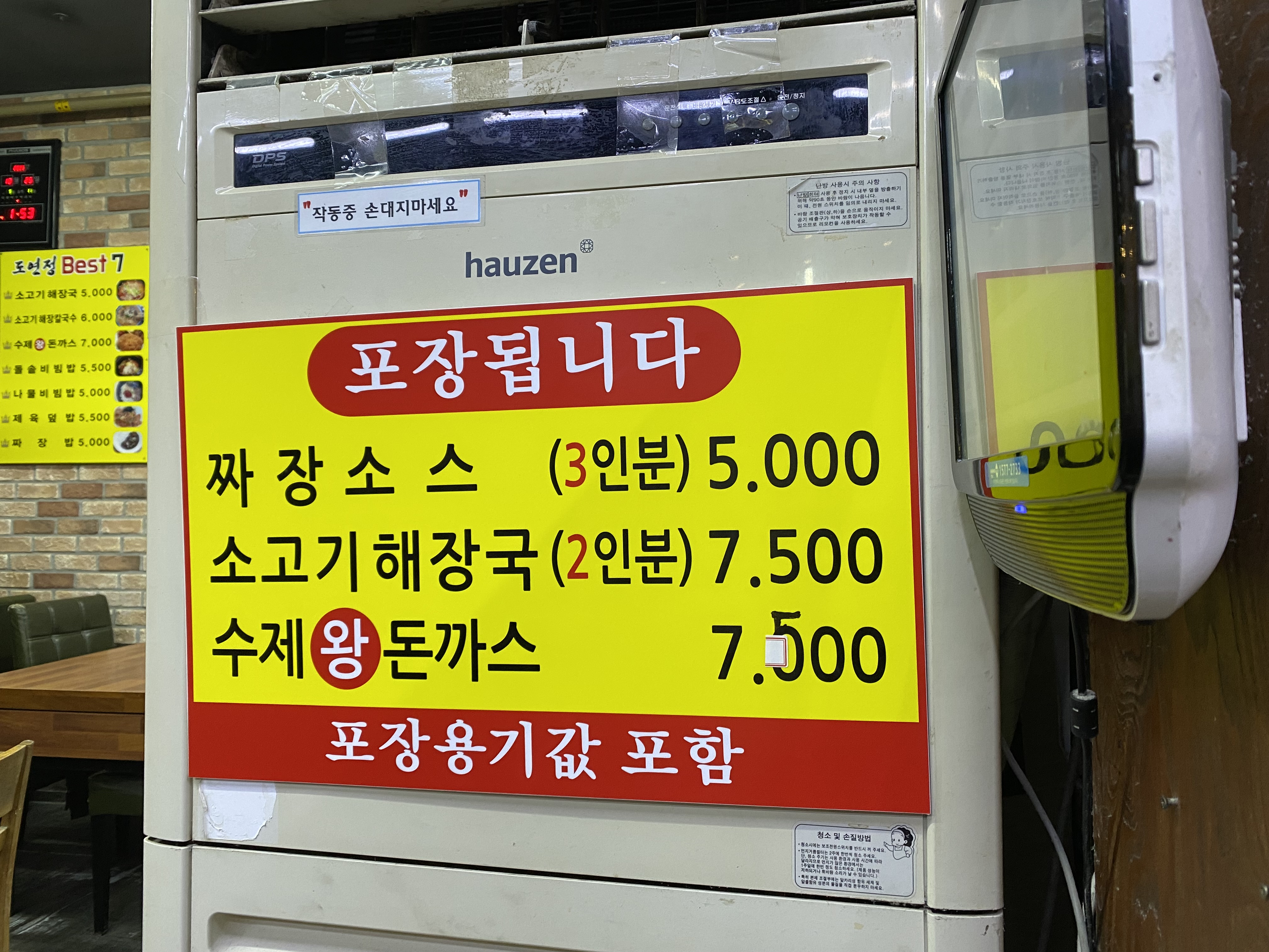 보통 저렴한 식당은 선불입니다. 여기 도연정도 선불. 기본 반찬으로 김치가 나오는데 저기 건너편을 보니 단무지도 보이네요. 필요하면 더 덜어서 먹어도 되는 것 같습니다.