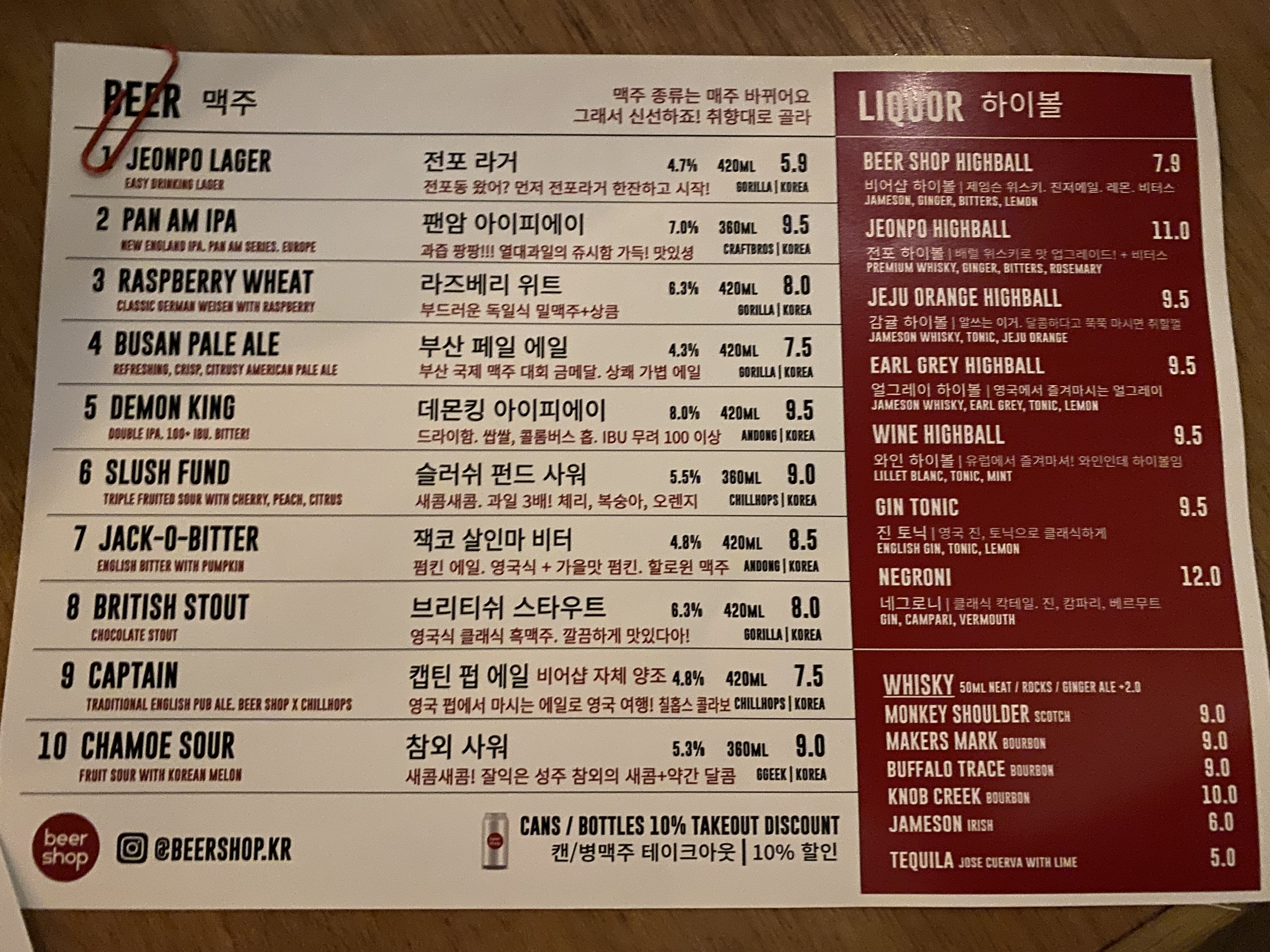 전포카페거리 비어샵 beershop. 1차를 먹고 2차로 간단하게 맥주 또는 하이볼 한잔하기 괜찮은 곳이라 생각합니다. 그리고 점심때 기분이 좋아 낮술 한잔하고 싶을 때 들려도 좋을 것 같네요. 마음에 드는 맥주집입니다. 참고로 비어샵 운영시간은 11:30~24:00, 월요일, 화요일 휴무입니다.
