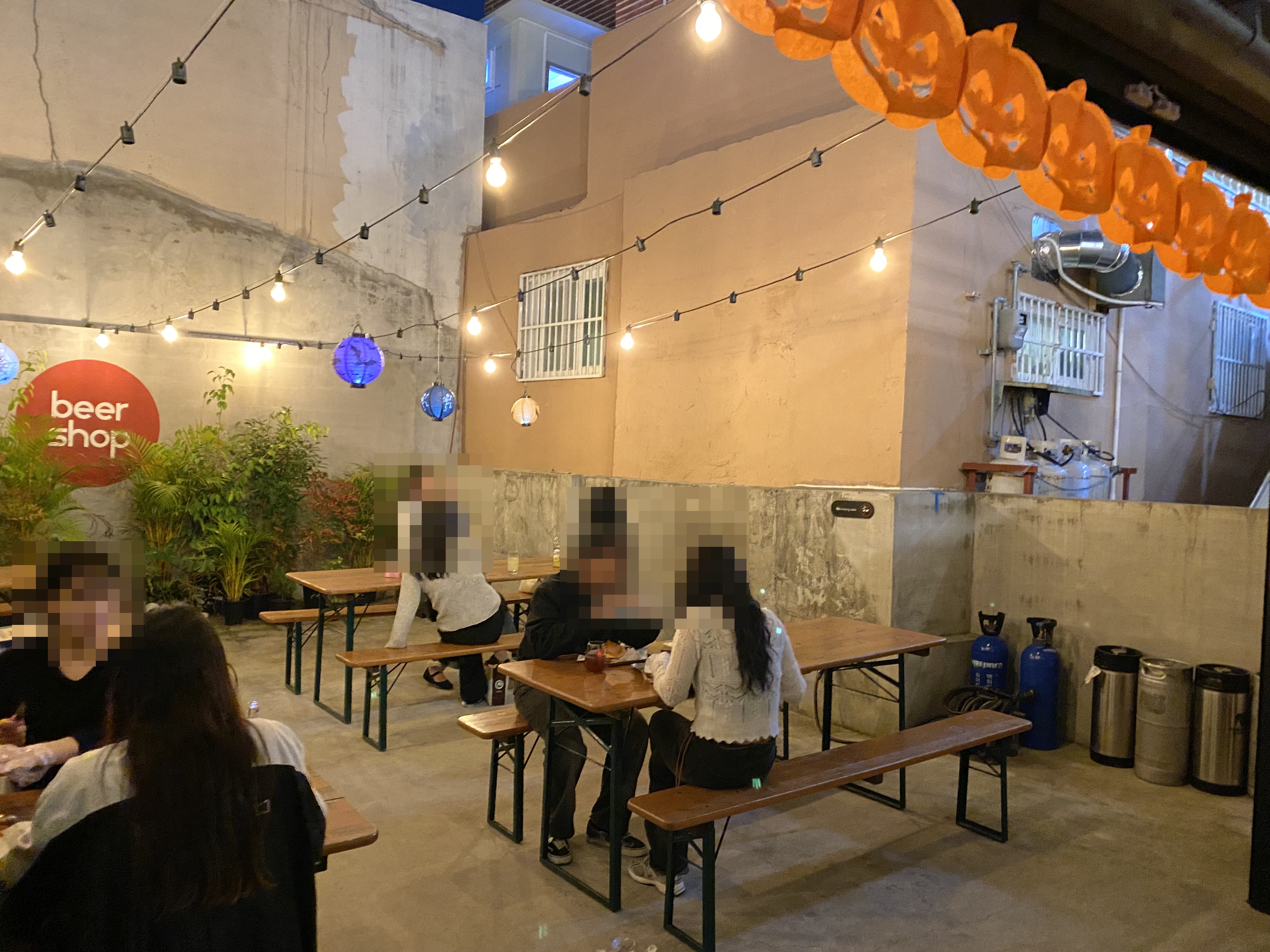 매장 안쪽으로 가면 야외 테이블이 있습니다. 비어샵이 좁은 골목에 있어서 매장이 정말 작다고 생각할지 모르지만 여기 숨은 야외 공간이 있어서 손님을 제법 많이 커버할 수 있습니다. 지금까지 여기 4번 정도 갔는데 한번 빼고는 다 자리가 있었습니다.