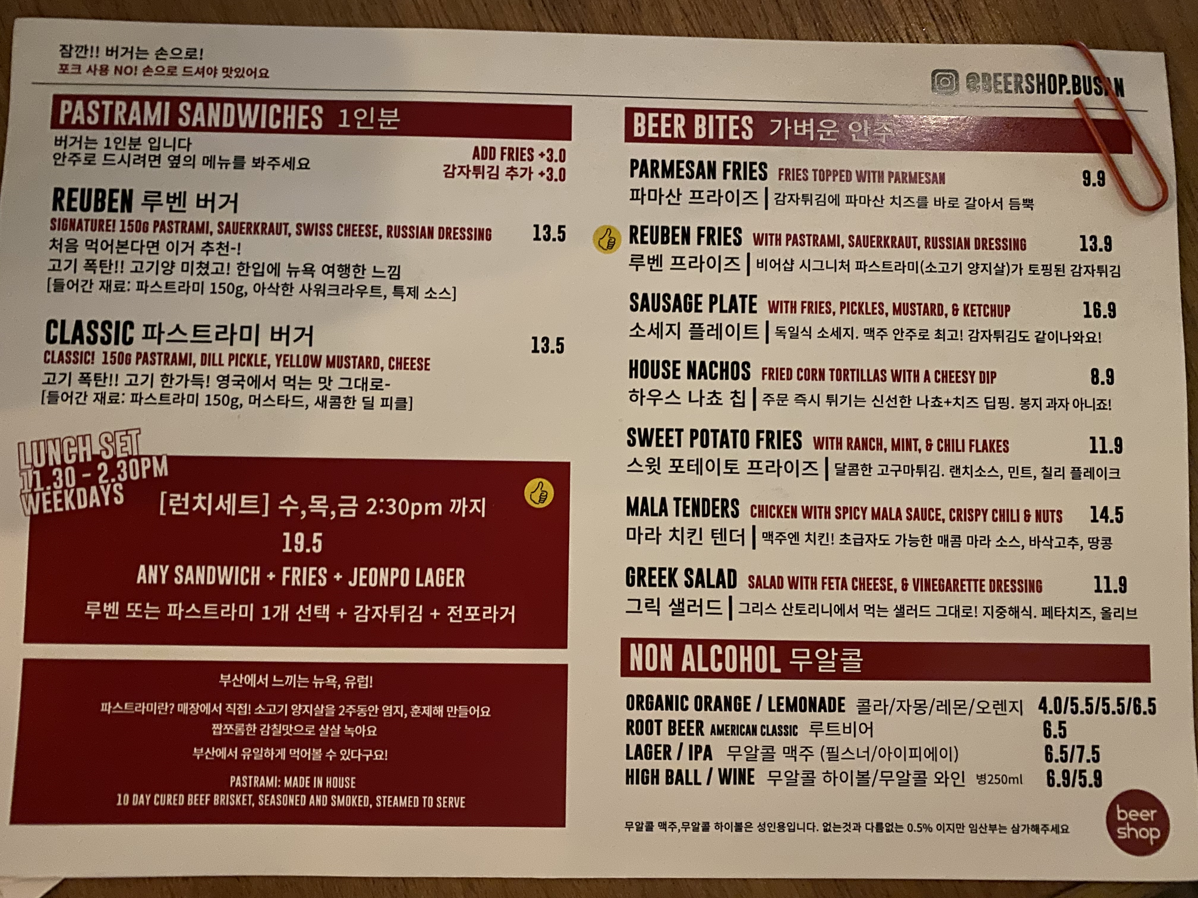 전포 비어샵 안주 메뉴판입니다. 고민하기 싫어 엄지 척 모양이 있는 루벤 프라이즈를 주문했습니다. 여기서 이것저것 먹어봤는데 안주는 다 맛있었습니다. 가격 대비 퀄리티가 괜찮다고 생각합니다. 매장을 둘러보면 버거도 맛있을 것 같다는 생각이 듭니다. 근데 아직 버거는 안 먹어봤네요. 여기 비어샵의 특징 중에 하나가 런치세트가 있다는 것입니다. 자세한 내용은 위 메뉴판을 참고하세요. 버거와 감자튀김에 낮술이라 생각만 해도 기분이 좋아집니다. 영국 여행을 할 때 가끔 사람들이 점심시간에 맥주를 한잔씩 하고 일하러 가는 걸 볼 수 있었는데 전포카페거리에는 비어샵이 있어서 가능하지 않을까 싶네요. 회사에서 허락하면.