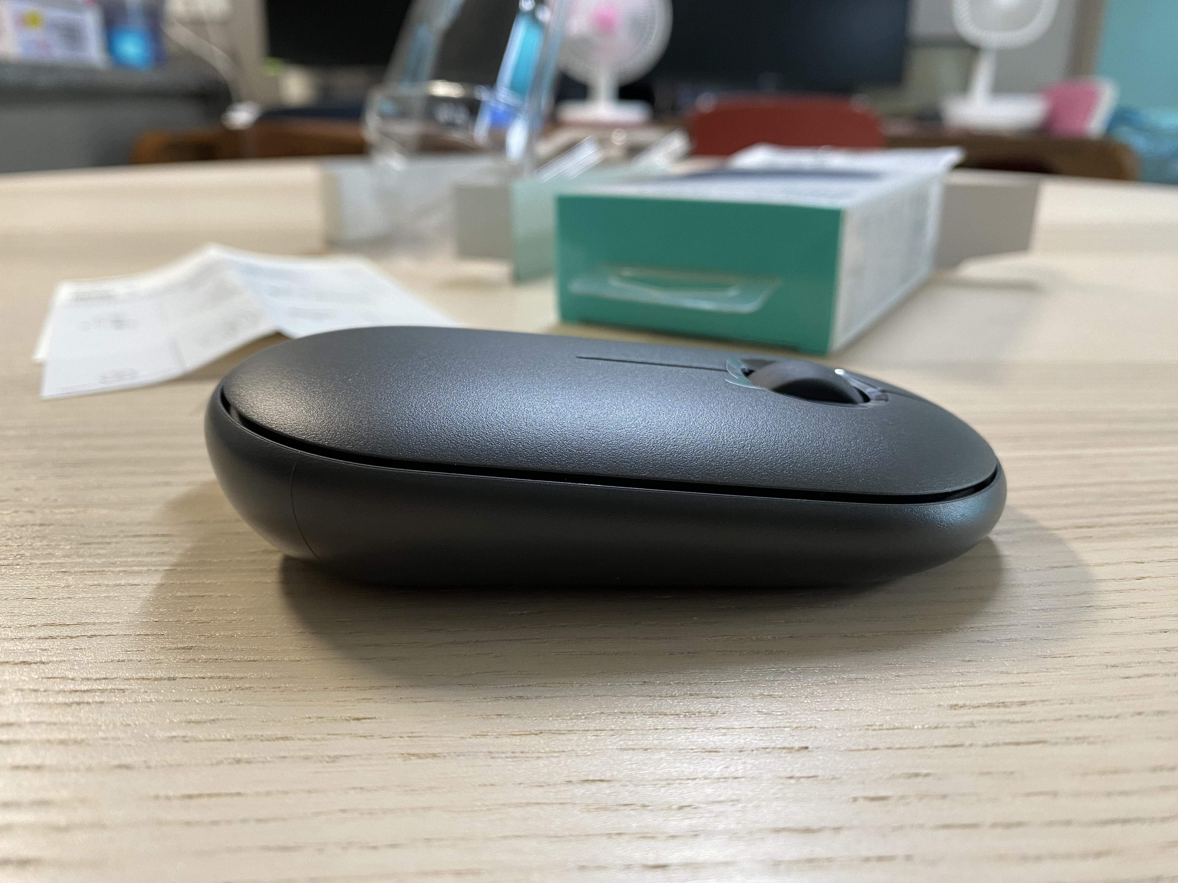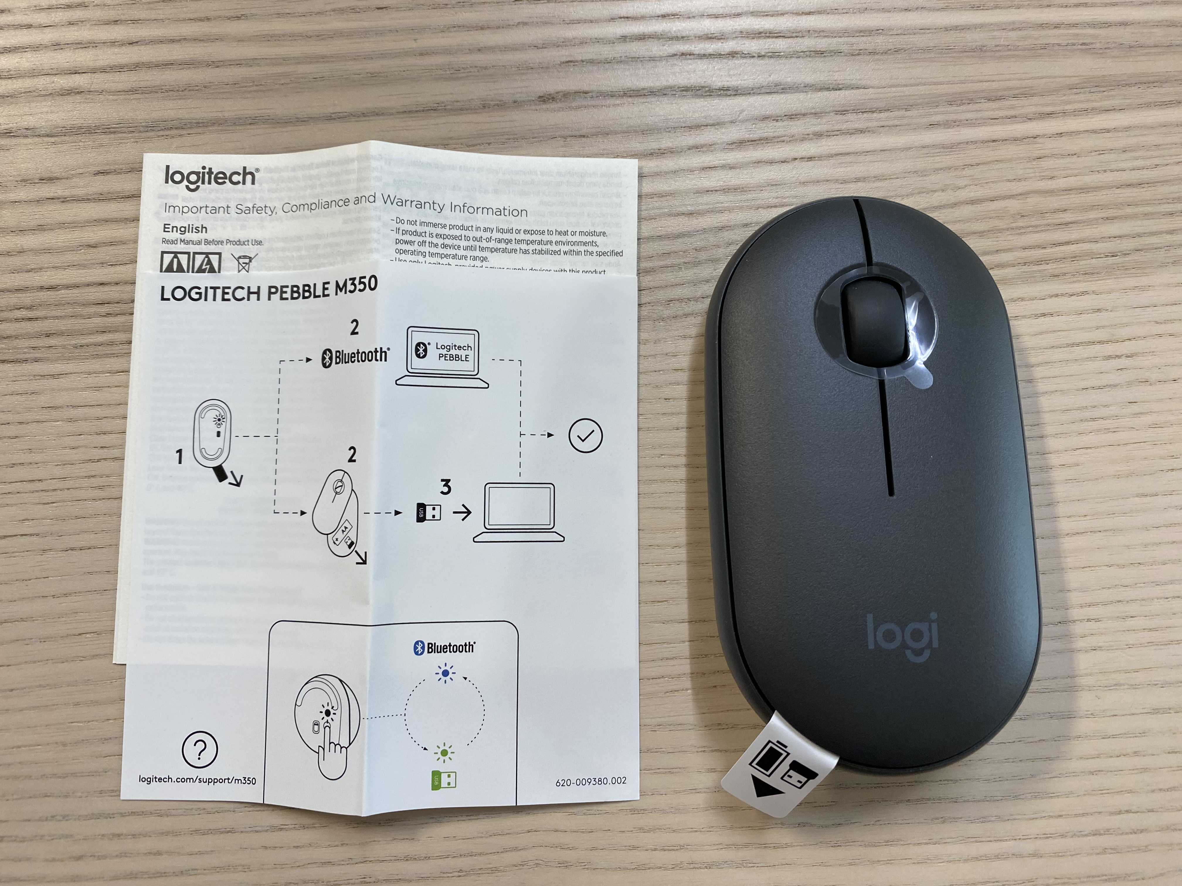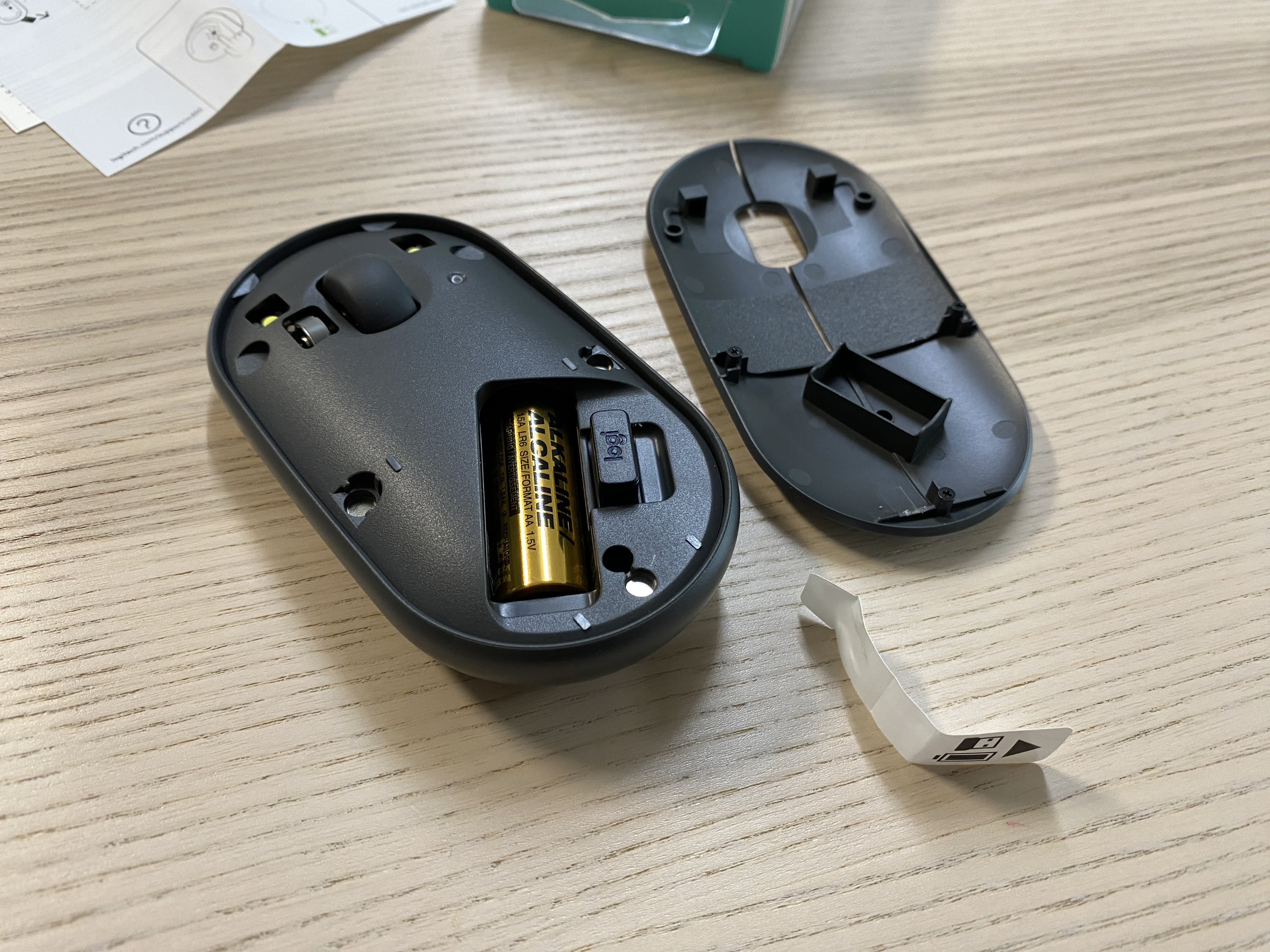 로지텍 페블 M350 마우스의 모습입니다. 커버를 열면 배터리와 무선 동글이 들어있습니다.
