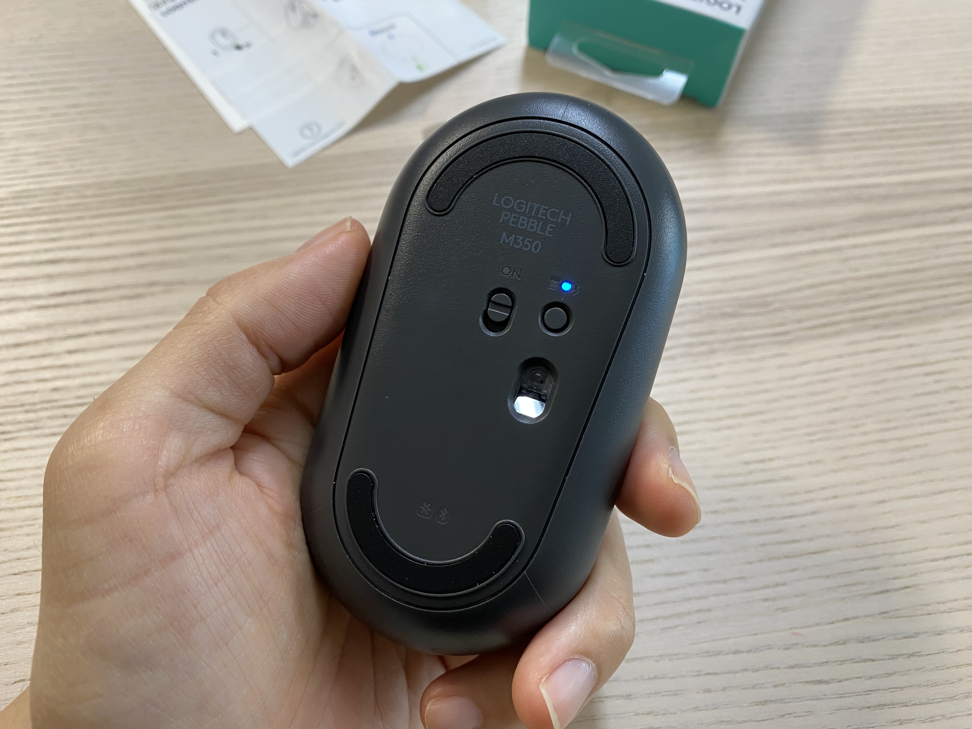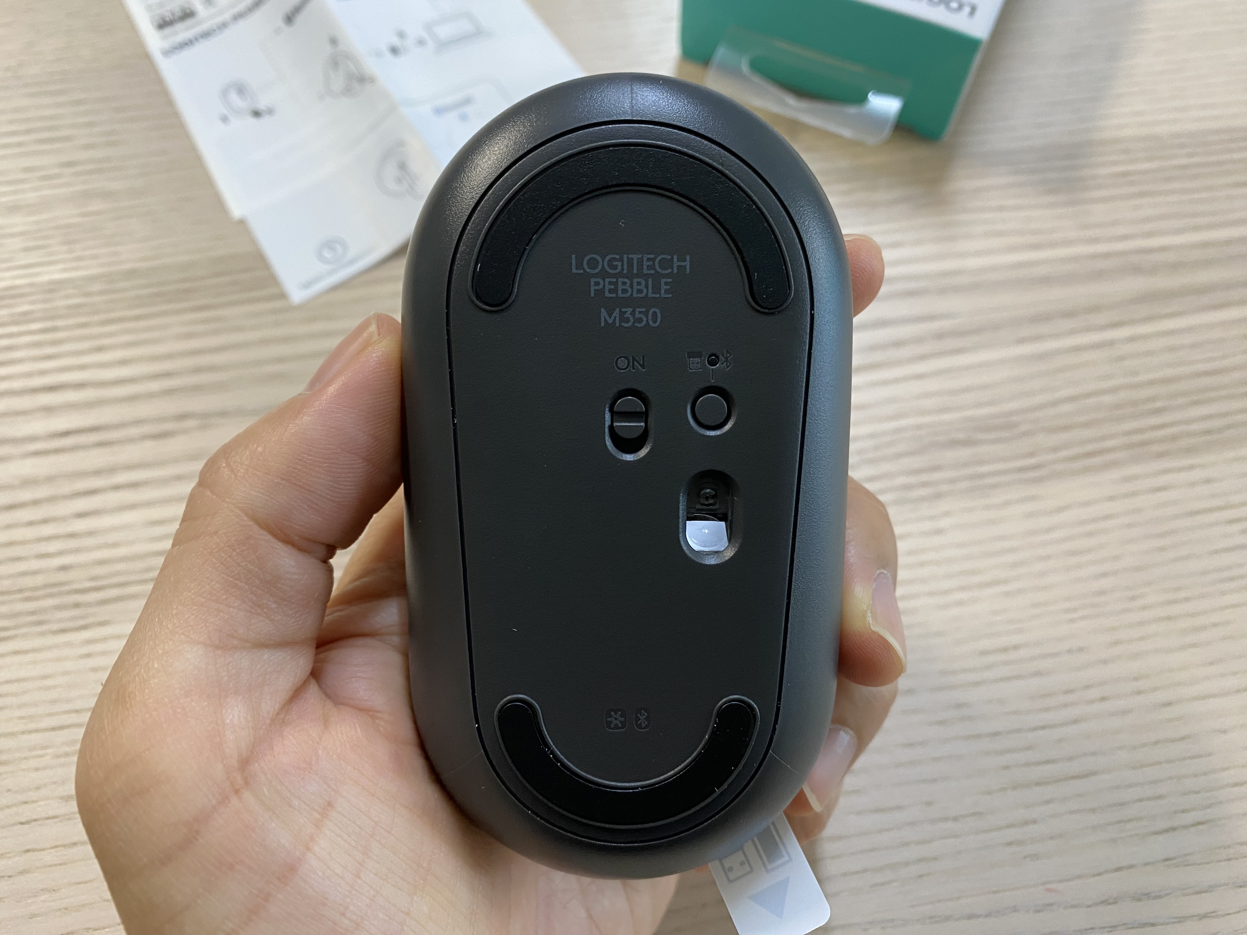 로지텍 페블 M350 마우스의 바닥 모습. 마우스 센서, 전원 스위치, 모드 전환 버튼이 있습니다.