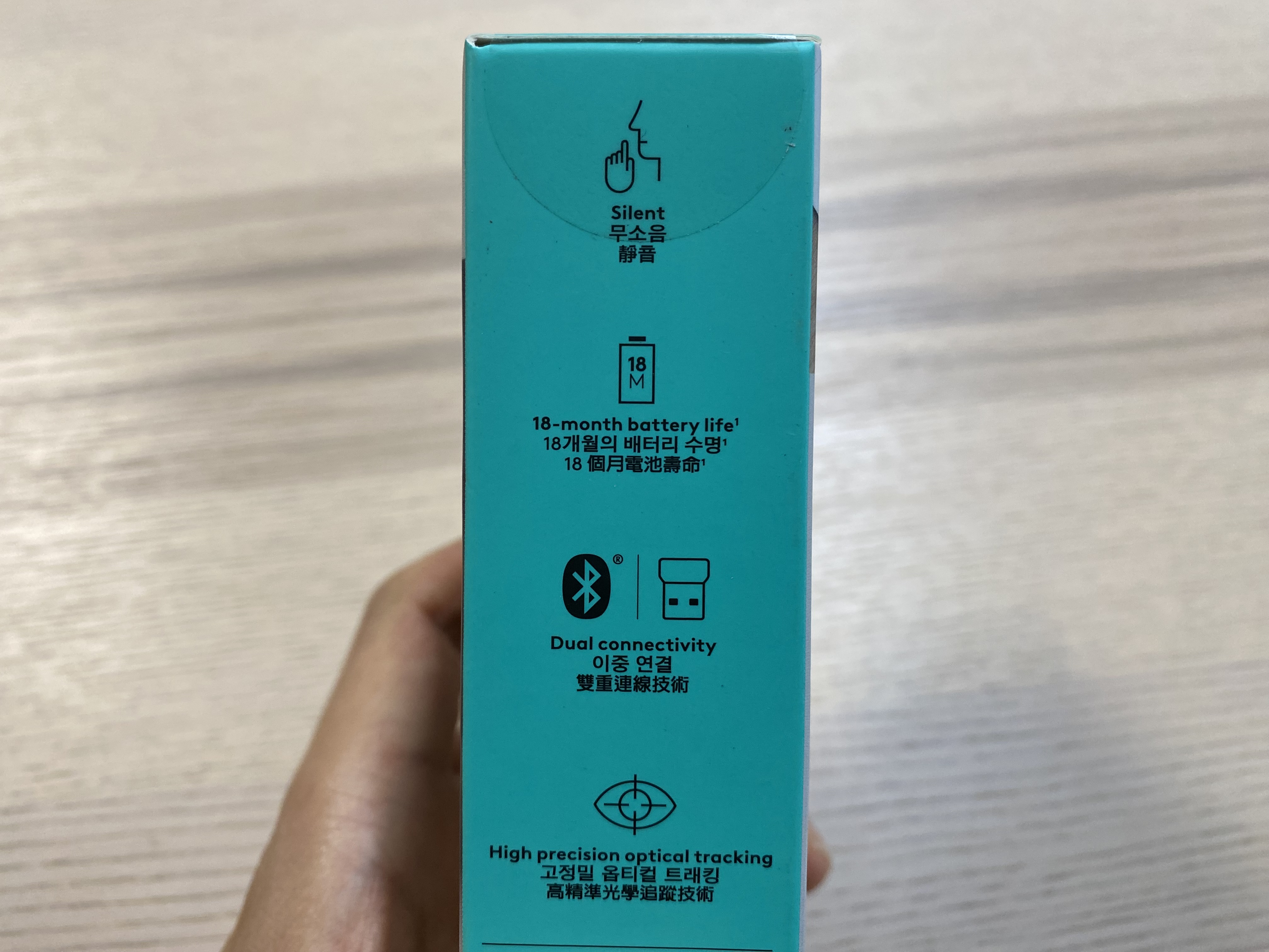 박스를 보면 제품의 특징을 볼 수 있습니다. 로지텍 페블 M350 마우스는 USB 리시버(동글)가 포함된 제품이고 클릭 소리가 조용한 것이 특징입니다.