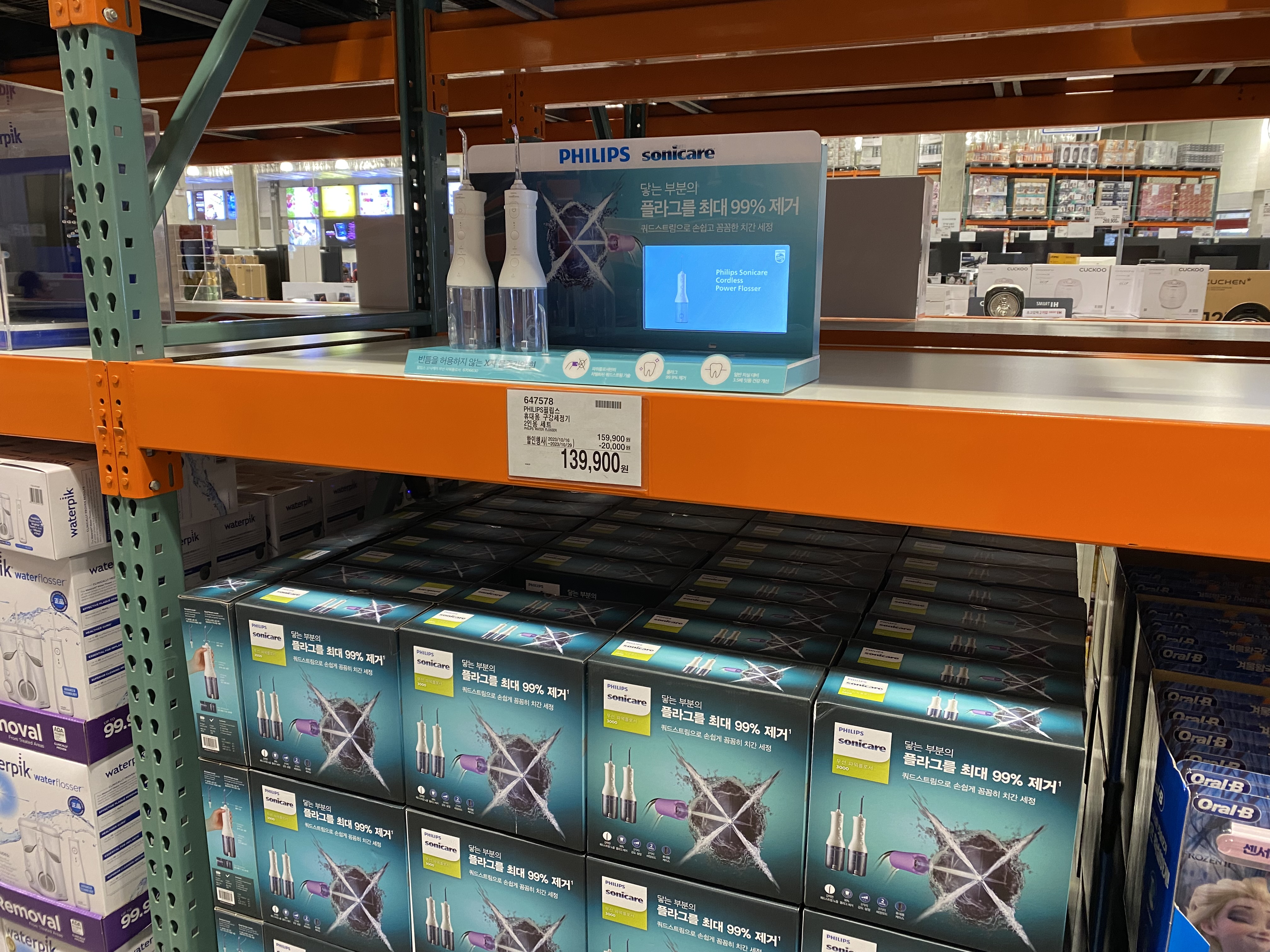 필립스 휴대용 구강세정기 옆에 보면 WATERPIK 워터픽 구강세정기도 있는데 이것도 제법 유명한 제품입니다. 휴대용 2개가 들어있는 필립스와는 달리 워터픽 제품은 거치해서 쓰는 조금 큰 (물이 좀 더 들어가는) 기기도 포함되어 있습니다. 코스트코에서는 이 두 제품을 비교해 보고 구매를 하면 될 것 같습니다. 할인을 안 할 때는 인터넷이 더 저렴할 수도 있으니 한번 확인해 보고 구매하세요. 저도 이 두 제품을 한참 고민했었는데 확실히 외관 디자인만 보면 필립스가 압승입니다. 확실히 필립스가 더 있어 보입니다. 예전부터 가전을 만든 회사라 그런가. 제품 모양도 그렇고 세면대에 고정식 구강세정기를 거치할 수 있는 공간이 별로 없어서 휴대용 2개가 포함된 필립스를 선택했습니다.