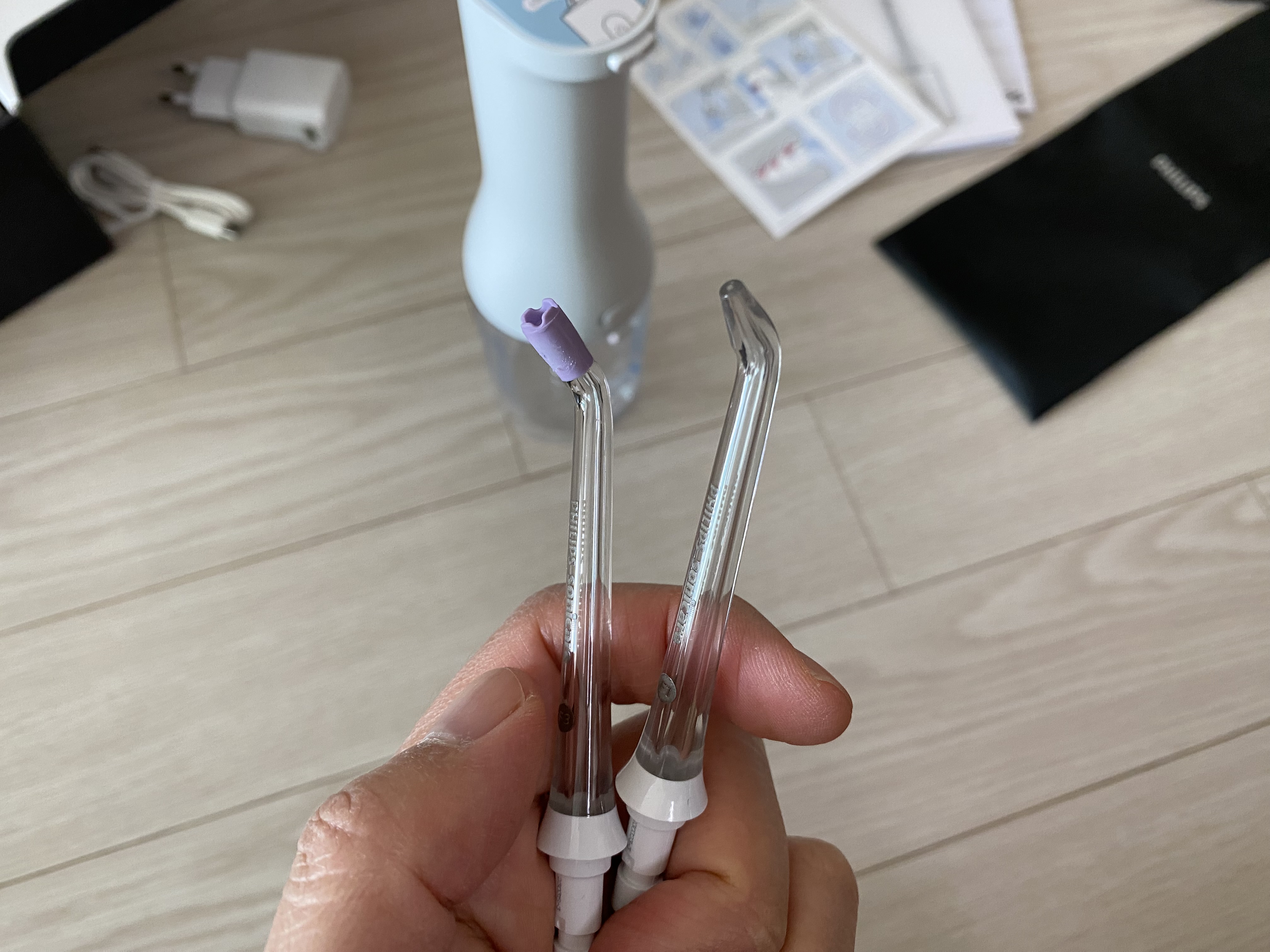 필립스 휴대용 구강세정기에 일반형 노즐을 장착한 모습입니다.
