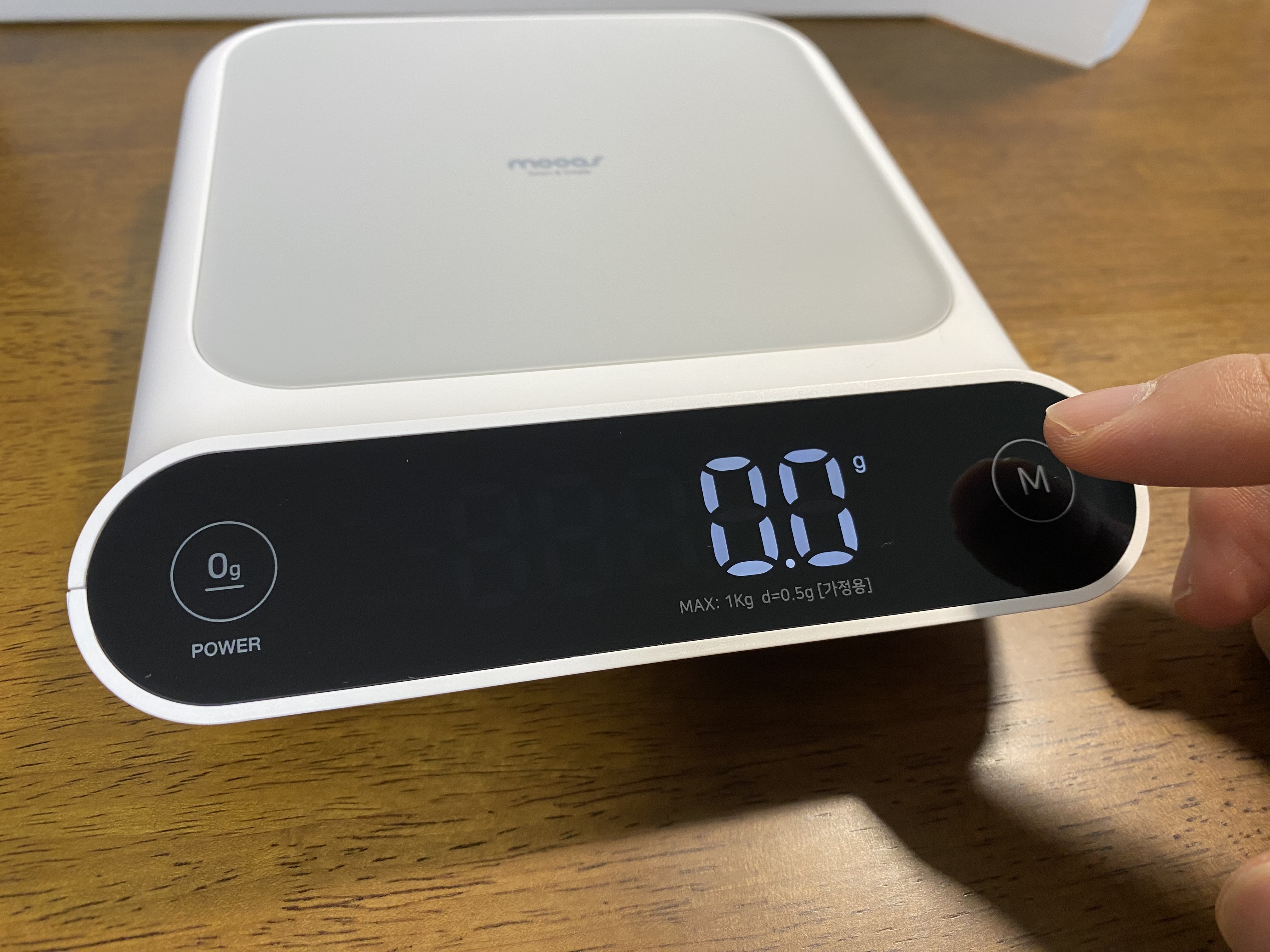 무아스 모던스퀘어 주방용 전자저울 전원을 켠 모습. LED 퀄리티는 깔끔합니다.