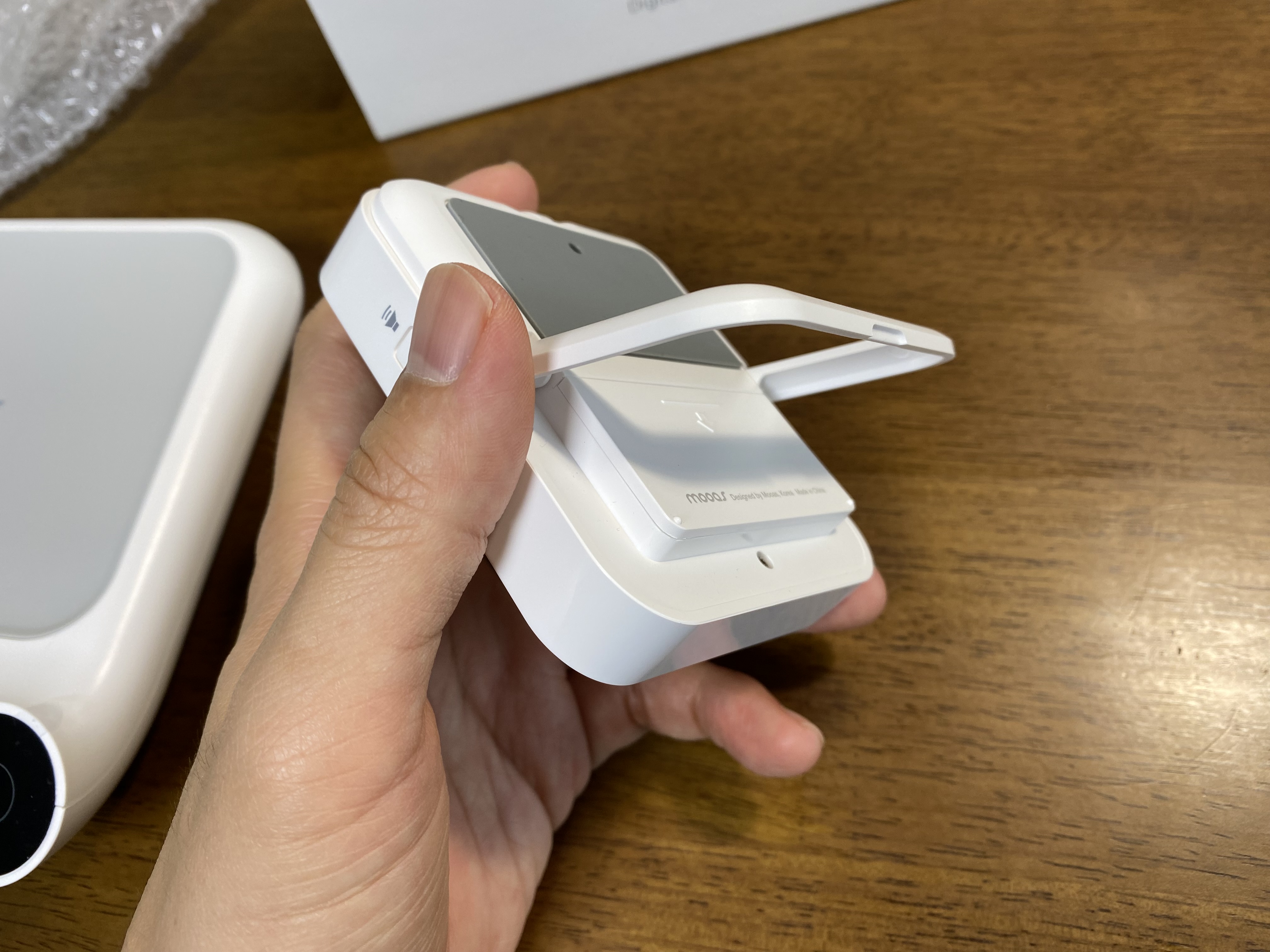 뒤에 세울 수 있는 다리가 있어서 쉽게 시계를 거치할 수 있습니다. 그리고 측면에 소리조절, 음소거 스위치도 있으서 너무 시끄러우면 소리를 줄이거나 끌 수 있습니다.