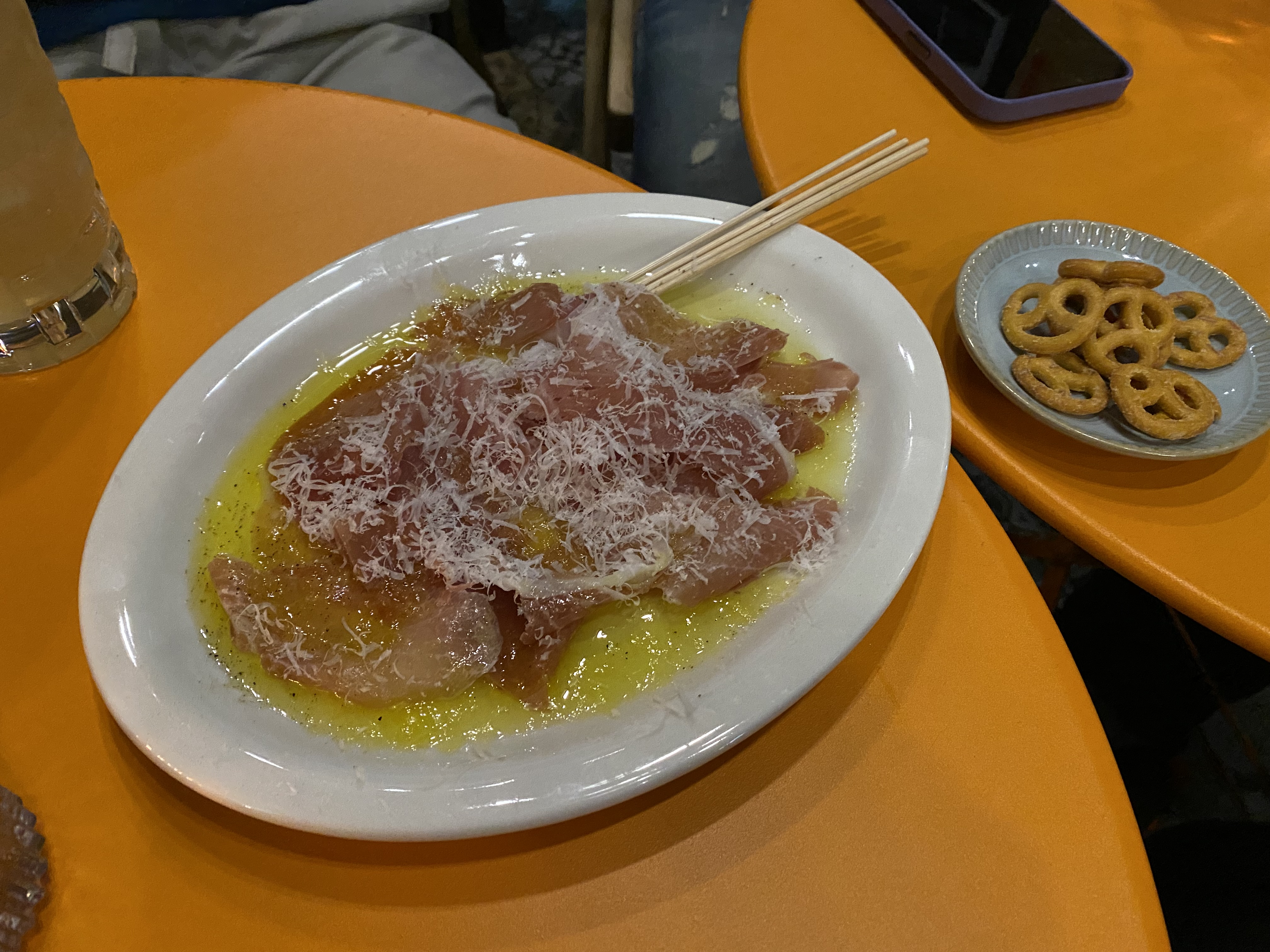 우리가 먹었던 안주. 올리브유에 얇게 썬 고기를 넣은 음식입니다. 호불호가 있었는데 저는 좋았습니다. 아마도 올리브유를 좋아하는 분이라면 괜찮을 것 같습니다.