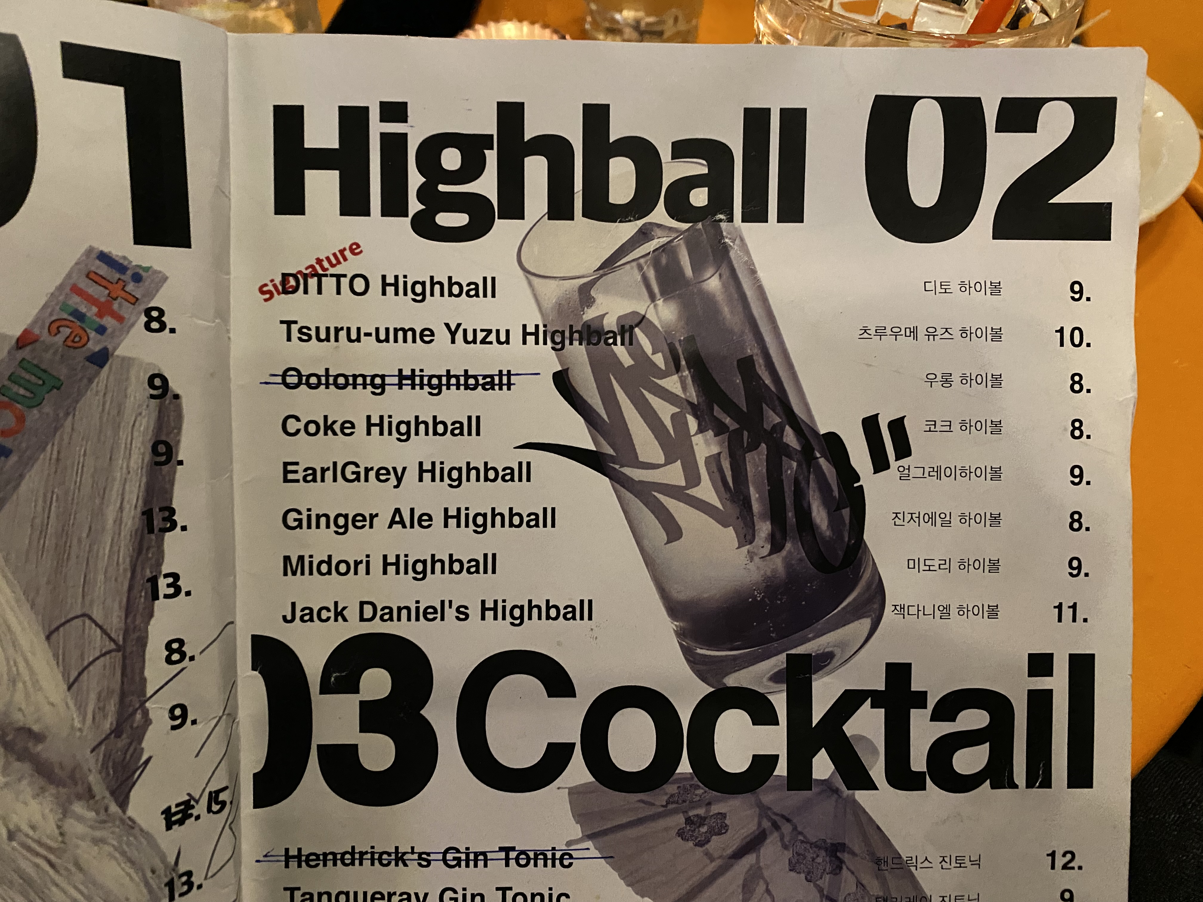 디토 DITTO 하이볼 메뉴판입니다. 여기서 디토 하이볼, 츠루우메 유즈 하이볼, 잭다니엘 하이볼, 진저에일 하이볼을 마셨습니다. 단맛을 좋아하는 분이라면 유자맛이 나는 츠루우메 유즈 하이볼을 추천합니다. 참고만.