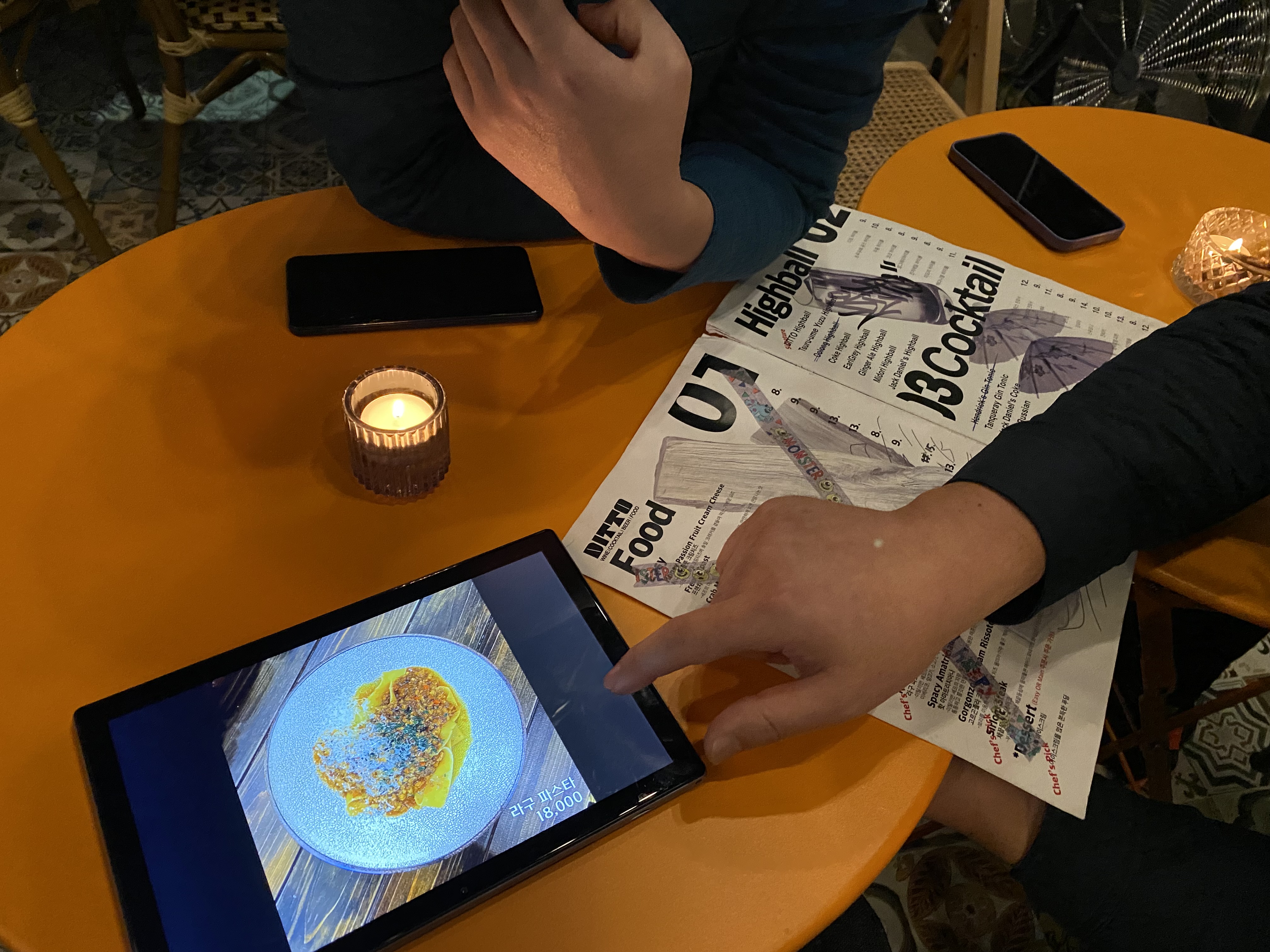 디토에서 안주는 이 태블릿으로 확인하고 주문할 수 있습니다. 3차로 갔던 거라 배가 불러서 사장님이 안주를 알아서 만들어 주셨고 가격은 비슷한(제 생각에는 저렴한) 메뉴로 계산해 주셨습니다.