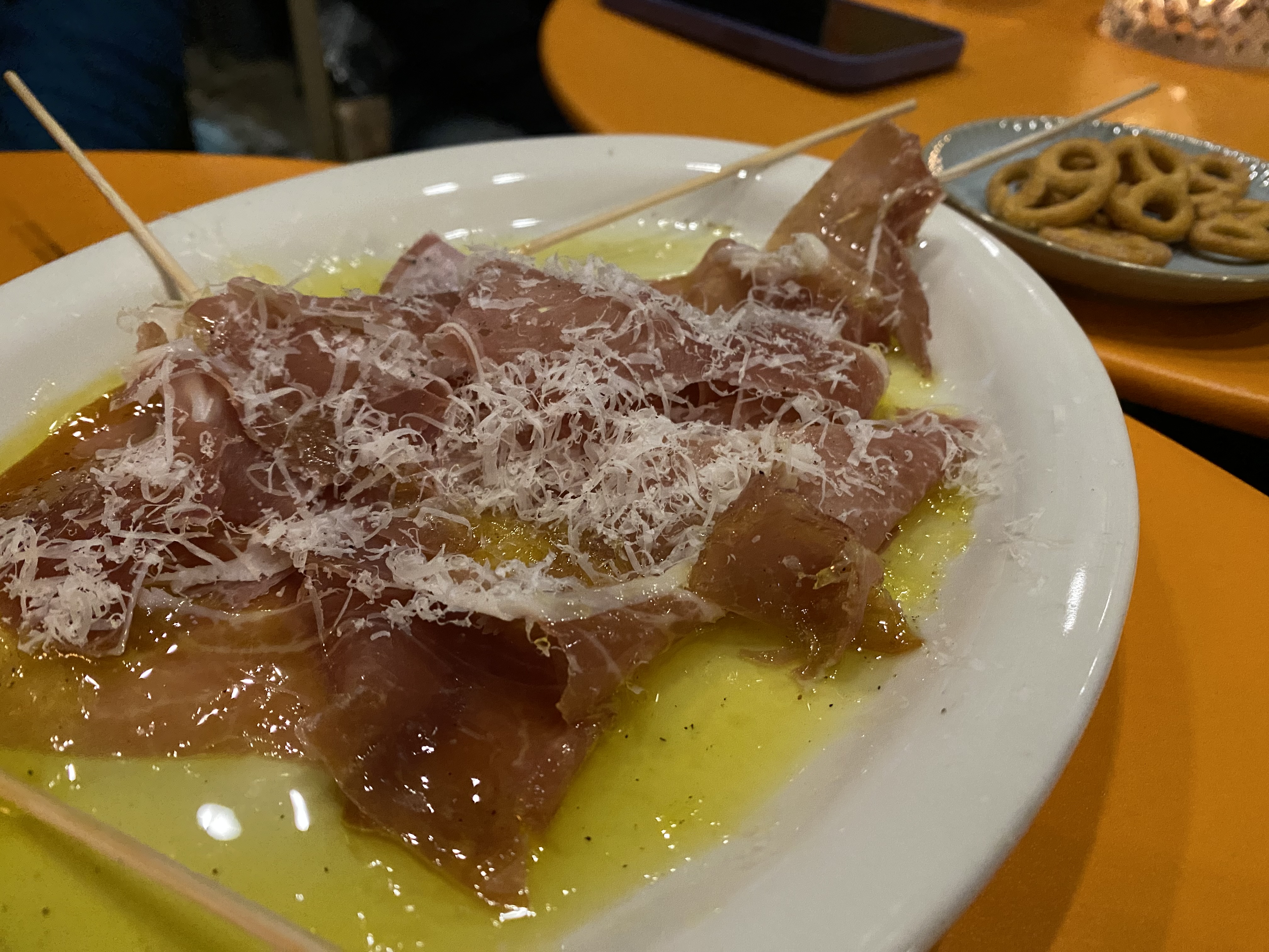 우리가 먹었던 안주. 올리브유에 얇게 썬 고기를 넣은 음식입니다. 호불호가 있었는데 저는 좋았습니다. 아마도 올리브유를 좋아하는 분이라면 괜찮을 것 같습니다.