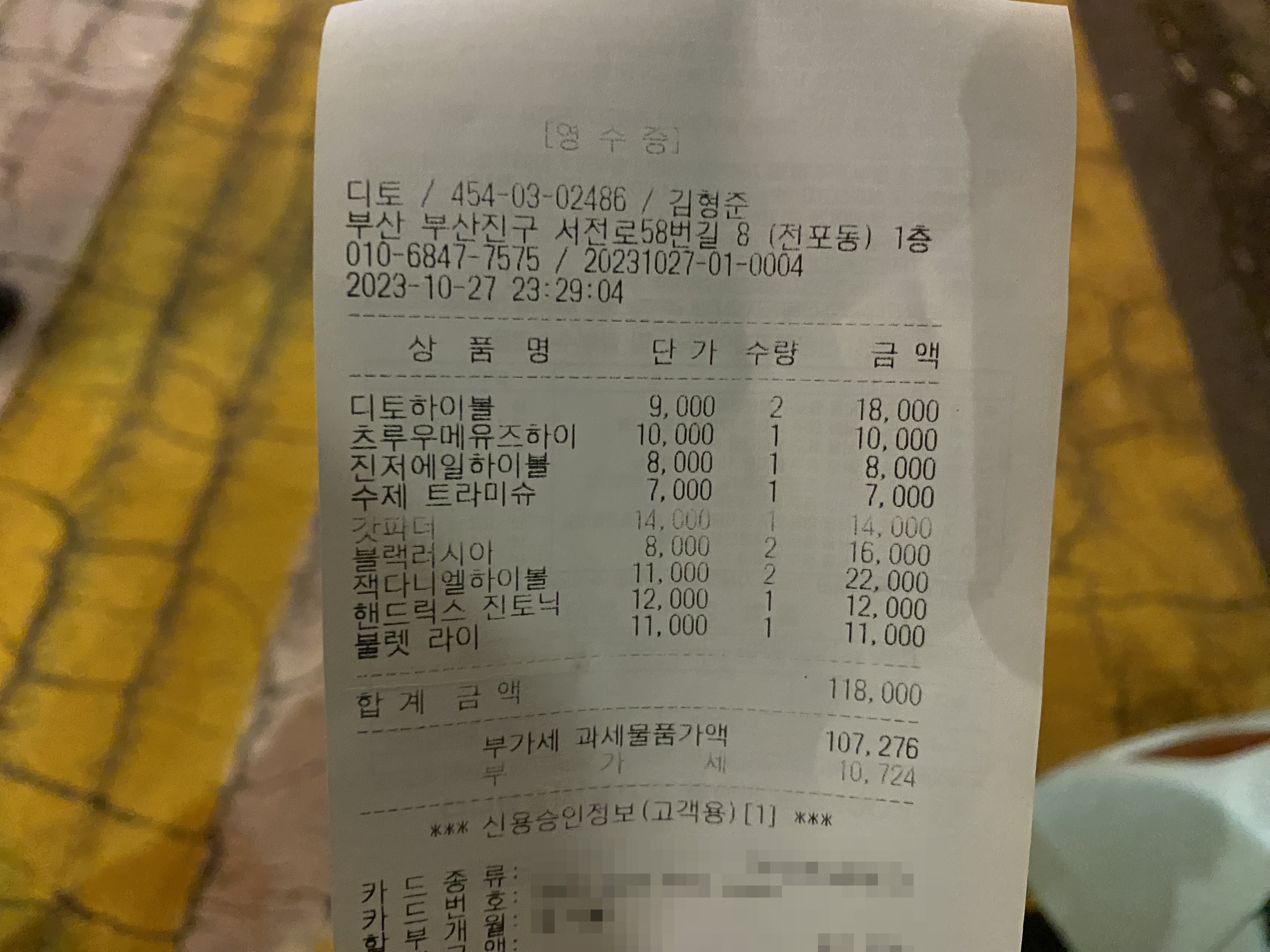 이런저런 술을 많이 마셔서 돈이 아주 많이 나왔을 거라 생각했는데 영수증을 보니 예상한 것보다 적게 나온 것 같아 만족스럽습니다. 위스키바에서 4명이 이 정도 가격이면 선방했다고 생각합니다.