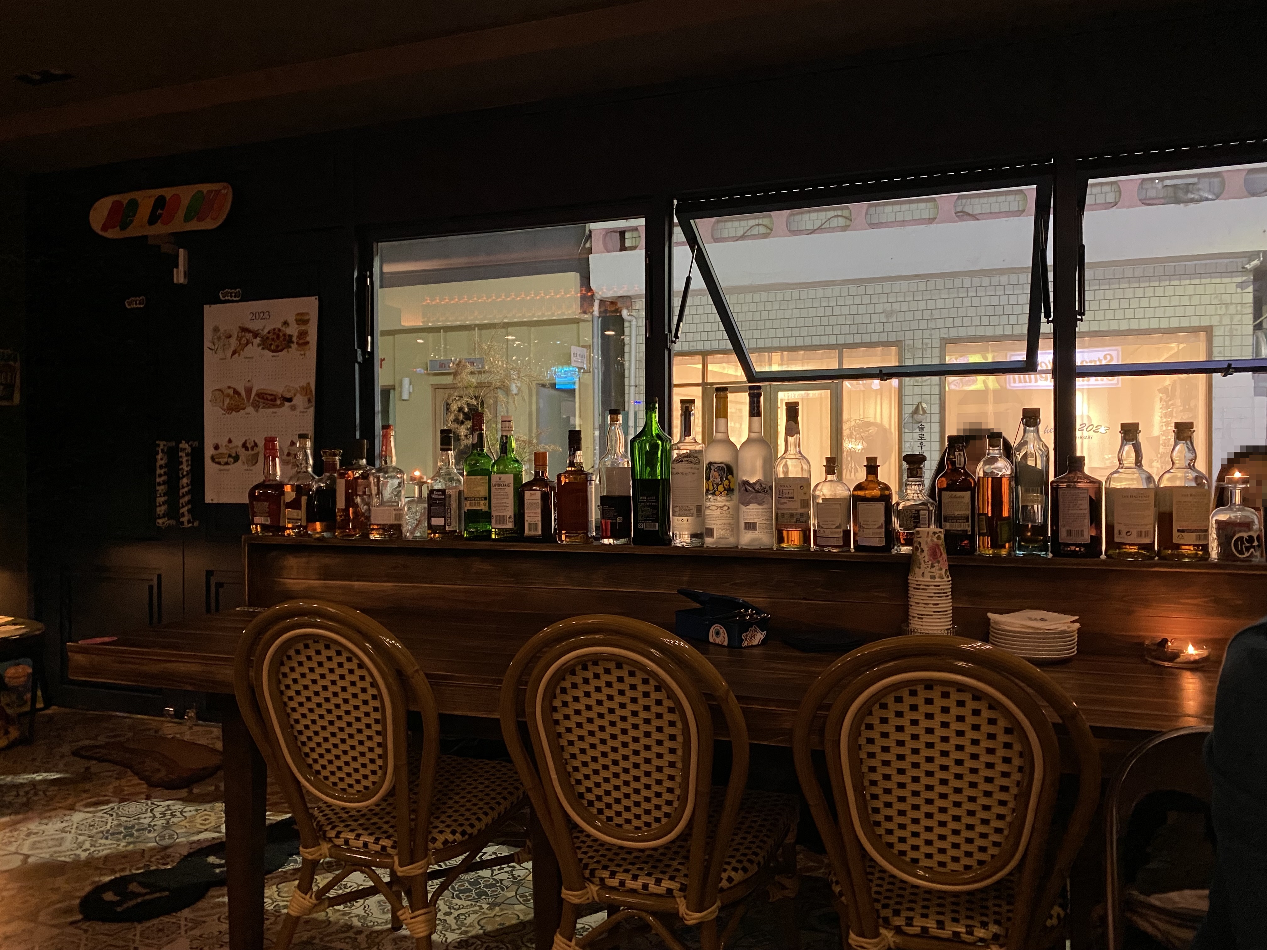 술을 일렬로 나열한 테이블이 인상적이네요. 평소 못 보던 희귀 술들도 보입니다. 매장 안이 넓지는 않지만 그렇다고 아주 좁지도 않은 사이즈입니다. 배경으로 깔리는 음악도 나쁘지 않았습니다.