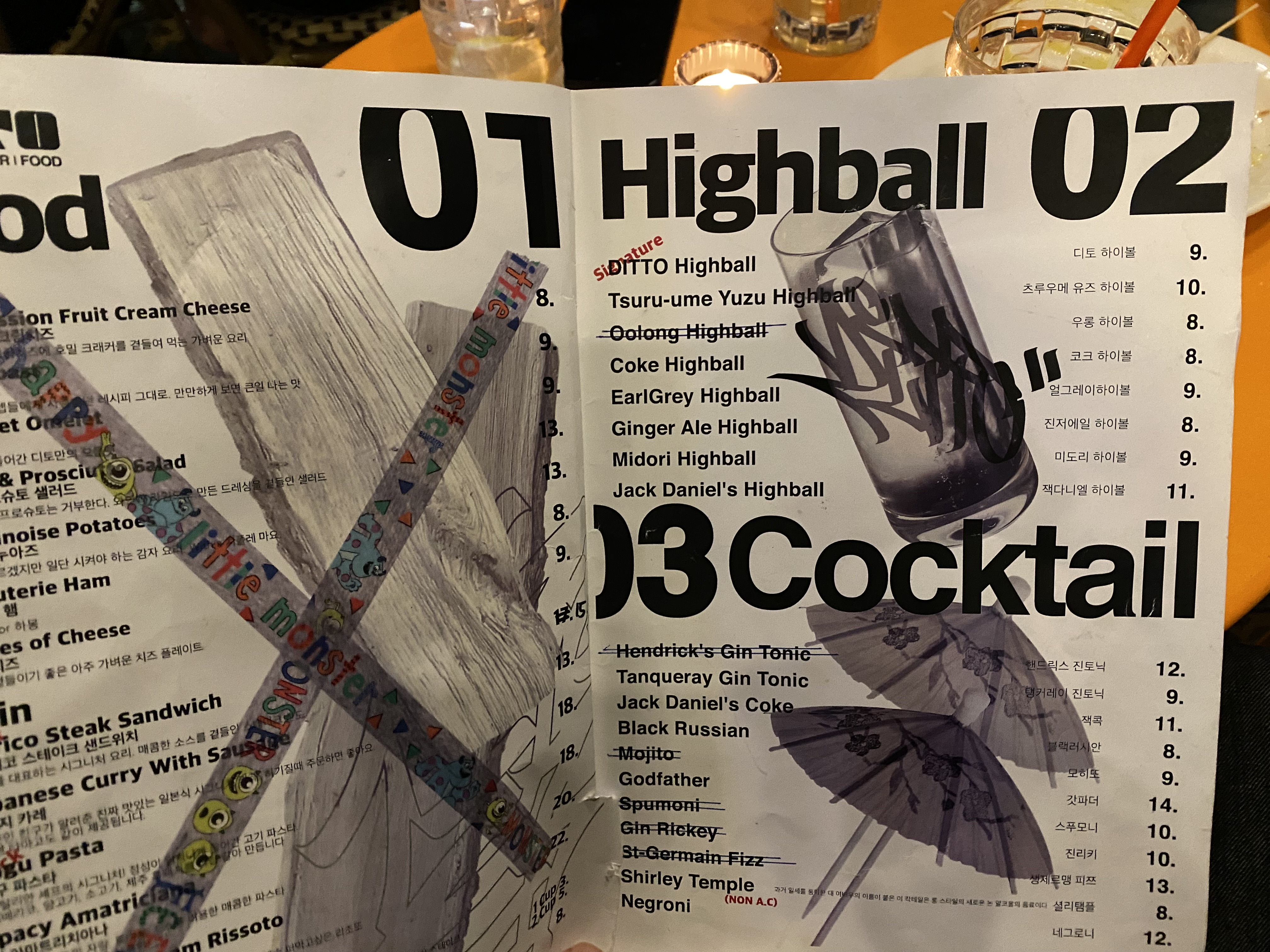 디토 DITTO 하이볼 메뉴판입니다. 여기서 디토 하이볼, 츠루우메 유즈 하이볼, 잭다니엘 하이볼, 진저에일 하이볼을 마셨습니다. 단맛을 좋아하는 분이라면 유자맛이 나는 츠루우메 유즈 하이볼을 추천합니다. 참고만.
