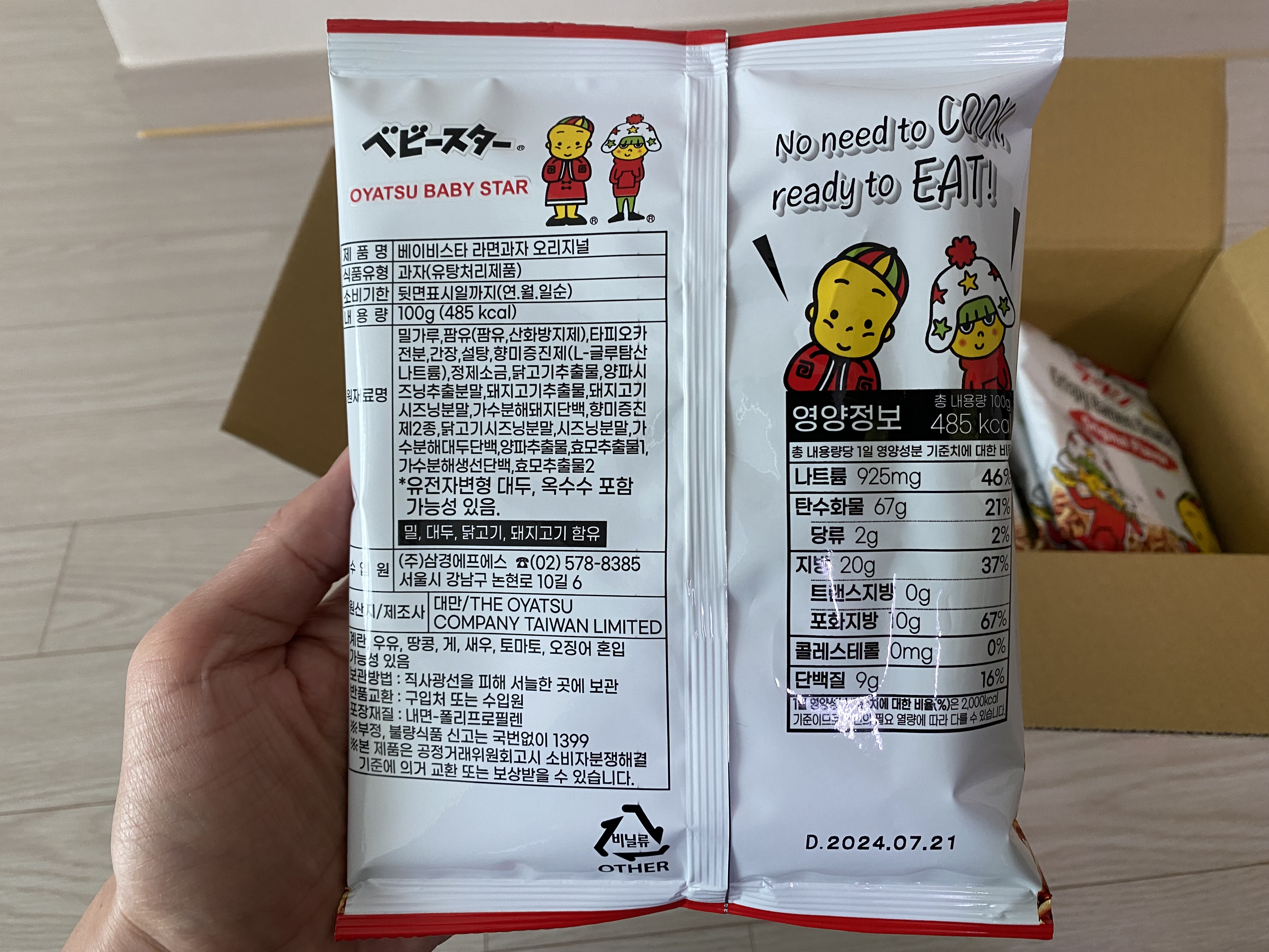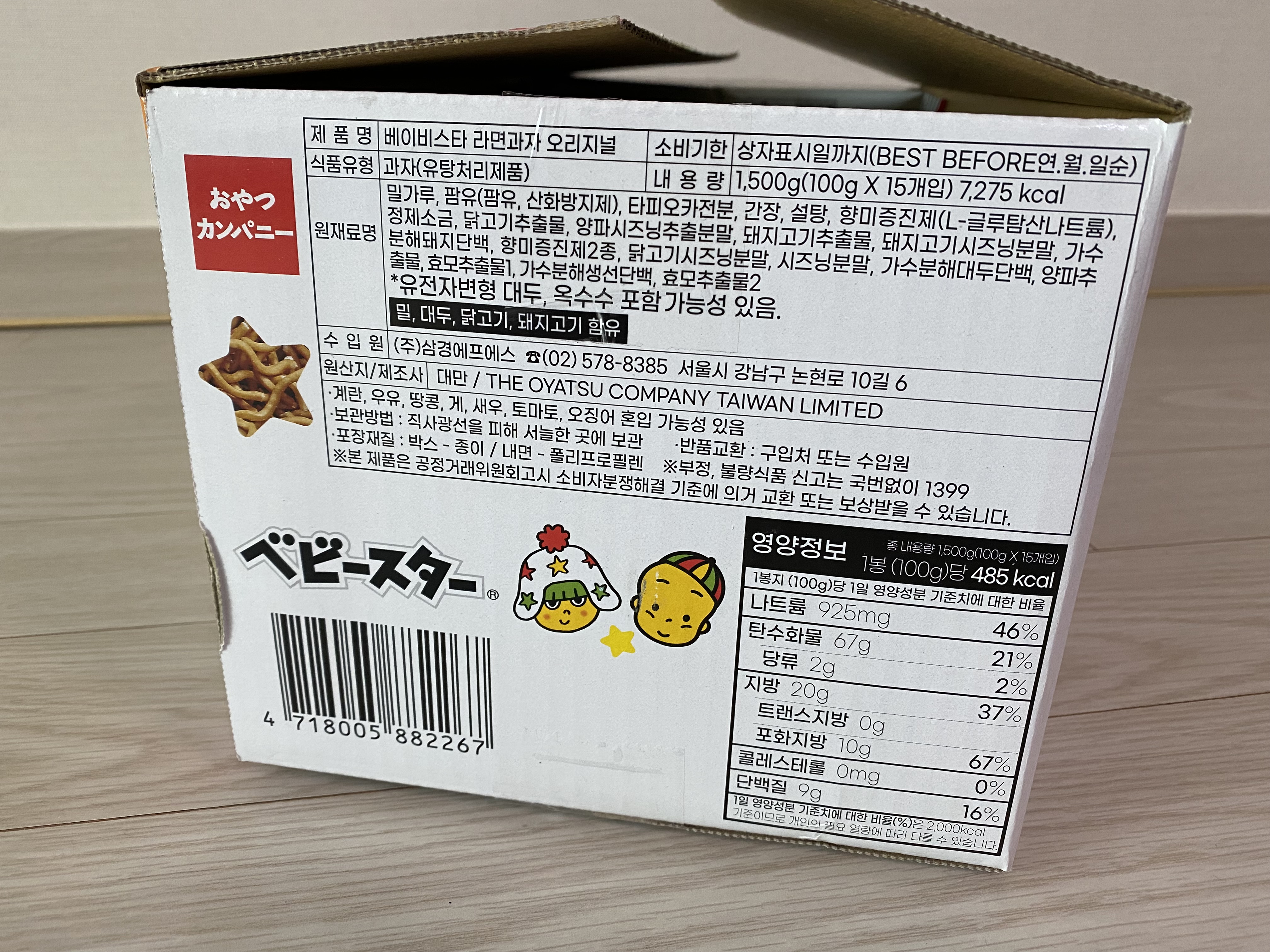 베이비스타 라면스낵에 일본 글자가 있어서 일본과자로 알고 있는데 박스에 보면 원산지는 대만으로 되어 있네요. 일본회사 제품을 대만에서 제조하는 것 같네요.