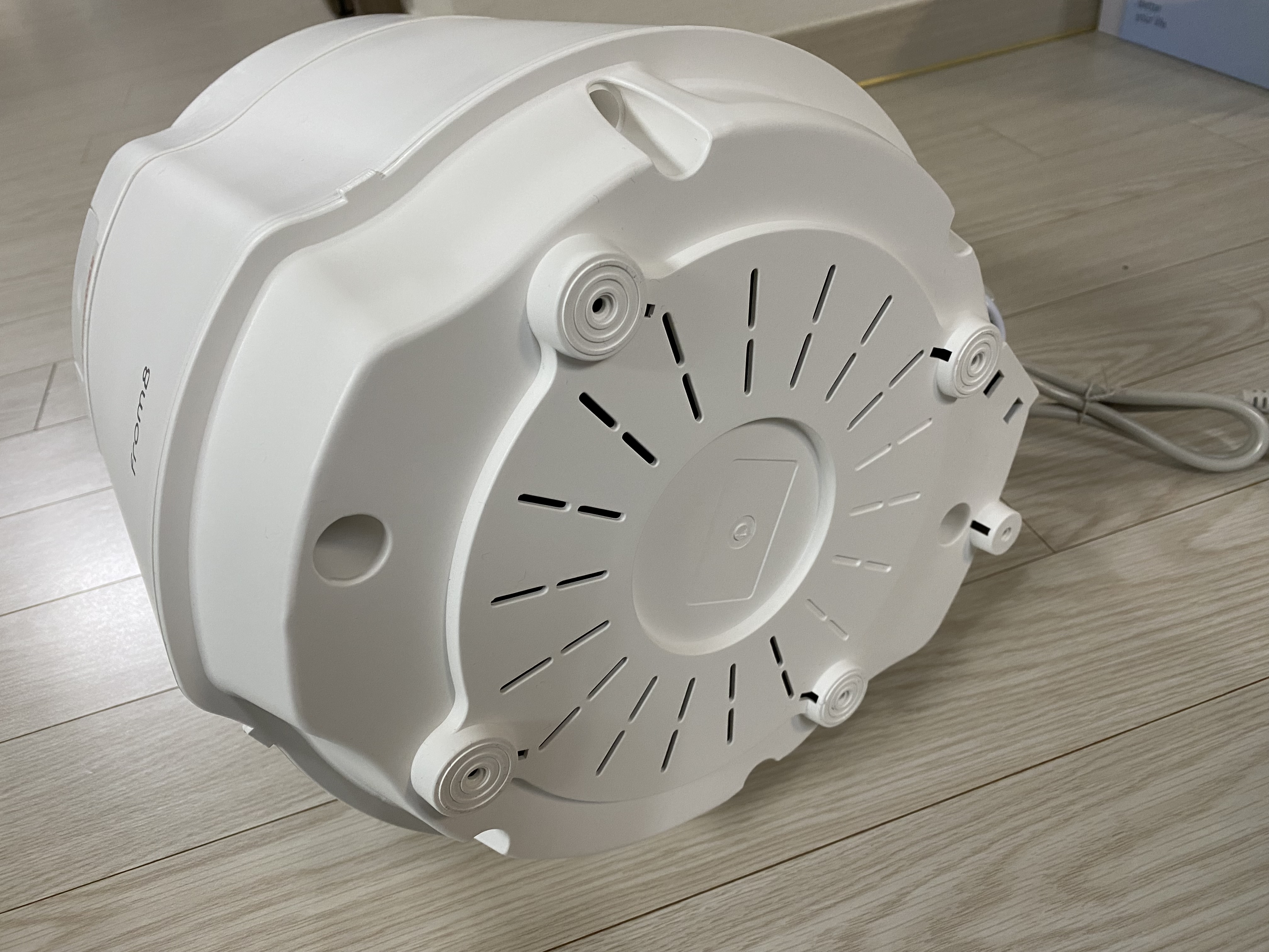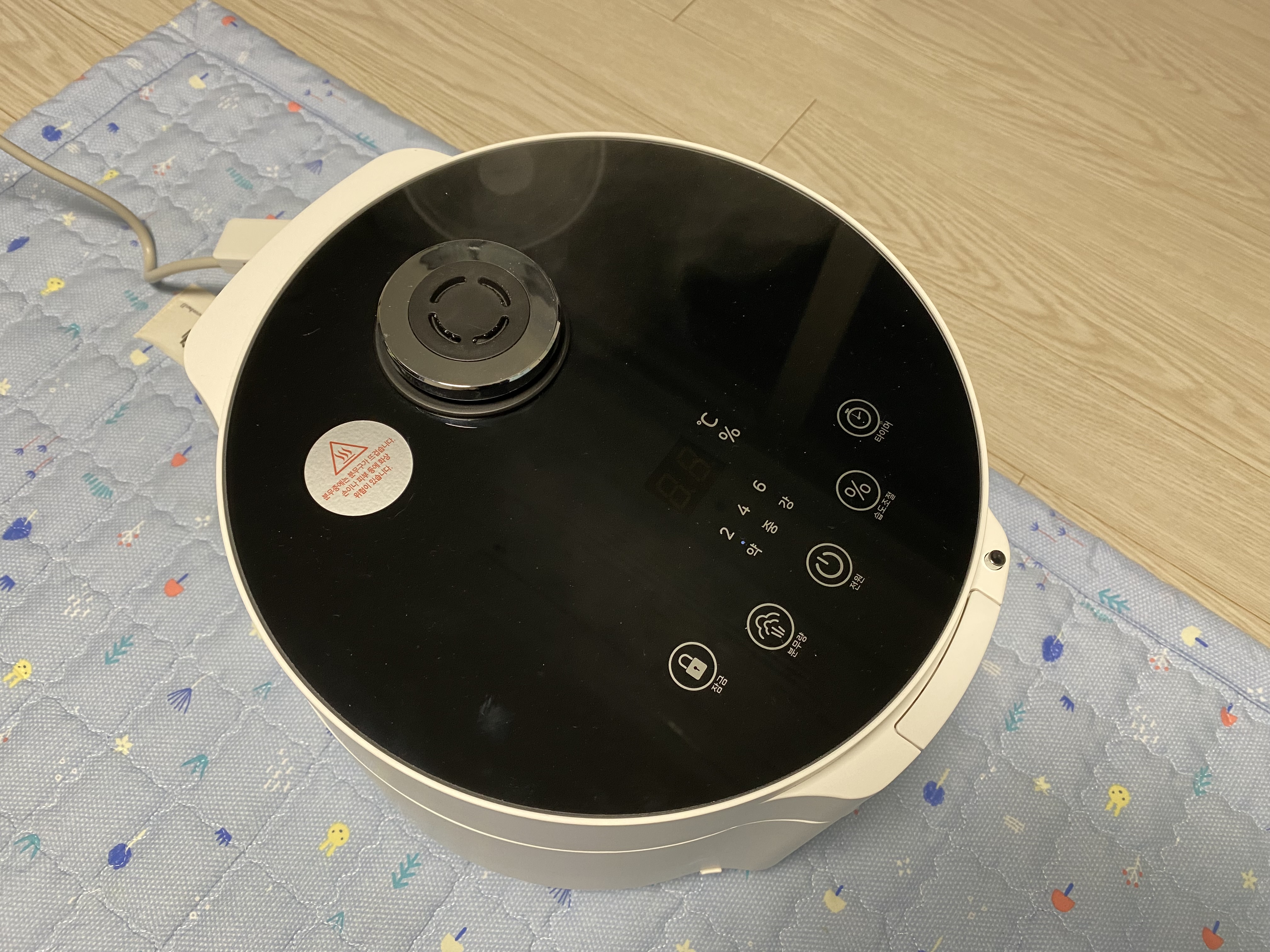 프롬비 가열식 가습기에 물을 거의 MAX까지 넣고 뚜껑을 닫은 후 전원 케이블을 연결한 모습입니다.