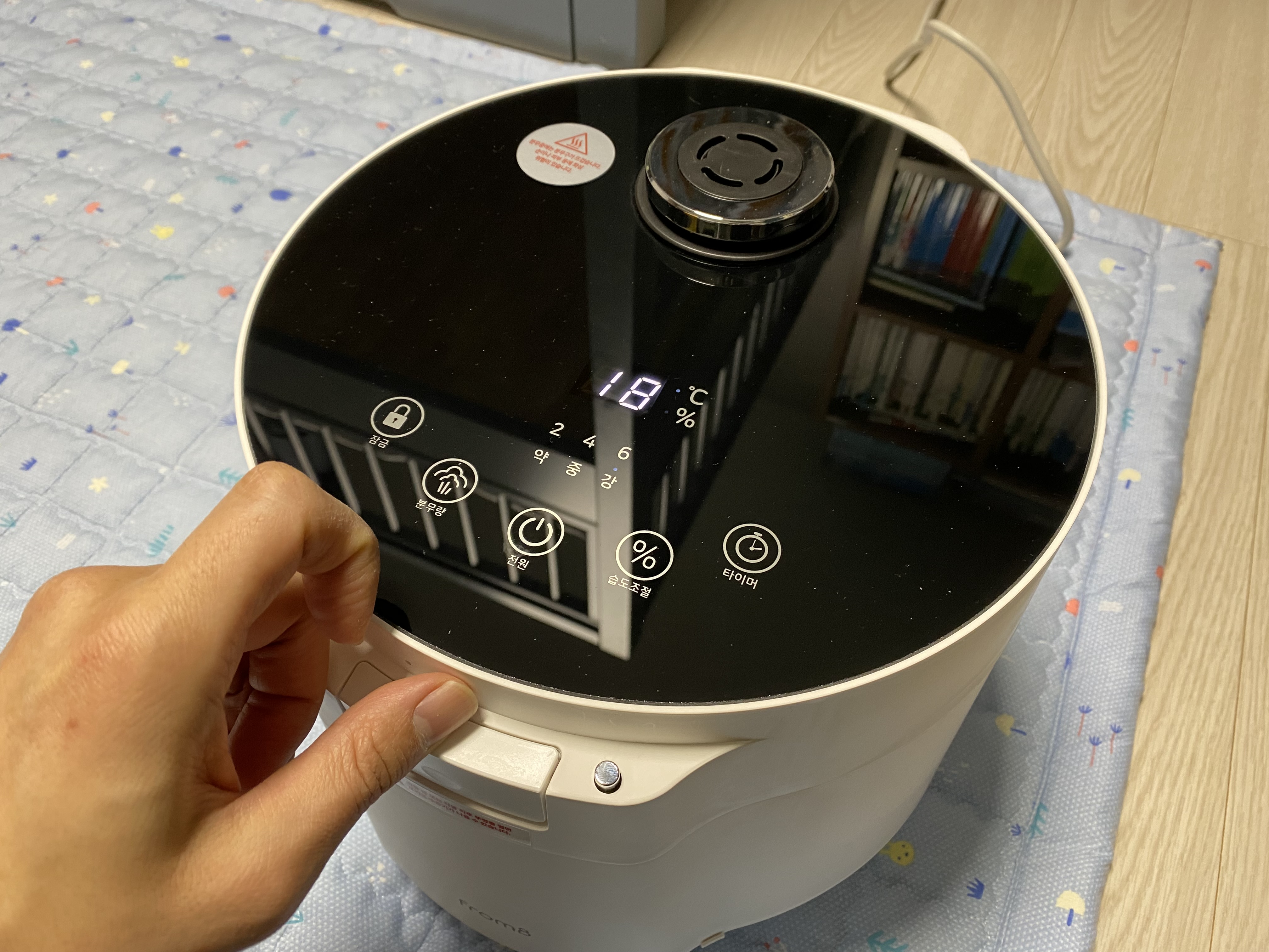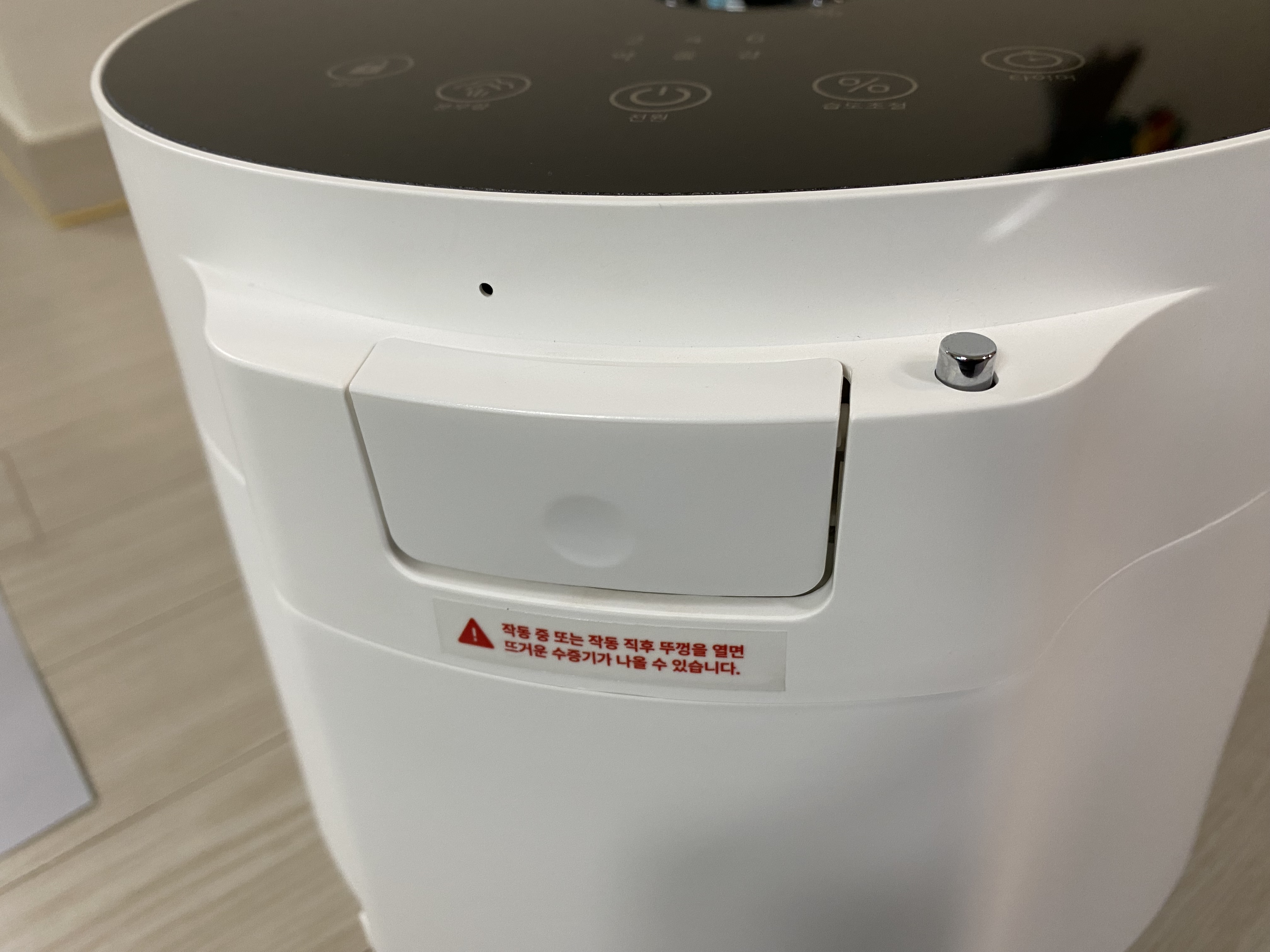 이 2개의 버튼을 동시에 눌러야 가습기 뚜껑을 열 수 있습니다. 가습기 물이 뜨거울 때 열면 다칠 수 있어서 이렇게 이중 잠금을 사용합니다. 아이들이 실수로 여는 경우는 없을 것 같습니다. 고의로 열면 어쩔 수 없지만...
