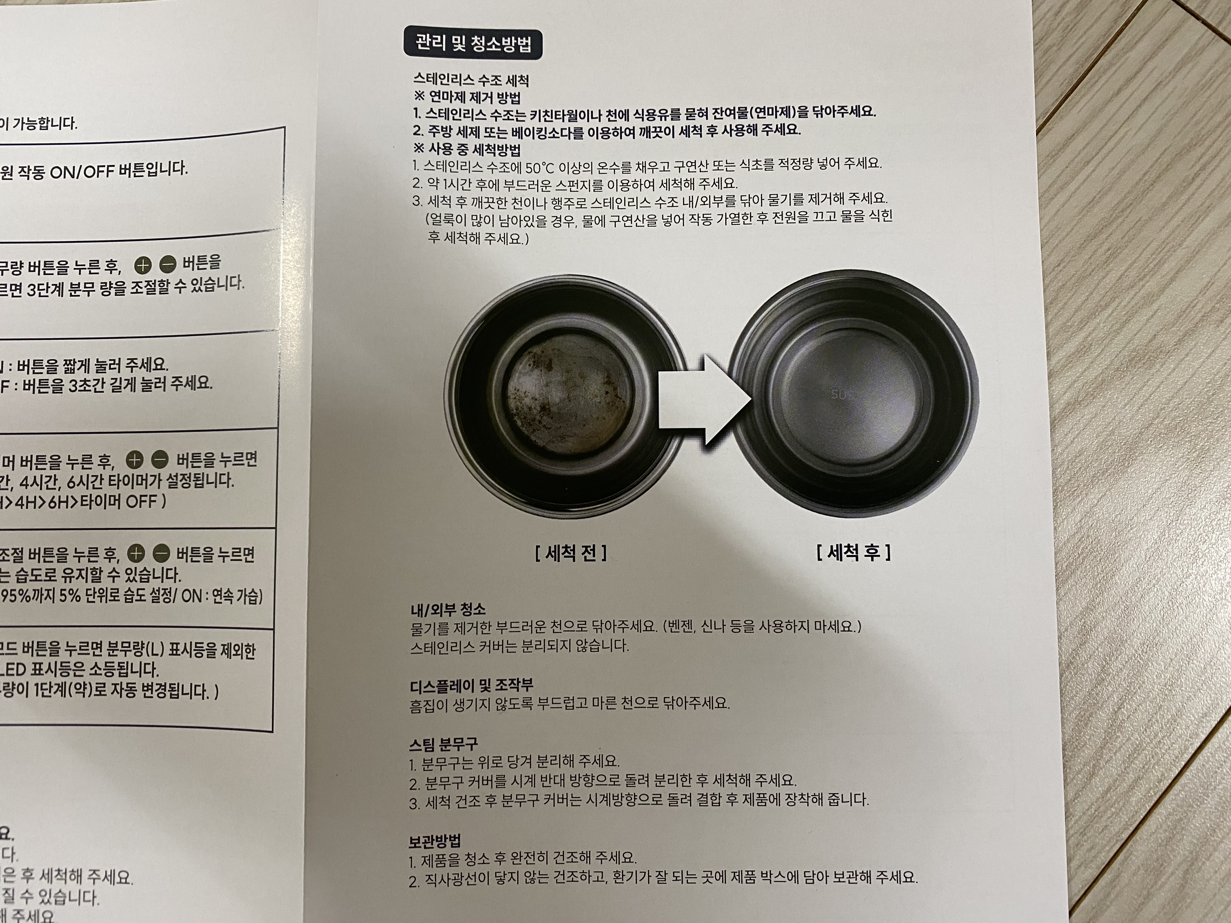 관리 및 청소방법도 있습니다. 사용하기 전에 연마제를 제거하라고 나와있네요.