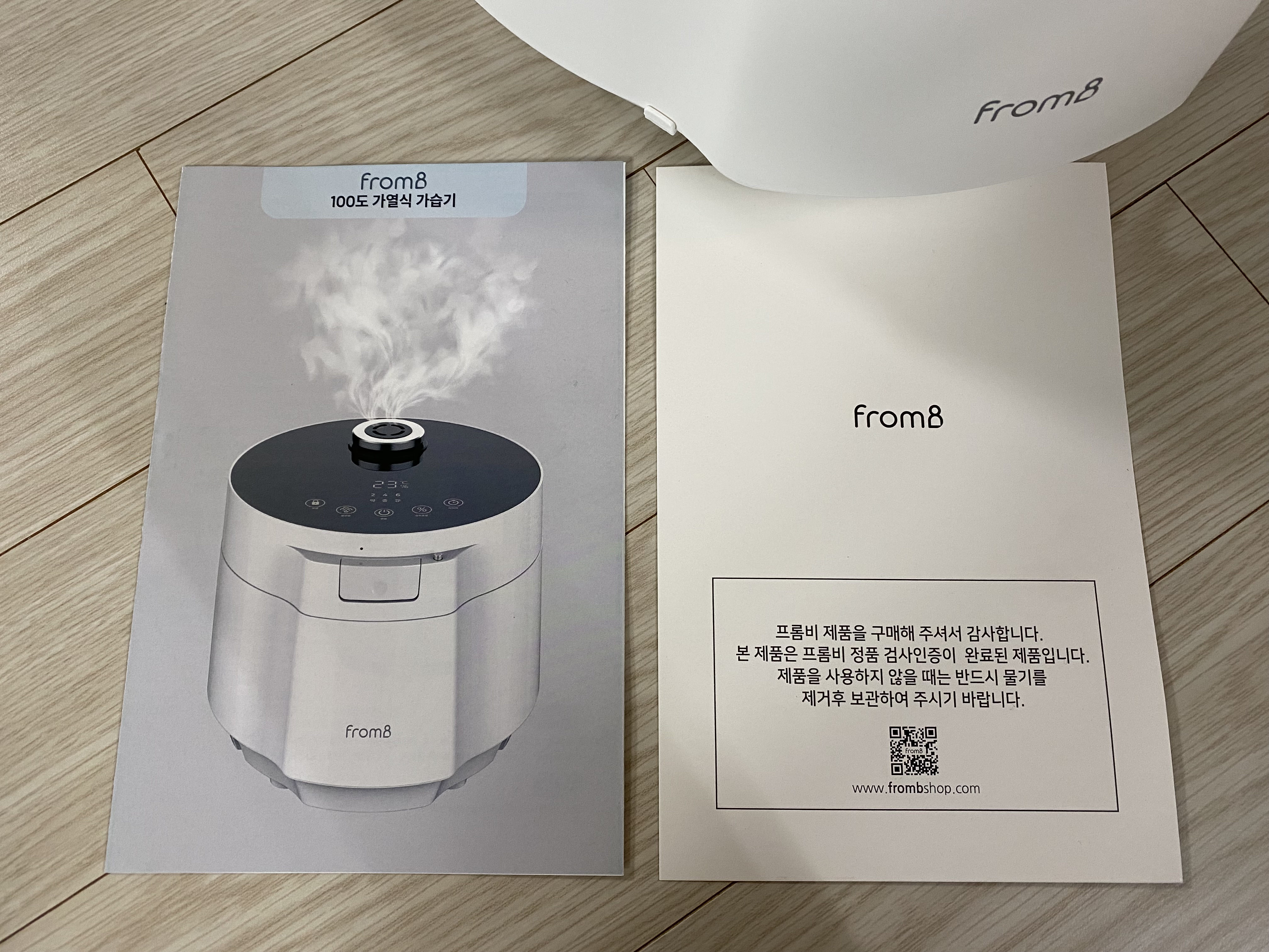 프롬비 가열식 가습기를 개봉한 모습입니다. 가습기와 설명서가 들어있어요.