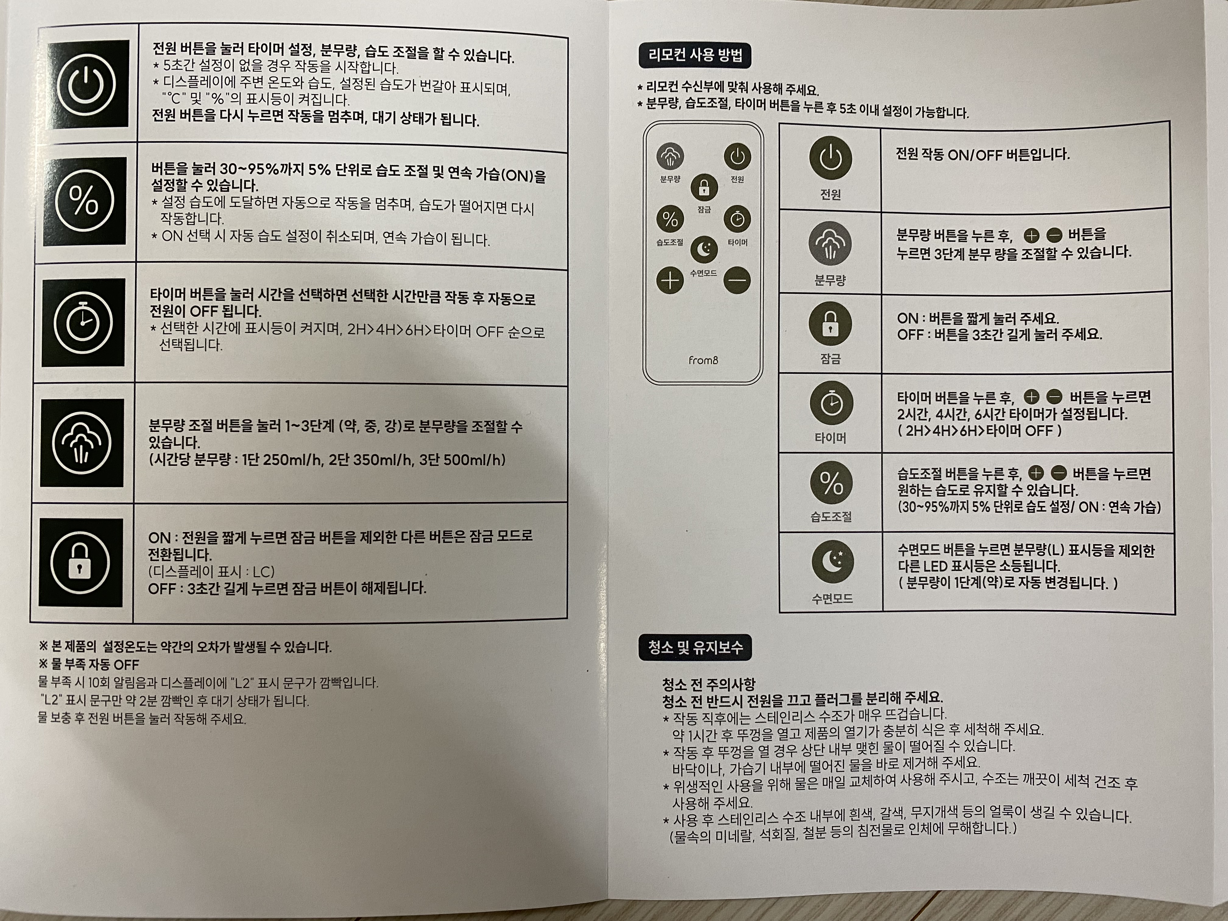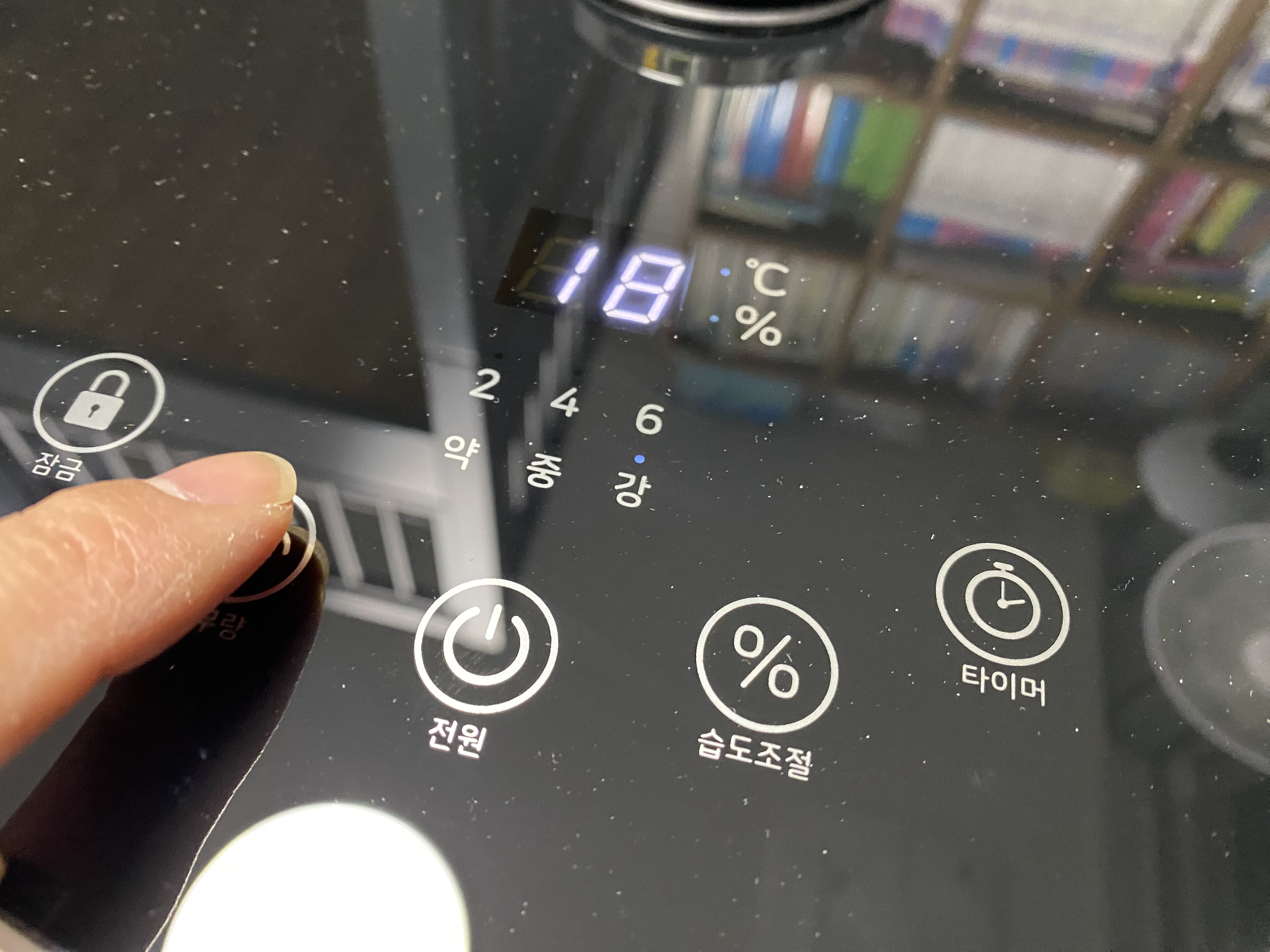 가동을 하고 한참을 기다려도 가습이 작동되지 않네요. 설명서를 보니 물이 MAX면 40분 정도 기다려야 한다고 합니다. 저는 커피포트 물 끓이는 속도를 생각해서 가열식 가습기도 금빵 끓어오를 줄 알았는데 그게 아니네요. 다음부터는 물을 적게 넣어야겠습니다. 참고로 물이 부족하면 알람이 울리면서 화면에 L2 표시가 난다고 하네요.