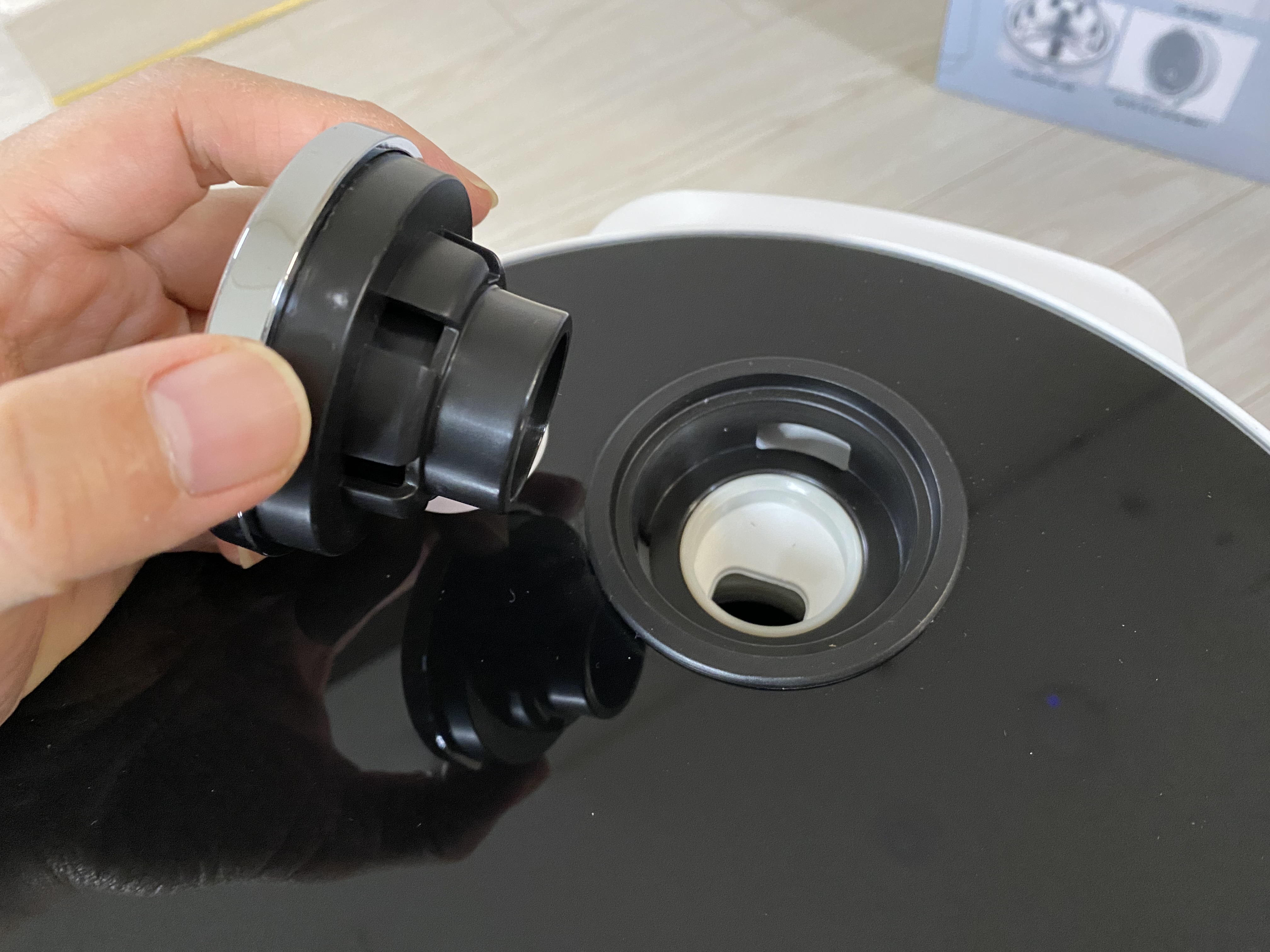 프롬비 가열식 가습기에 물을 거의 MAX까지 넣고 뚜껑을 닫은 후 전원 케이블을 연결한 모습입니다.
