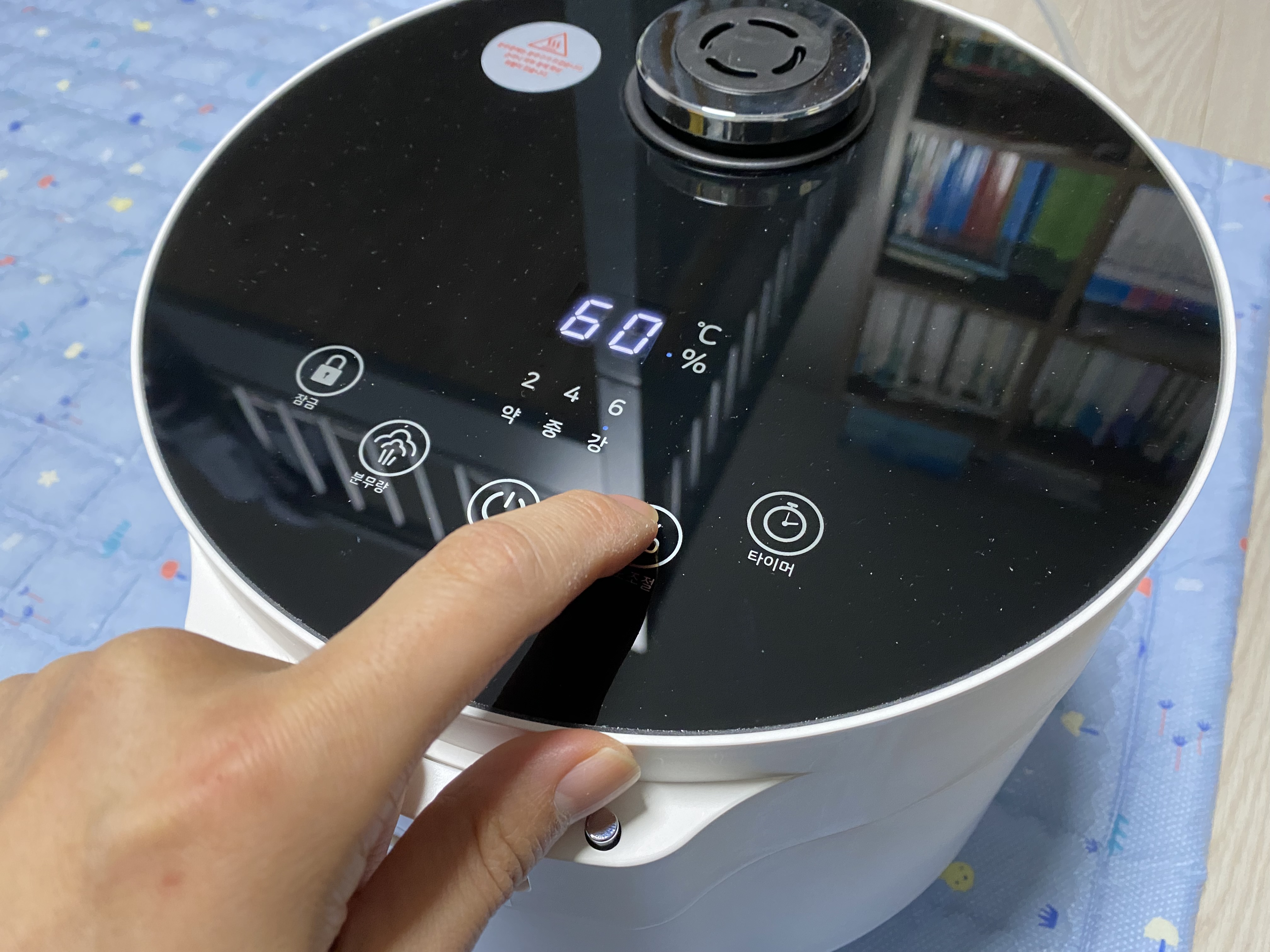 디자인은 심플해서 마음에 드는데 아주 고급스럽진 않습니다. 위쪽에는 정보를 표시해 주는 LED와 잠금, 분무량 조절, 전원, 습도조절, 타이머 버튼이 있습니다.