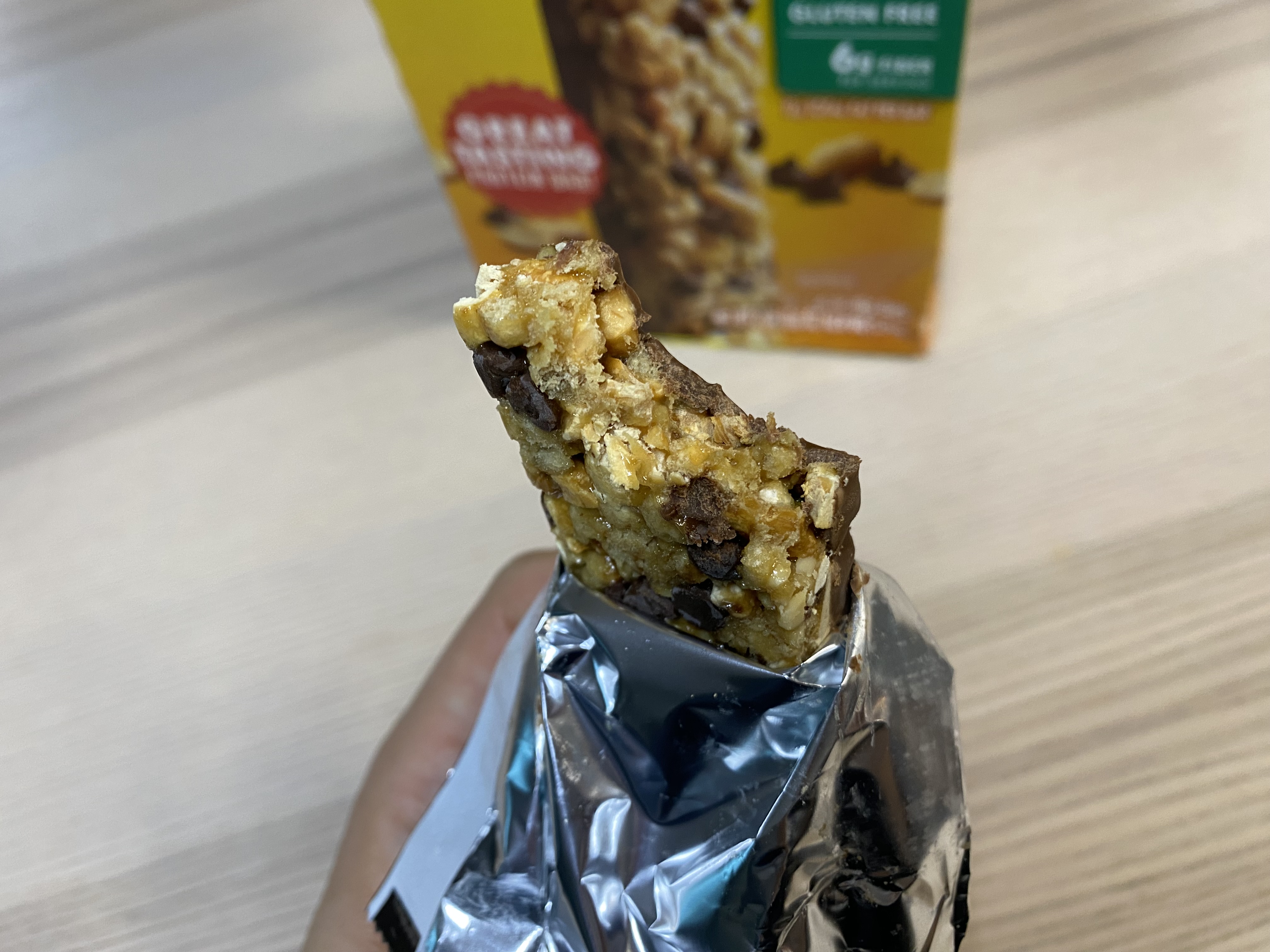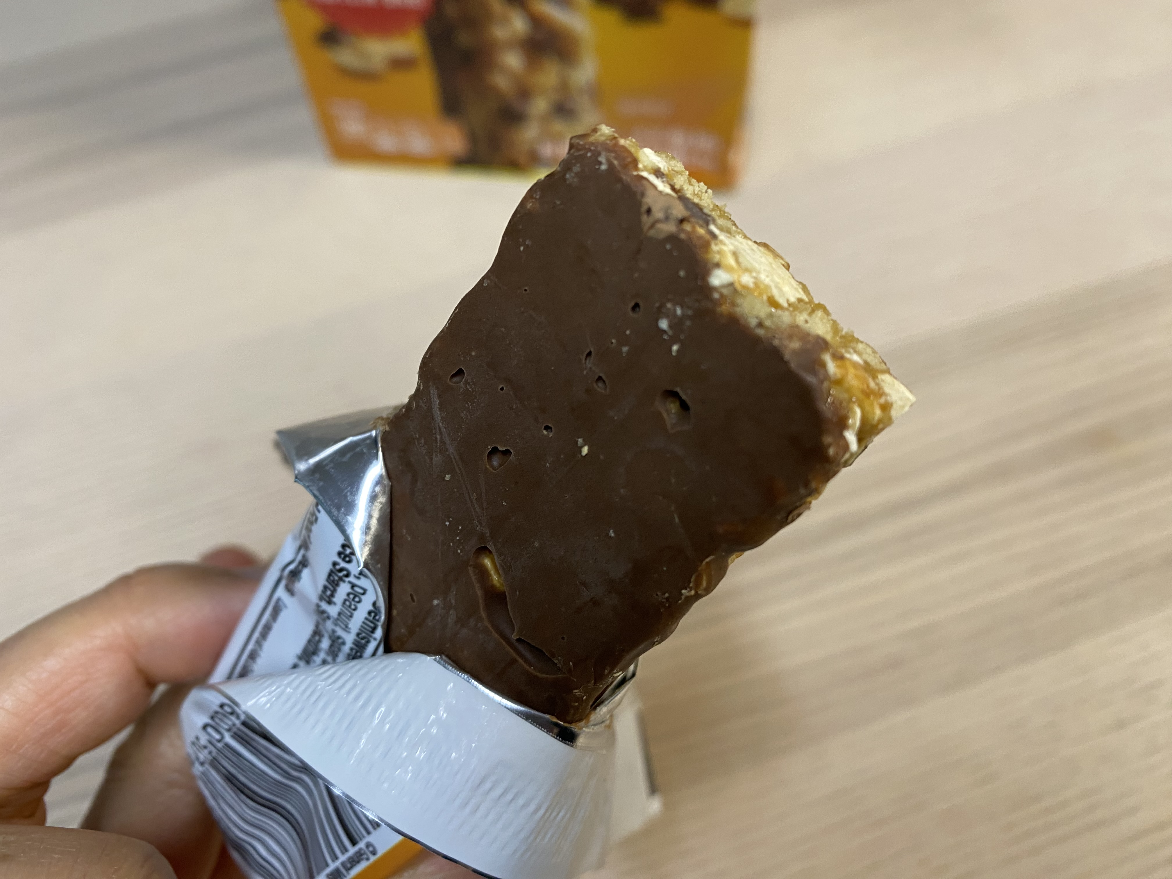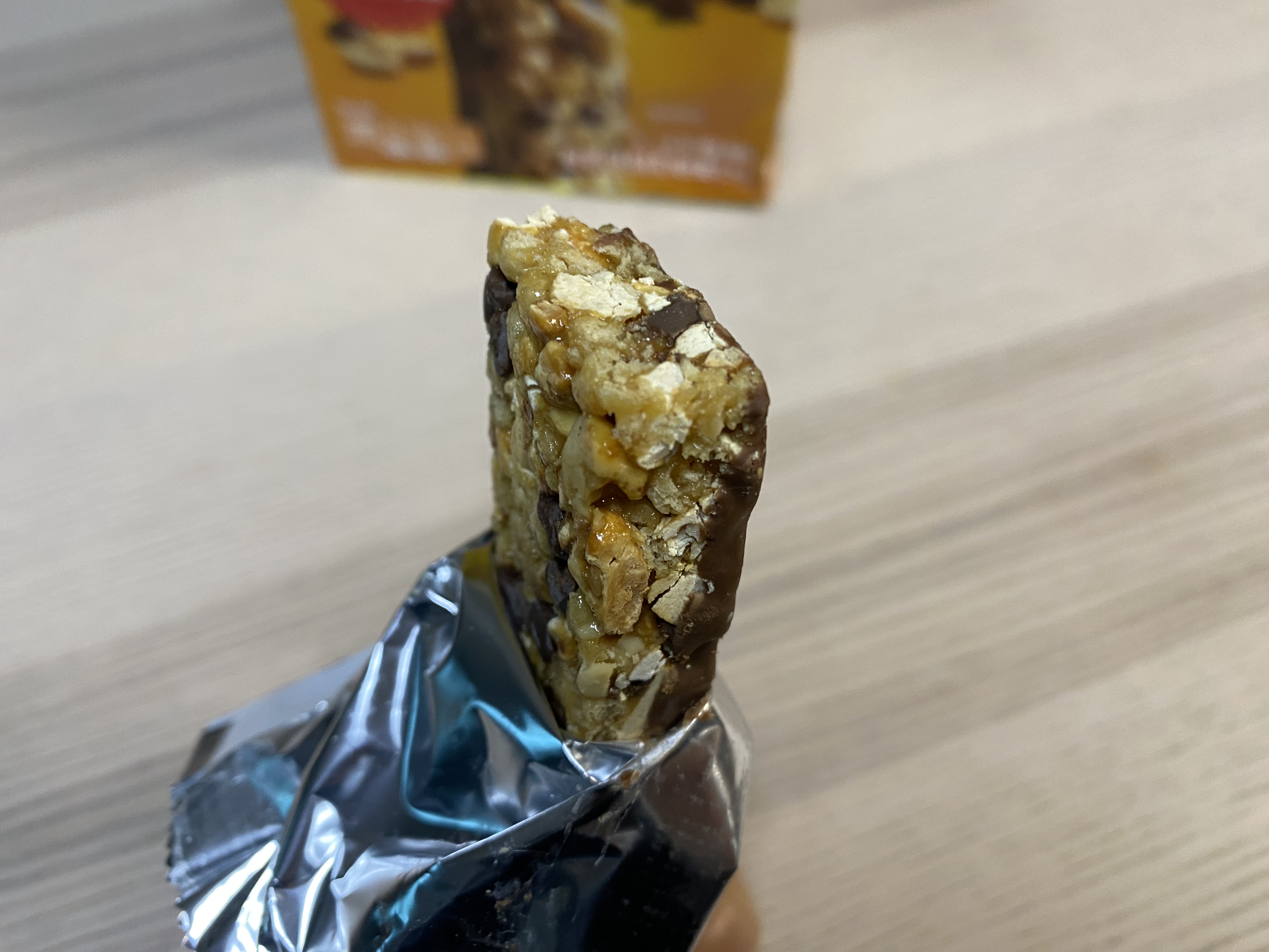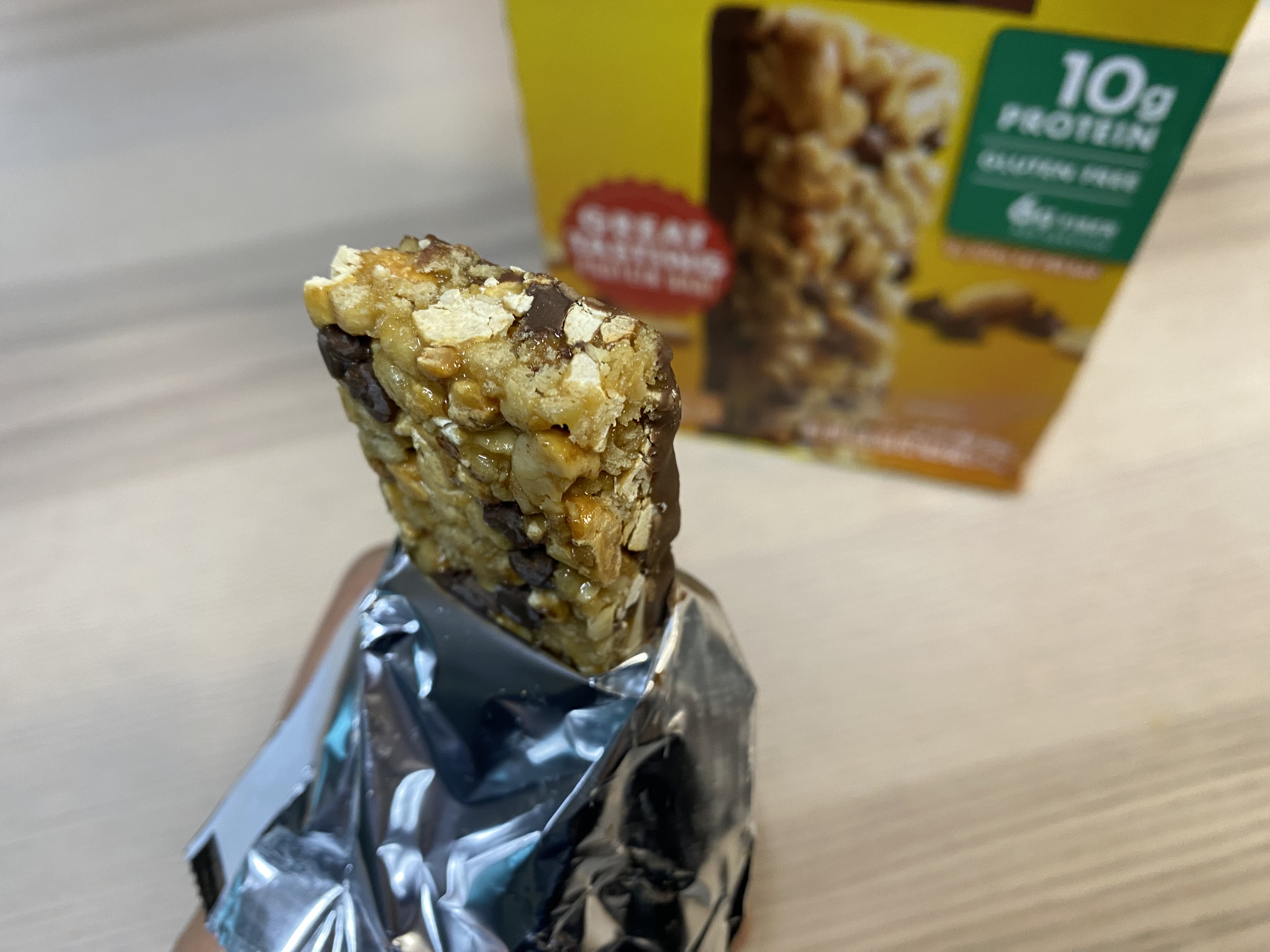 NATURE VALLEY 프로틴 바 봉지를 깐 모습. 역시 맛을 위해서는 초콜릿이 좀 들어가야...