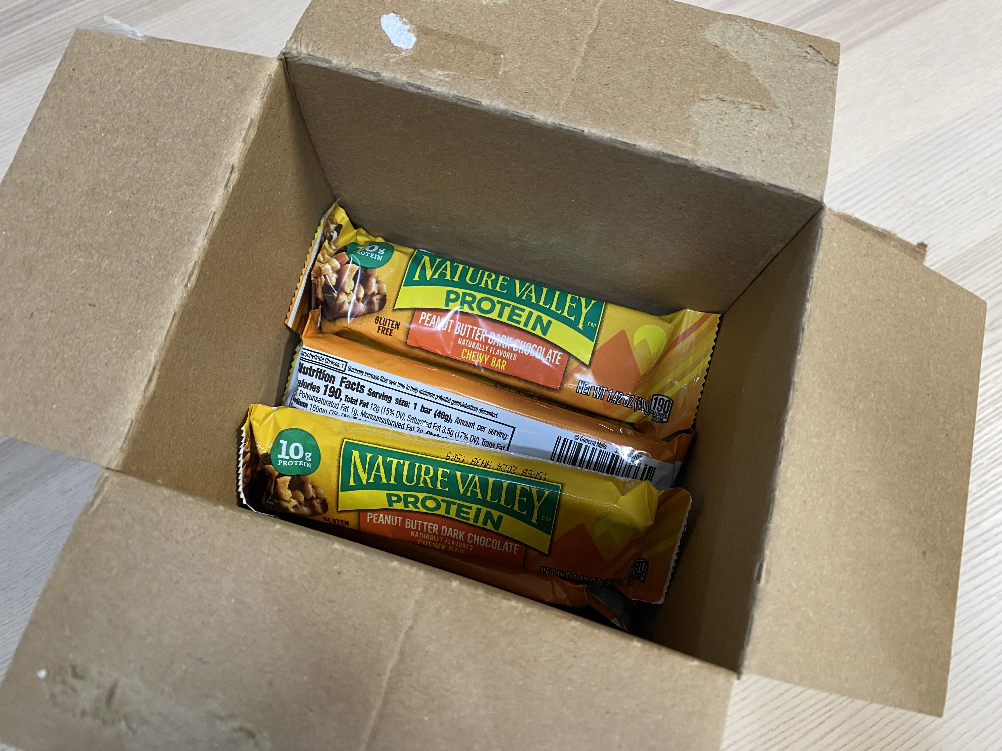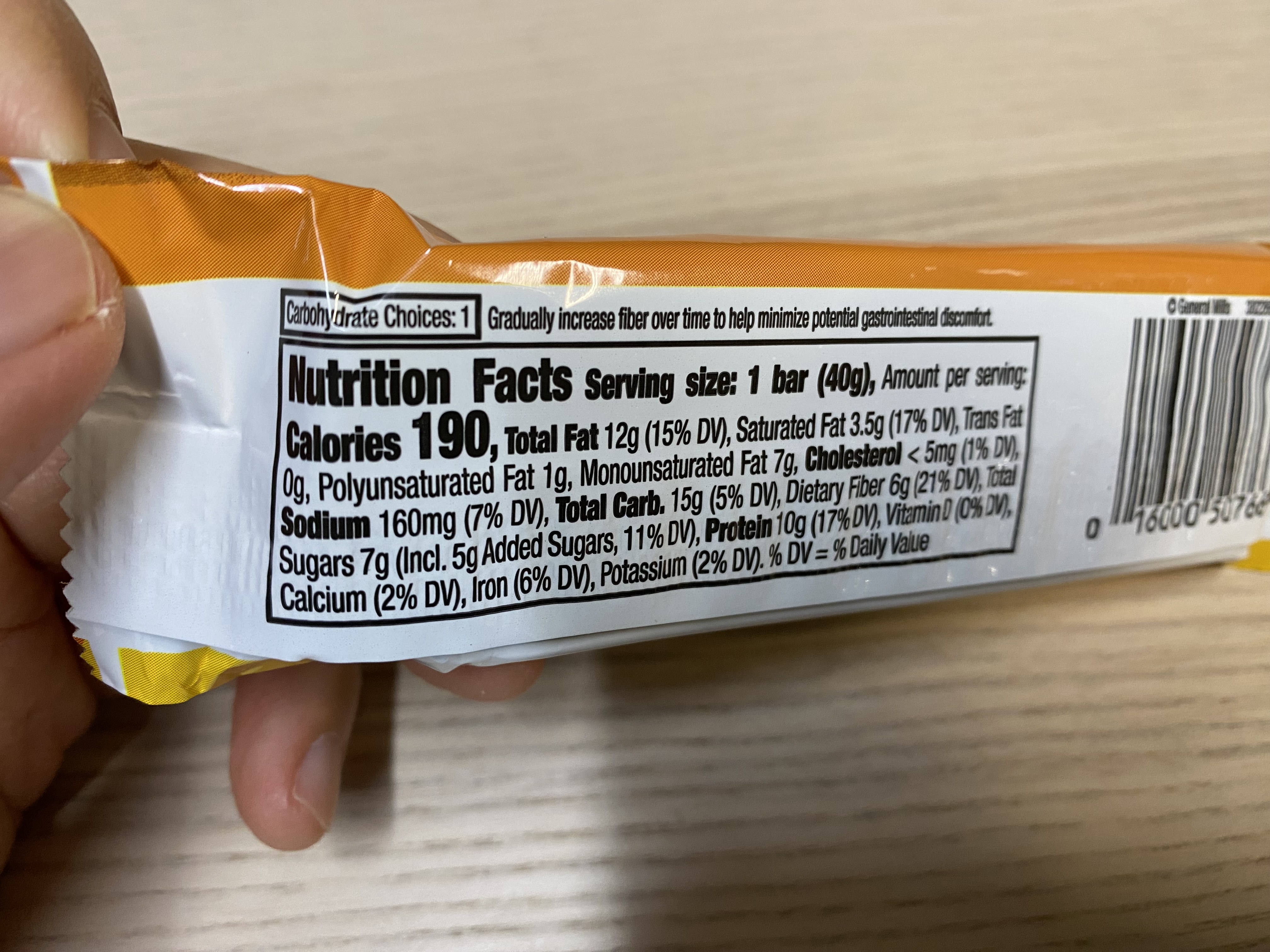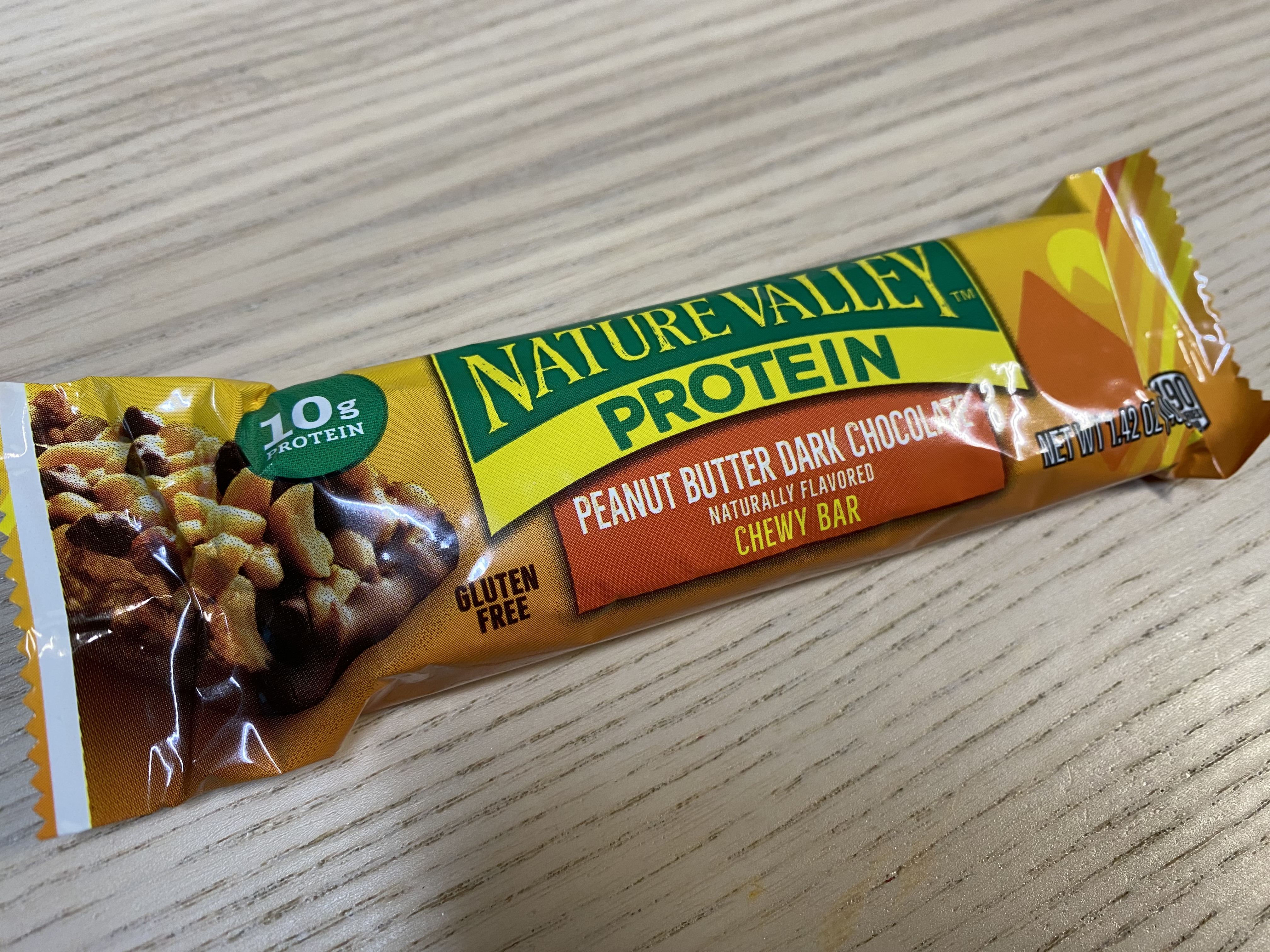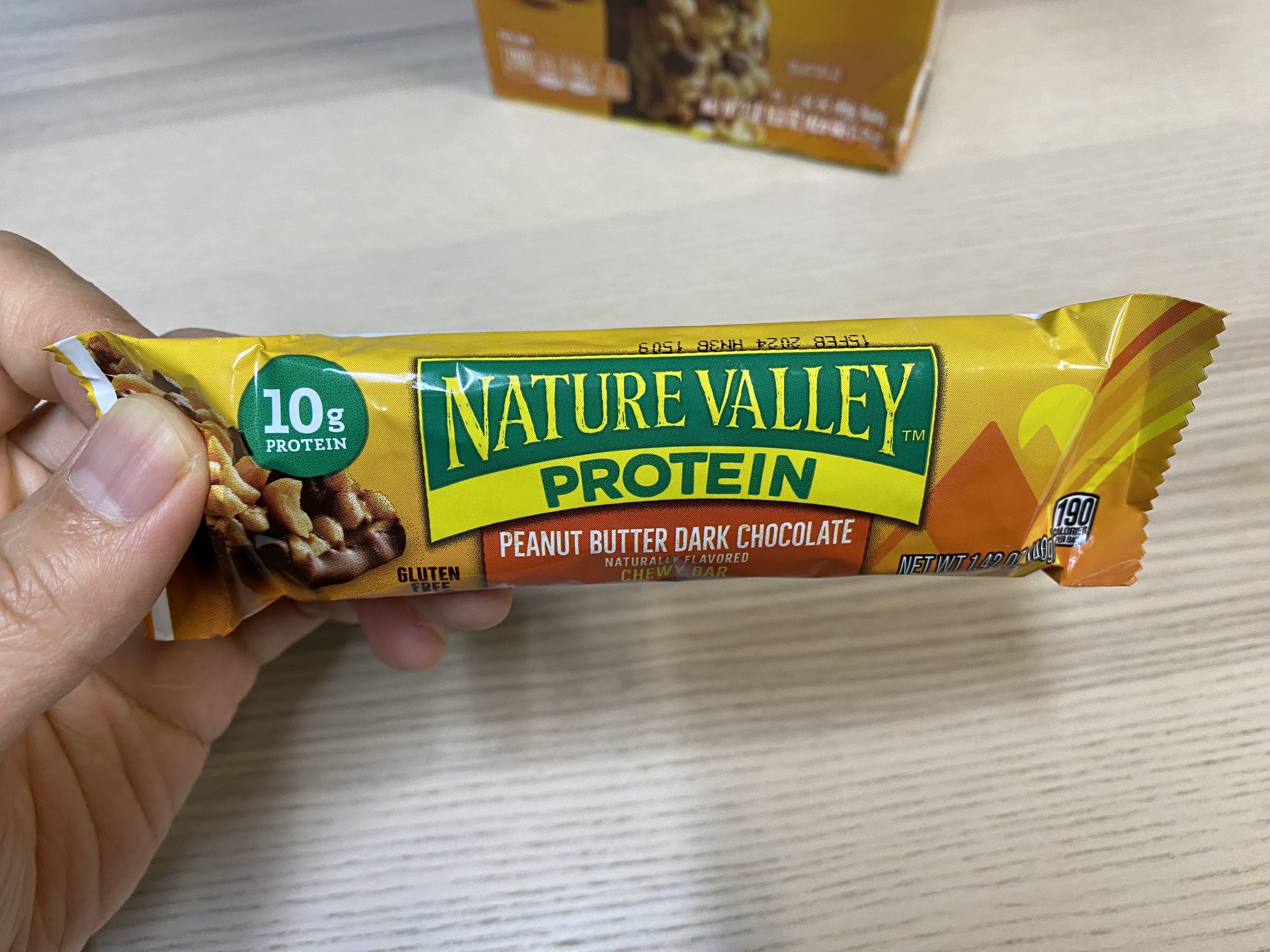 NATURE VALLEY 프로틴 바 봉지를 깐 모습. 역시 맛을 위해서는 초콜릿이 좀 들어가야...