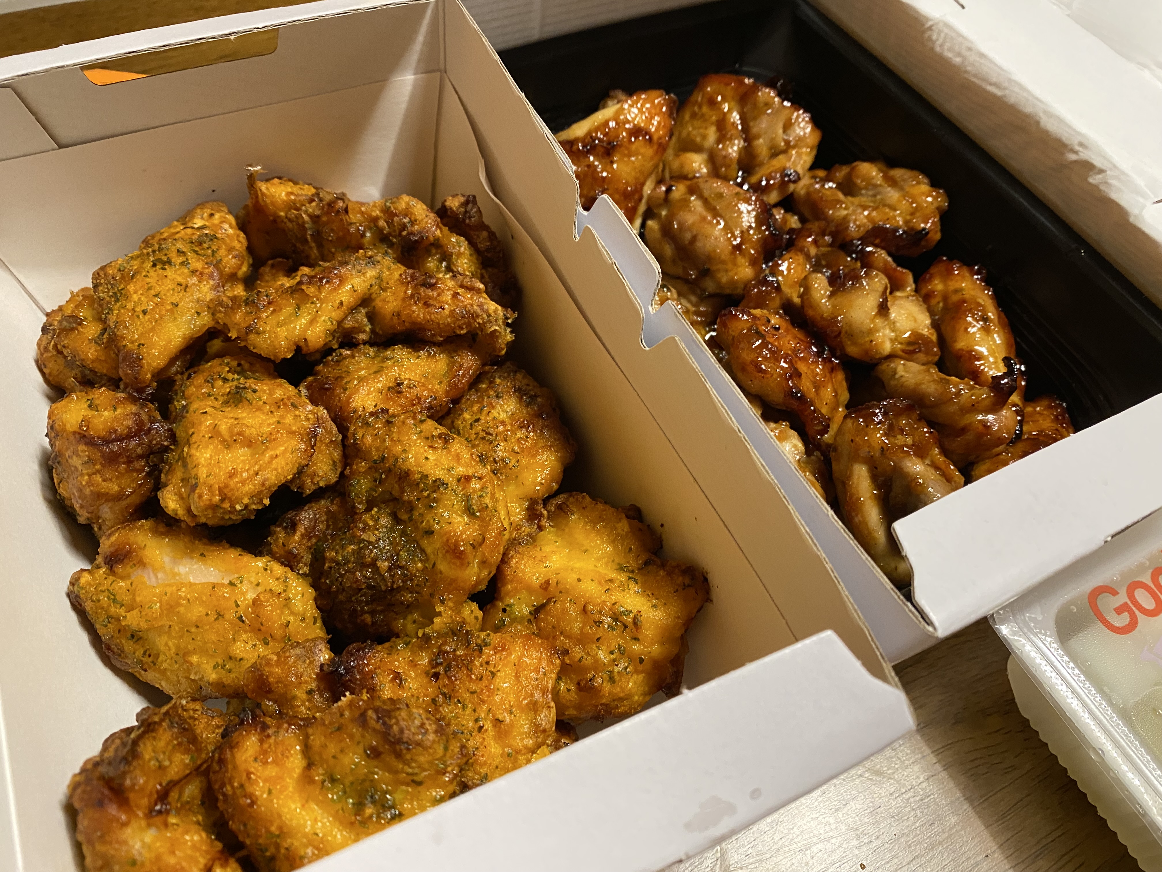드디어 굽네치킨 경주보문점 야외에 치킨을 펼쳤습니다. 오리지널과 고추바사삭.