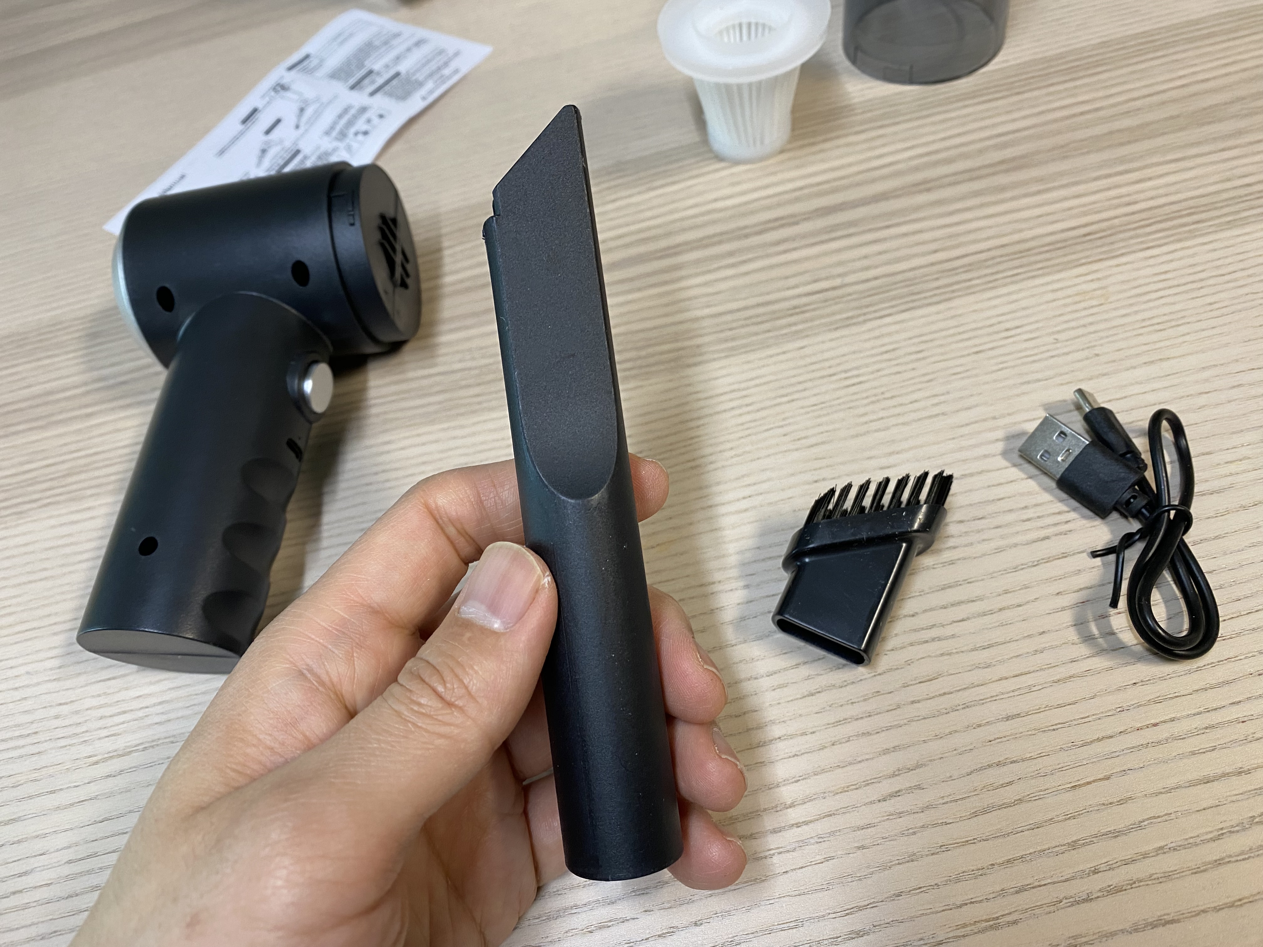 청소기 본체와 먼지통, 노즐, 브러쉬, 충전 케이블, 설명서가 들어있습니다. 제가 구매한 이 청소기는 제품 구성이 다른 제품보다는 적은 것 같네요. 그래서 저렴한 것 같습니다. 필요한 노즐과 브러쉬 등이 있는지 잘 보고 구매하세요. 저는 저렴해서 대충 구매를 했는데 이 정도로도 충분한 것 같습니다.