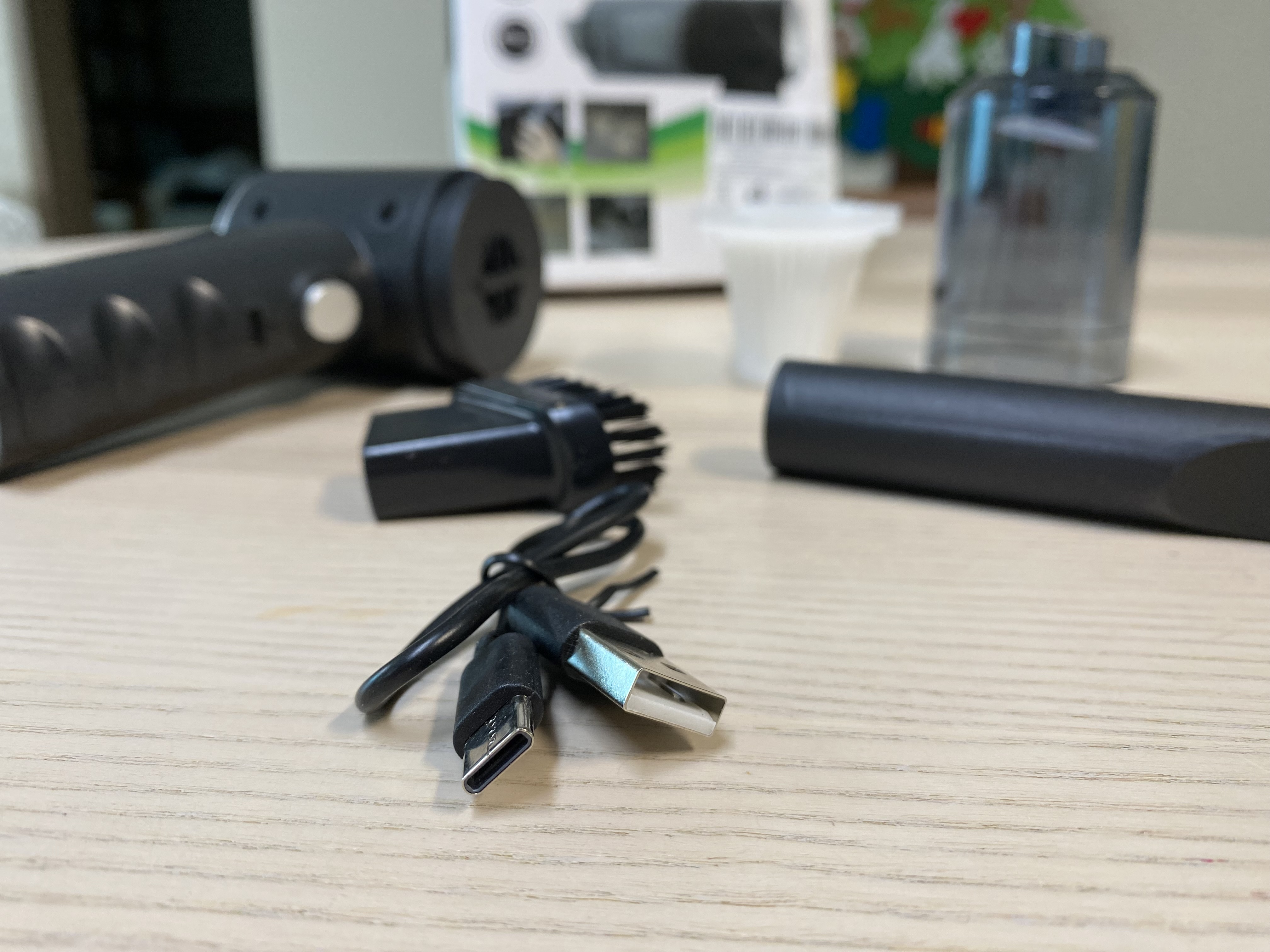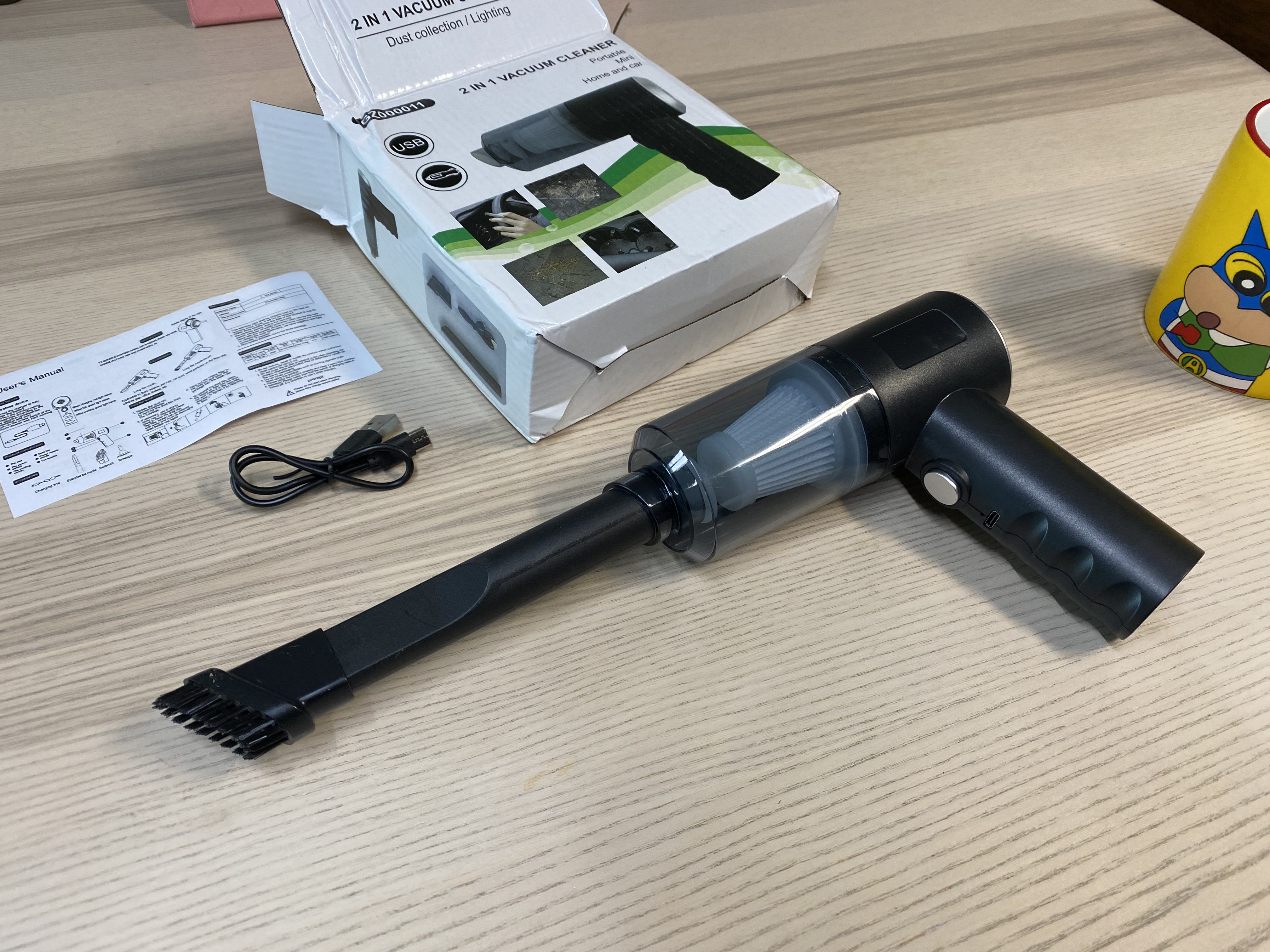 청소기 본체와 먼지통, 노즐, 브러쉬, 충전 케이블, 설명서가 들어있습니다. 제가 구매한 이 청소기는 제품 구성이 다른 제품보다는 적은 것 같네요. 그래서 저렴한 것 같습니다. 필요한 노즐과 브러쉬 등이 있는지 잘 보고 구매하세요. 저는 저렴해서 대충 구매를 했는데 이 정도로도 충분한 것 같습니다.