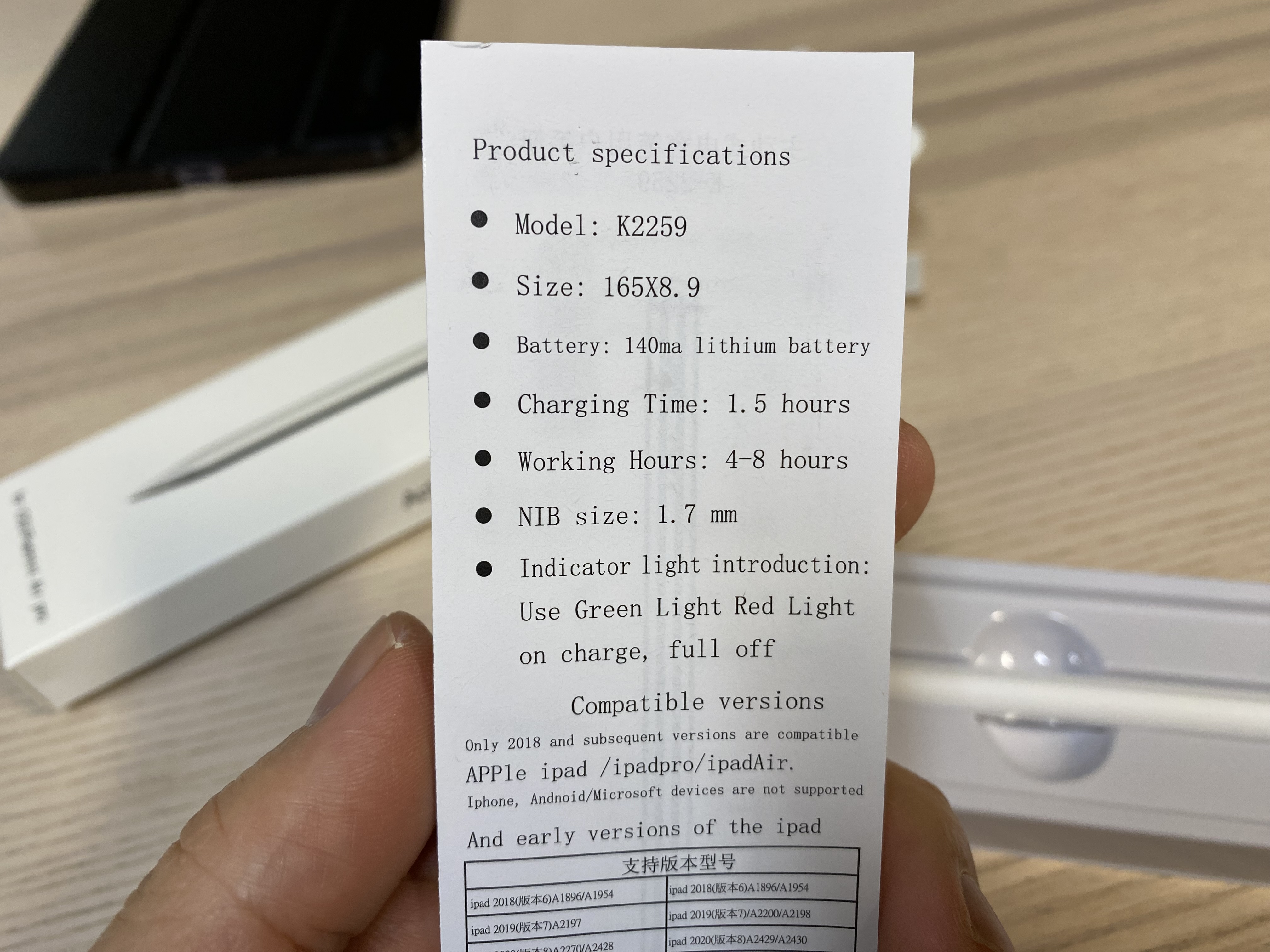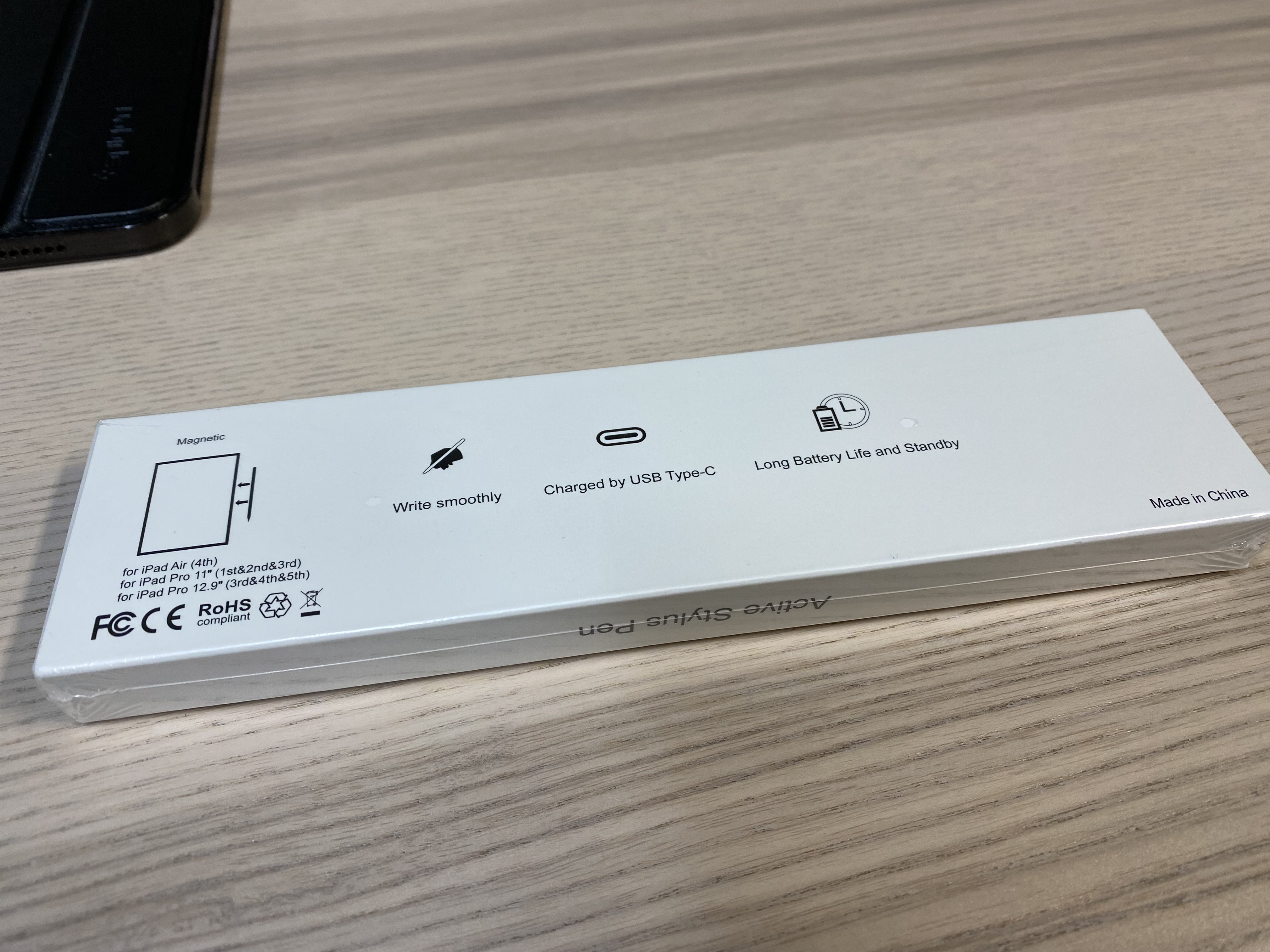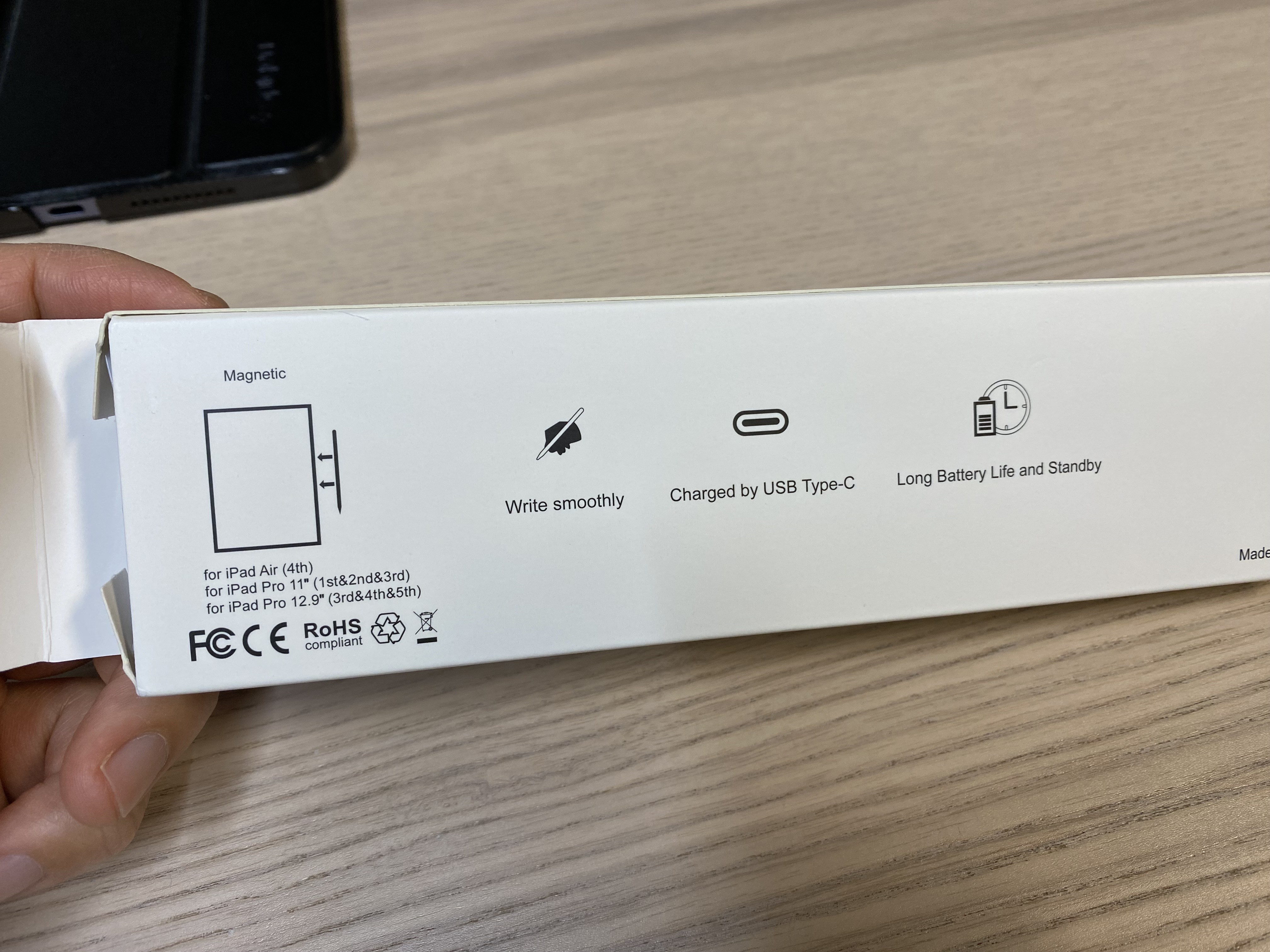 박스를 보면 제품의 특성을 대강 알 수 있습니다. 확인은 못해봤지만 지원하는 기기는 아이패드 에어 4세대, 아이패드 프로 11인치 1, 2, 3세대, 아이패드 프로 12.9인치 3, 4, 5세대라고 적혀있네요. USB C타입으로 충전이 가능한 제품입니다. 너무 저렴한 제품이라 그런지 무선 충전은 지원하지 않습니다. 하지만 마그네틱이 있어서 아이패드 옆에 착 달라붙습니다.