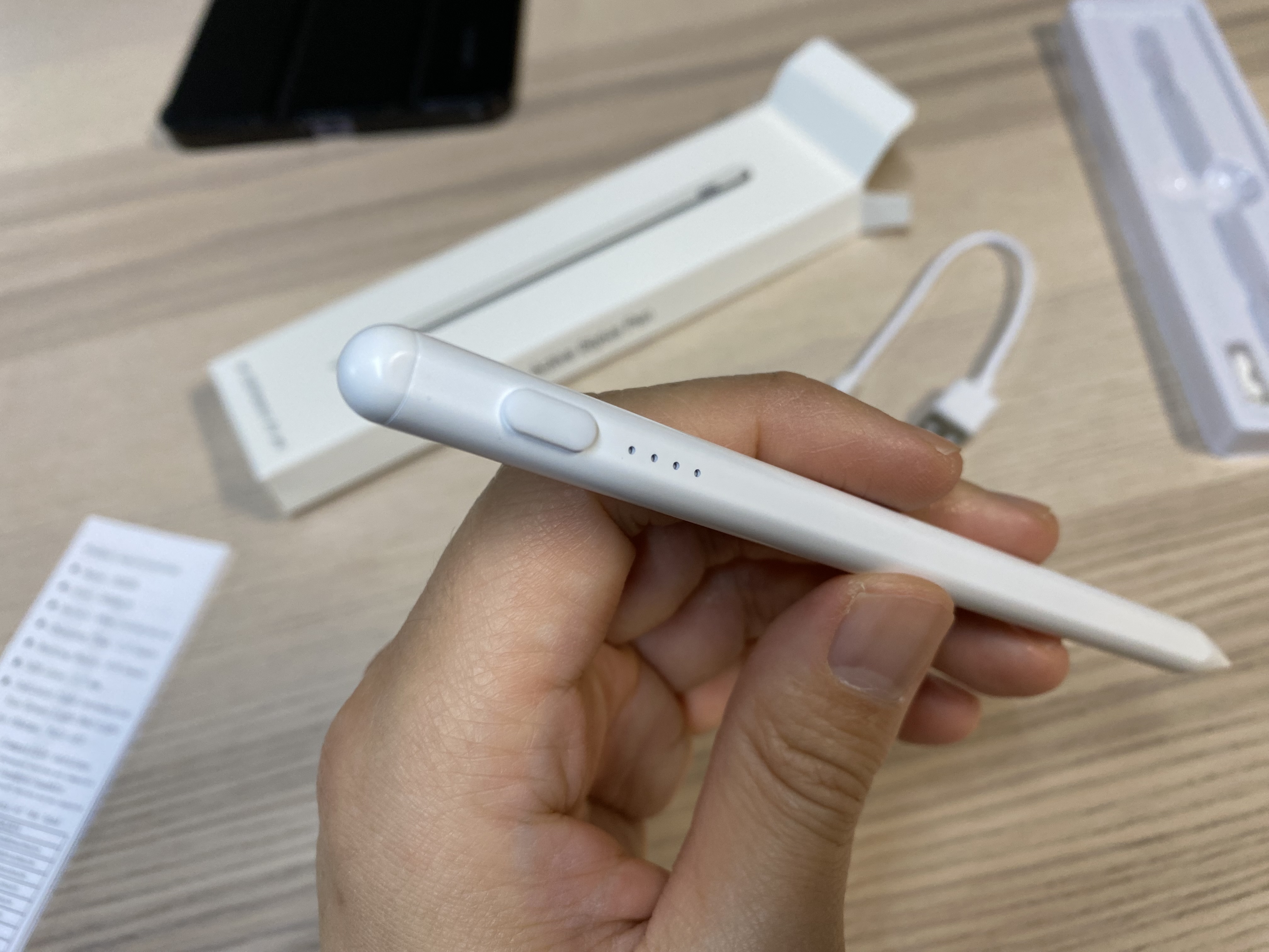 이것이 바로 4000원짜리 알리 짭플펜슬입니다. 딱 잡았을 때 가벼운 느낌을 확 받았습니다. 애플펜슬 1세대와 비교하면 확실히 가볍습니다. 아마도 애플펜슬 2세대보다도 가볍지 않을까 싶네요. 디자인은 그냥 무난합니다. 펜슬에 로고 같은 게 아무것도 안 적혀있어서 괜찮으면서 별로인 것 같네요. 고급스러운 느낌은 없습니다.