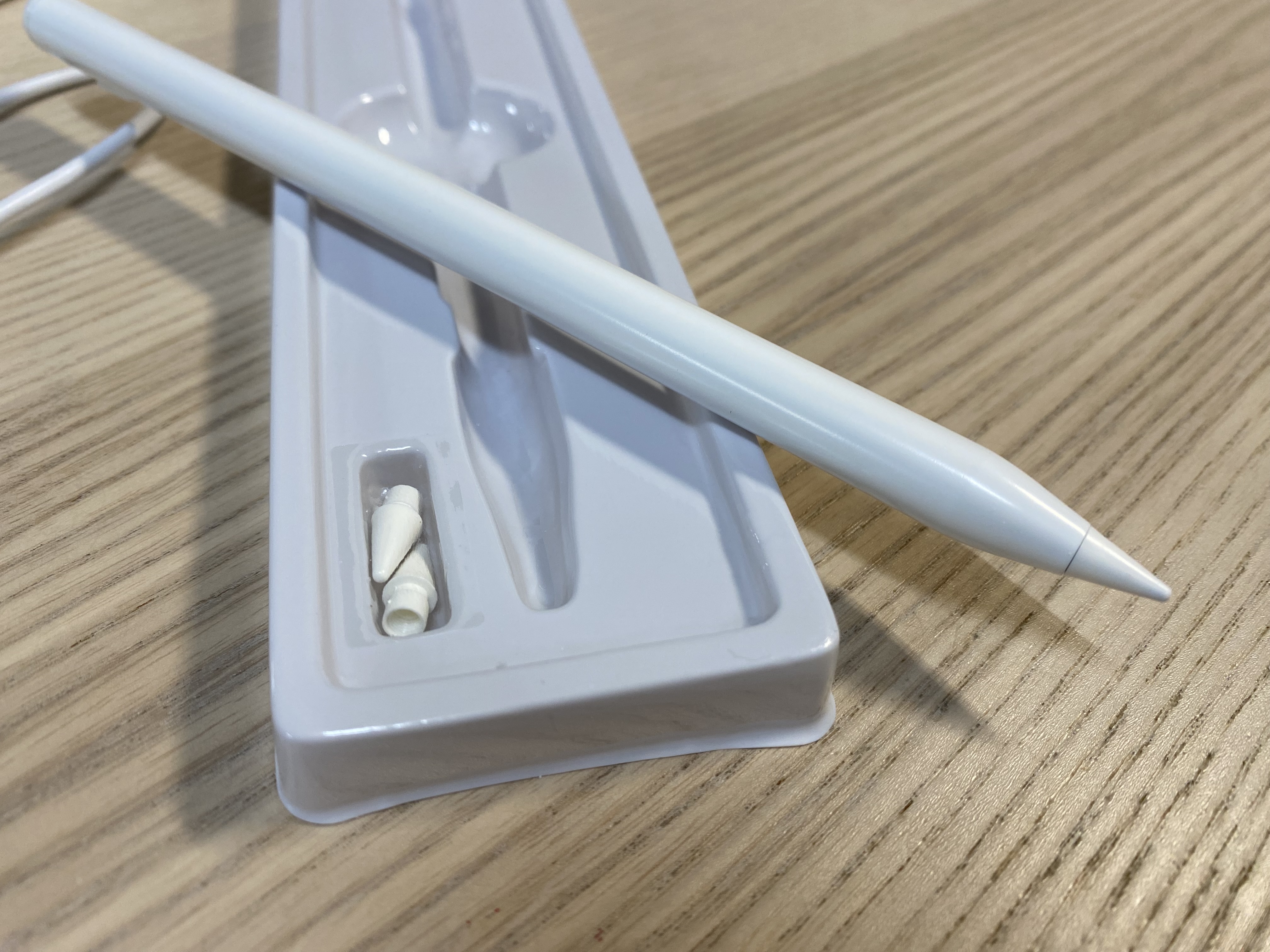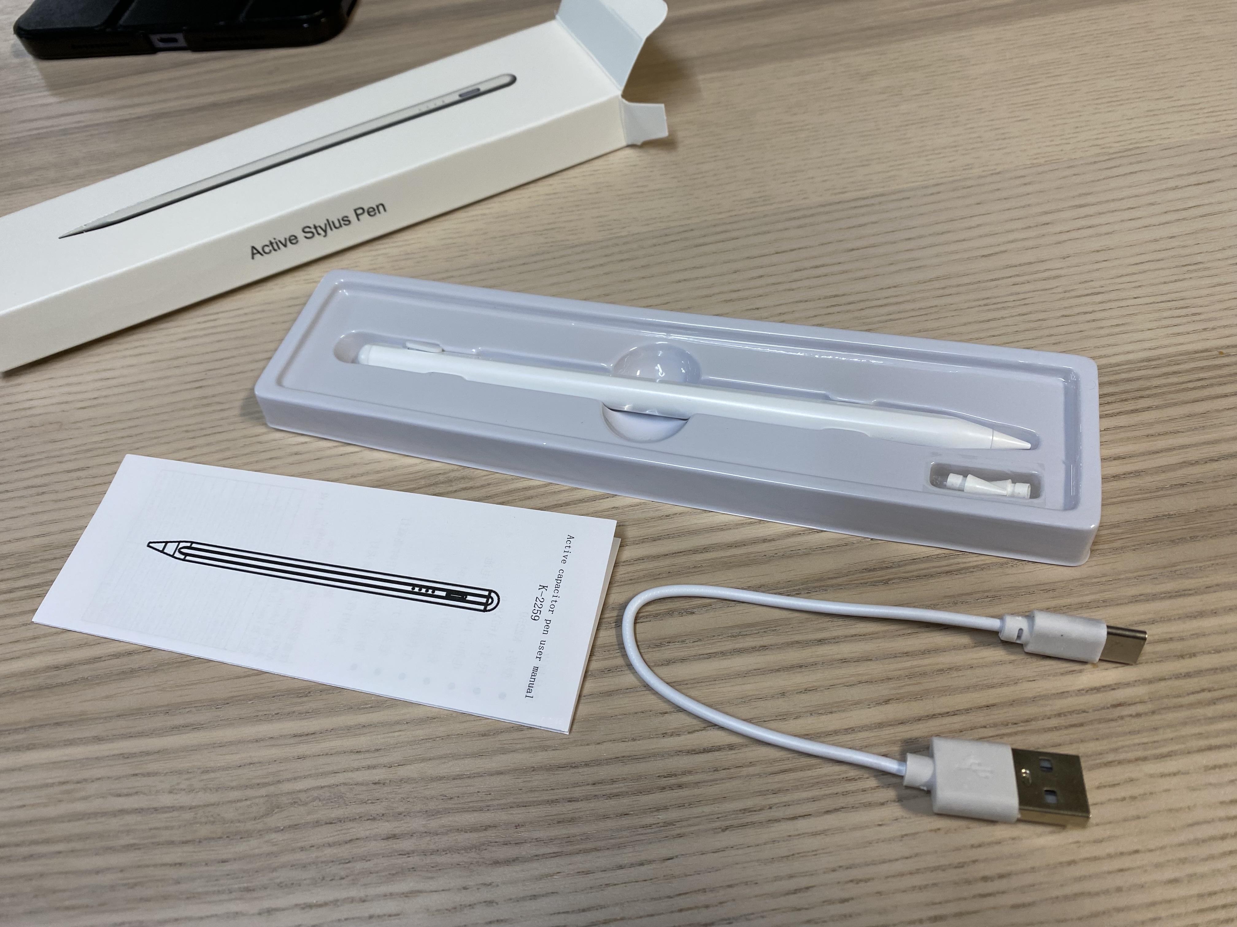 알리익스프레스 짭슬펜슬을 개봉한 모습입니다. 짭플펜슬이 들어있고 설명서, 충전 케이블이 있습니다. 자세히 보면 교체할 수 있는 애플펜슬 팁(펜촉)도 2개 있습니다. 싸지만 있을 건 다 있네요.
