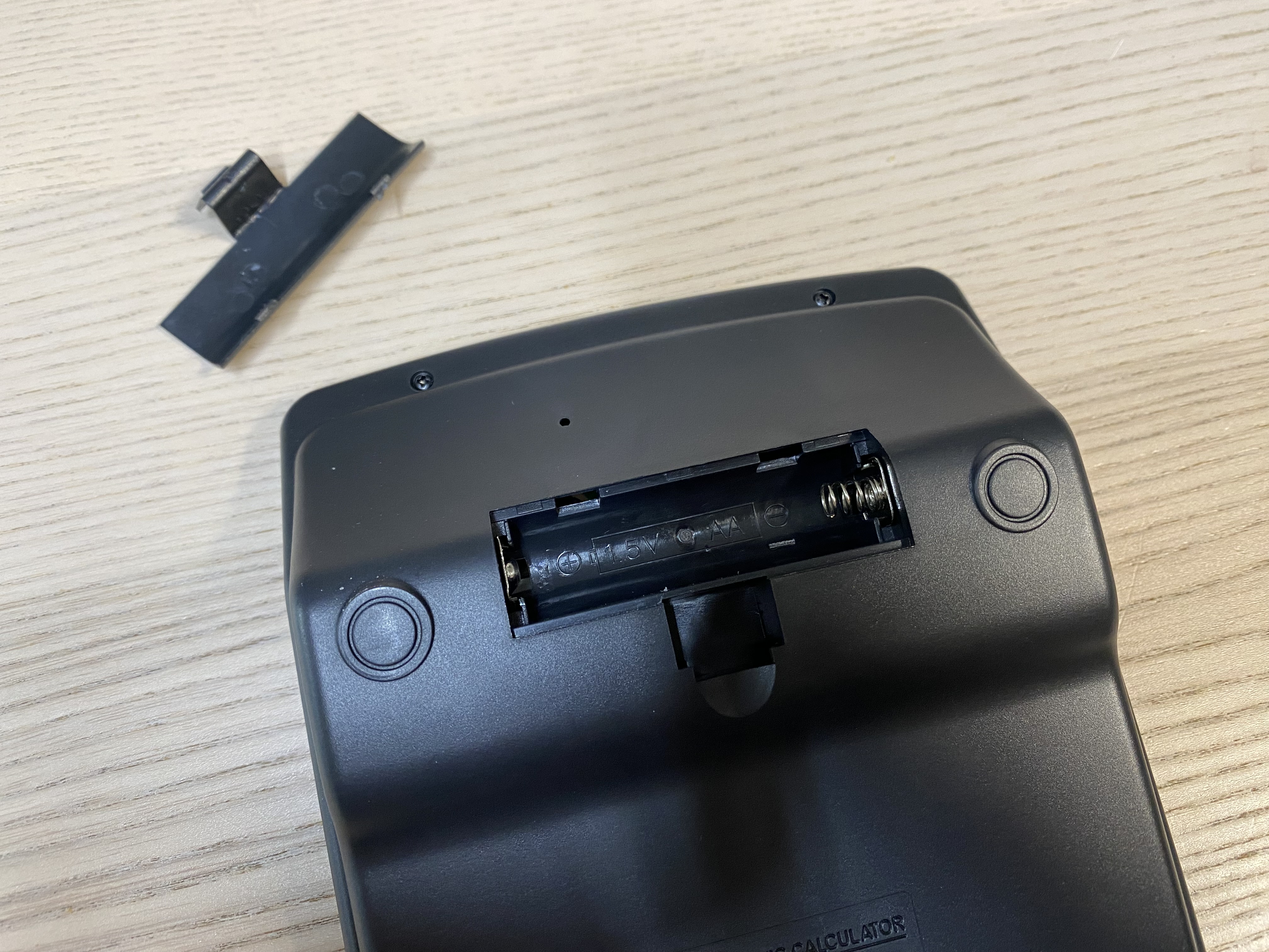 계산기 바닥에보면 배터리를 넣을 수 있는 부분이 있습니다. AA 사이즈 건전지를 넣고 쓰면 됩니다.