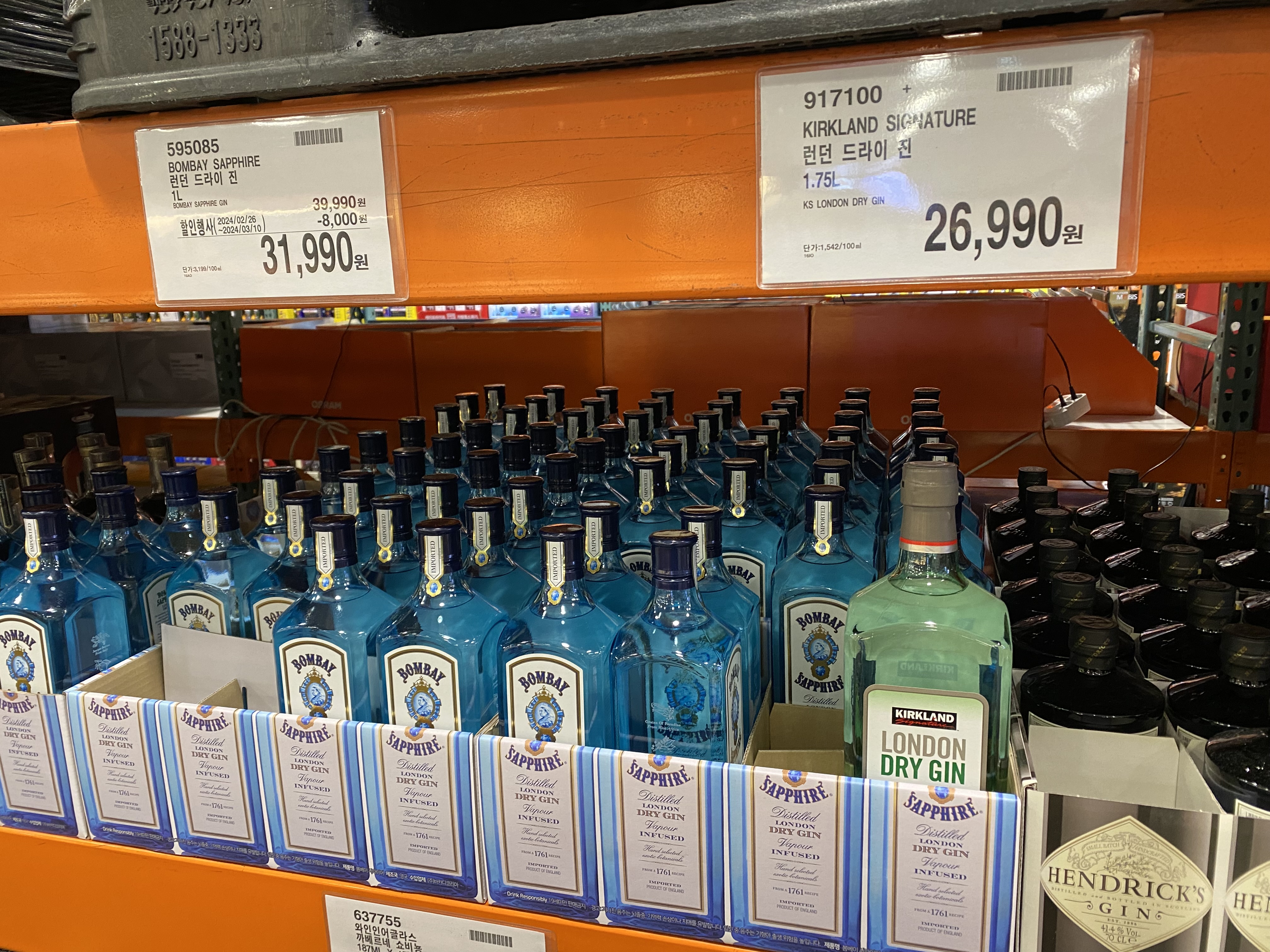코스트코 커클랜드 위스키를 살 때 마침 하나 남은 런던 드라이진도 커클랜드 시그니처로 한번 구매해봤습니다. 위스키보다 런던 드라이진 가격이 조금 더 저렴하네요. 옆에는 나름 유명한 봄베이 사파이어 런던 드라이진이 할인을 하고 있었습니다. 가격만큼 런던 드라이진의 맛 차이는 분명있지만 진토닉 만들거면 커클랜드 제품이 가성비가 좋은 듯.