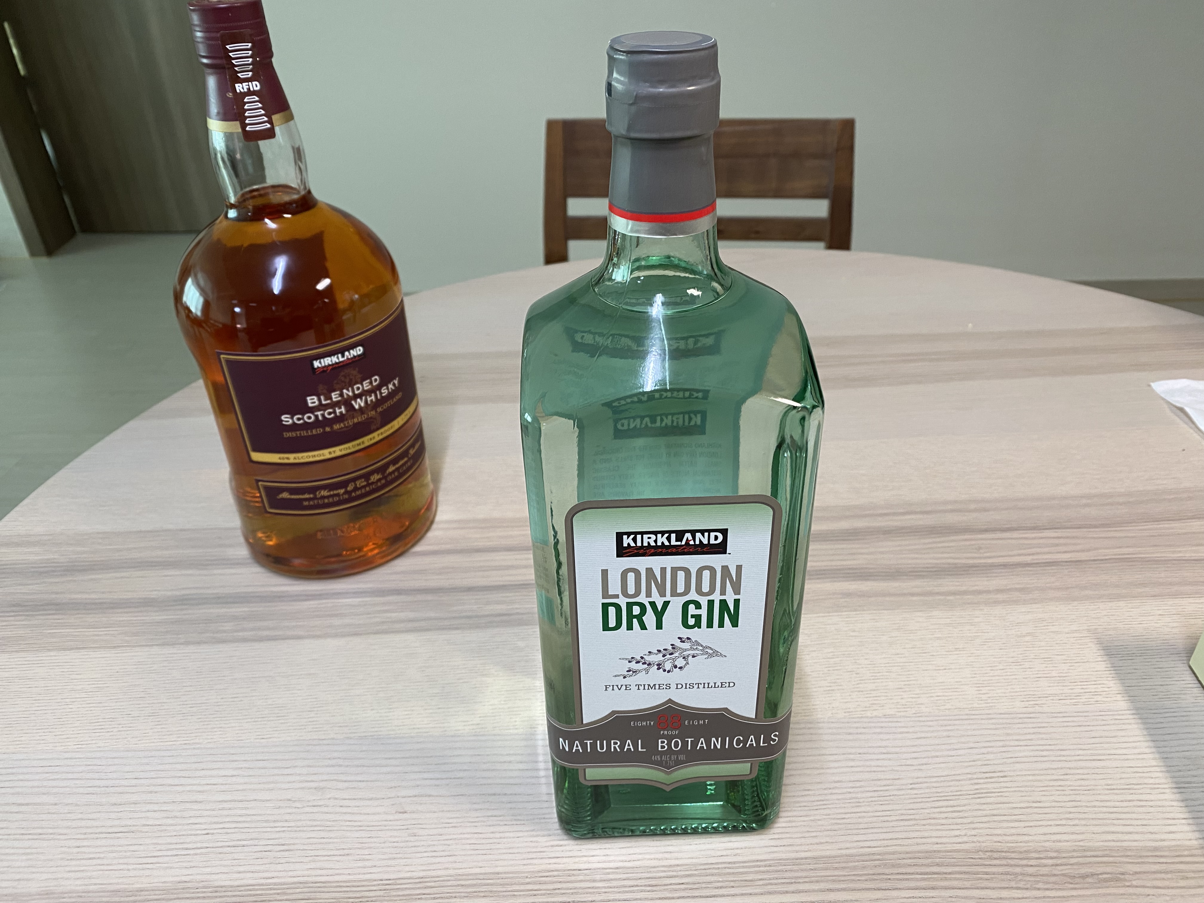 커클랜드 시그니춰 런던 드라이진 1.75L의 비주얼. 병이 너무 크고 튼튼해서 도둑이 들었을 때 무기로 써도 될 만큼 무시무시한 외관을 보여줍니다. 옆에 있는 또 다른 무기는 커클랜드 시그니춰 위스키입니다.