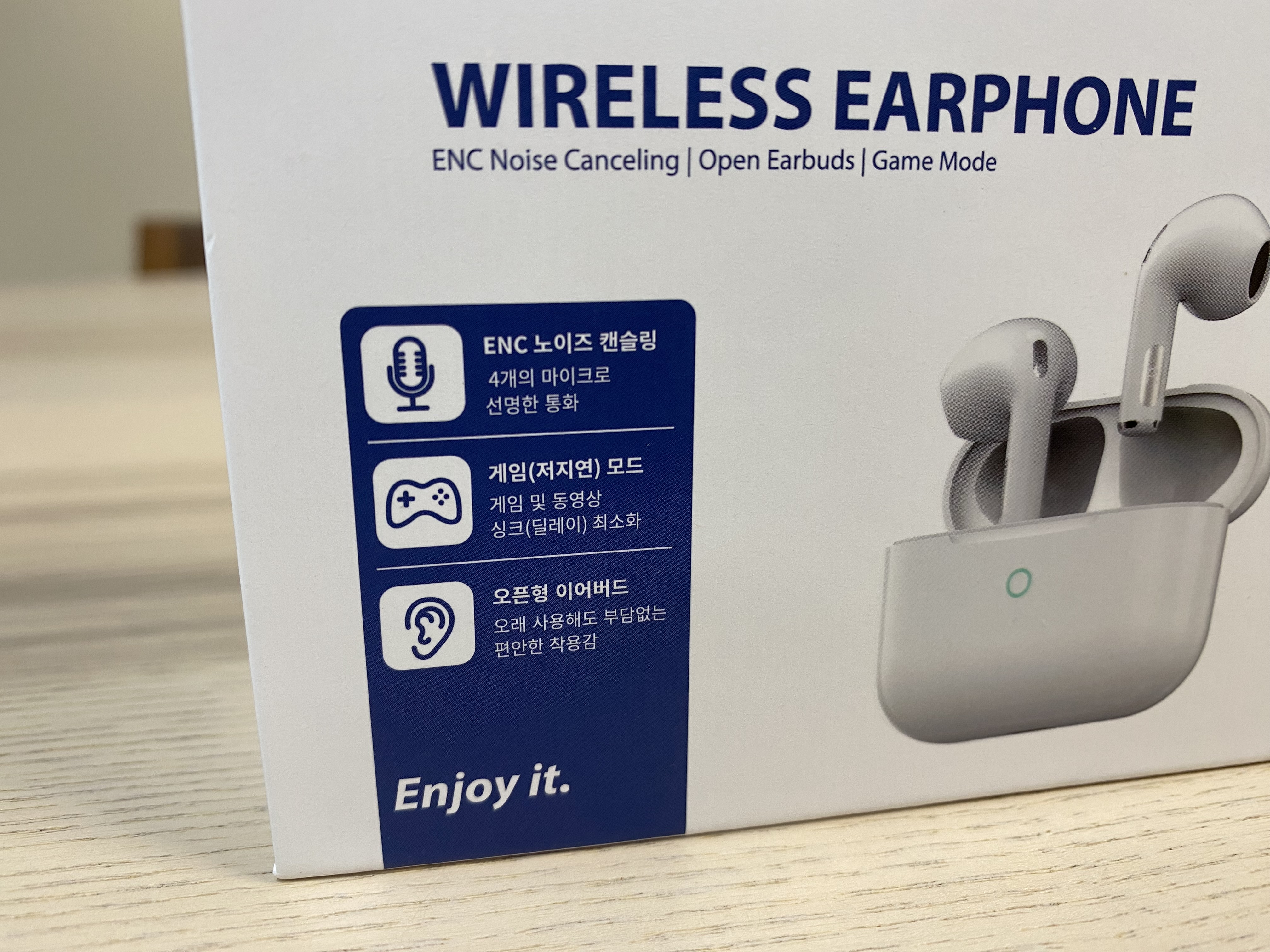 충전중일 때는 빨간LED가 깜빡거리고 완충되면 빨간불이 계속 들어와 있습니다. 제품 페이지를 보면 최대 5시간 사용 가능하고 케이스로 충전하면서 사용하면 15시간까지 쓸 수 있다고 합니다.