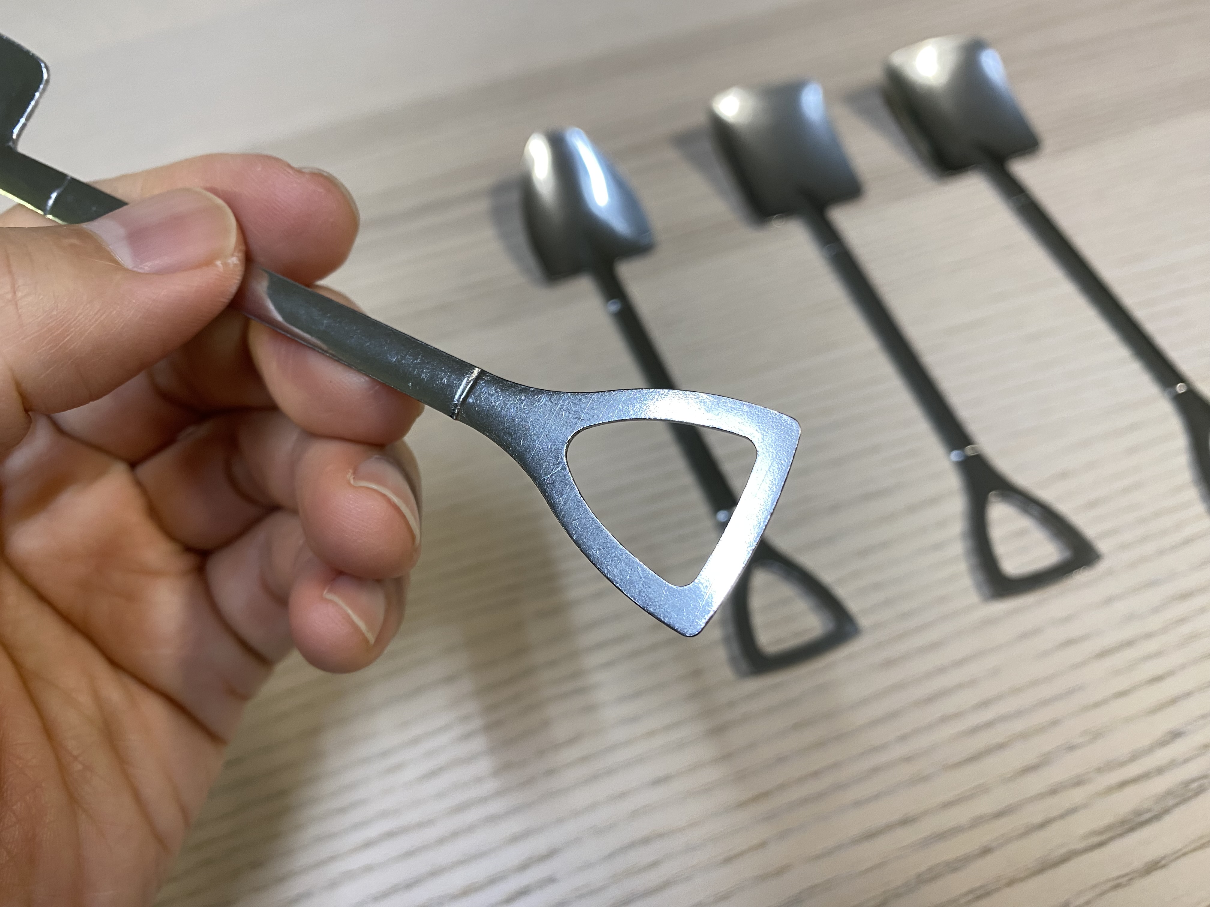 알리익스프레스 삽모양 티스푼. 귀여워서 살까말까 고민이 된다면 한번 더 고민을 해보시길 바랍니다. 뭔가 사람이 음식을 먹는 용도로 쓰기는 좀 그렇습니다. 일반적인 티스푼보다 좀 크고. 아주 작은 화초를 키우시는 분이라면 모종삽으로 쓰는 건 괜찮을 것 같습니다. 가격이 4개에 천 원이라 퀄리티를 바란 제 잘못이라 생각합니다. 다음에 이런 비슷한 제품을 알리나 테무에서 살 때 좀 더 고민을 할 것 같습니다.