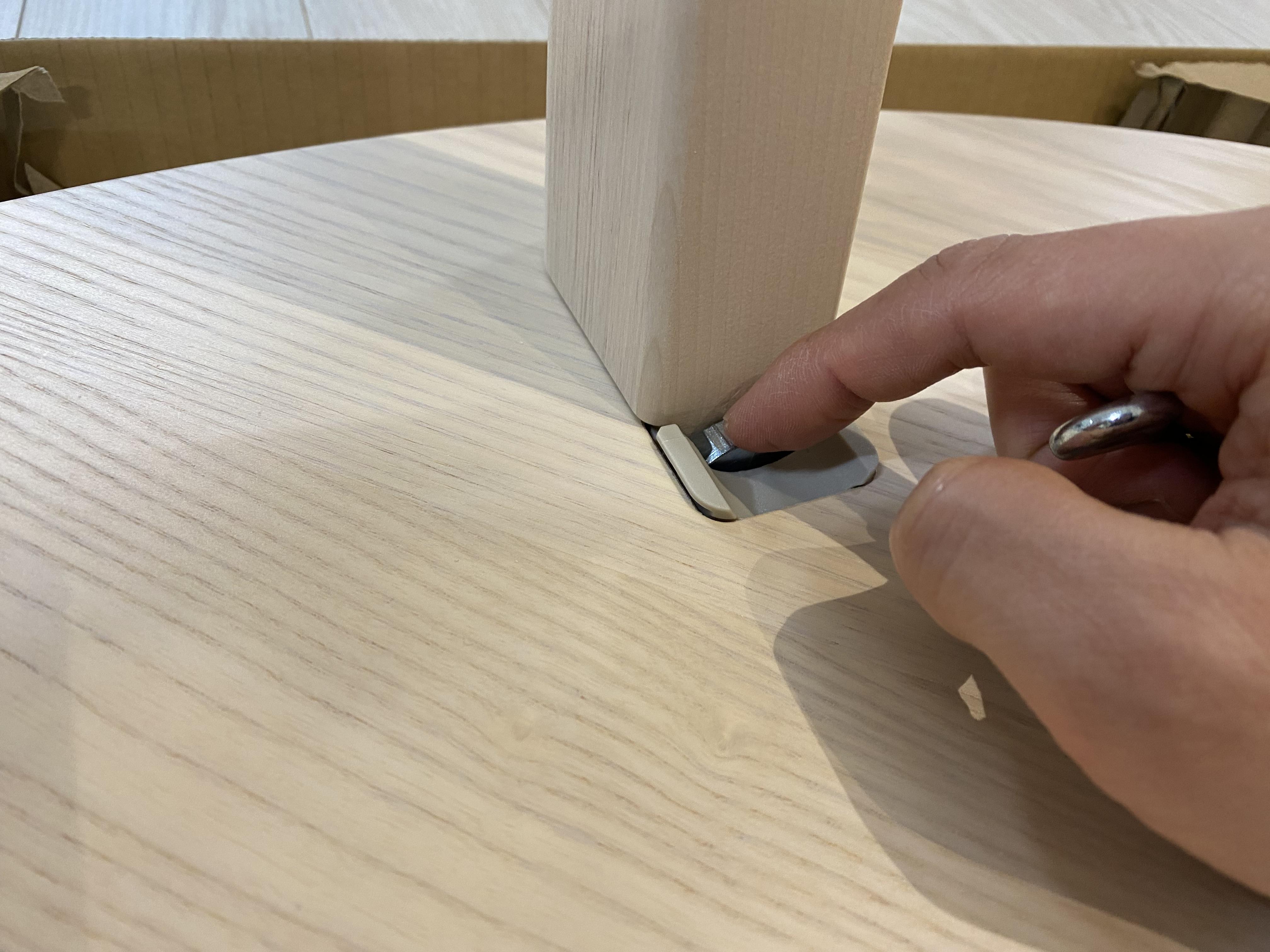 리사보 상판에 다리를 연결한 후 고정 부품을 돌려주는 모습입니다.