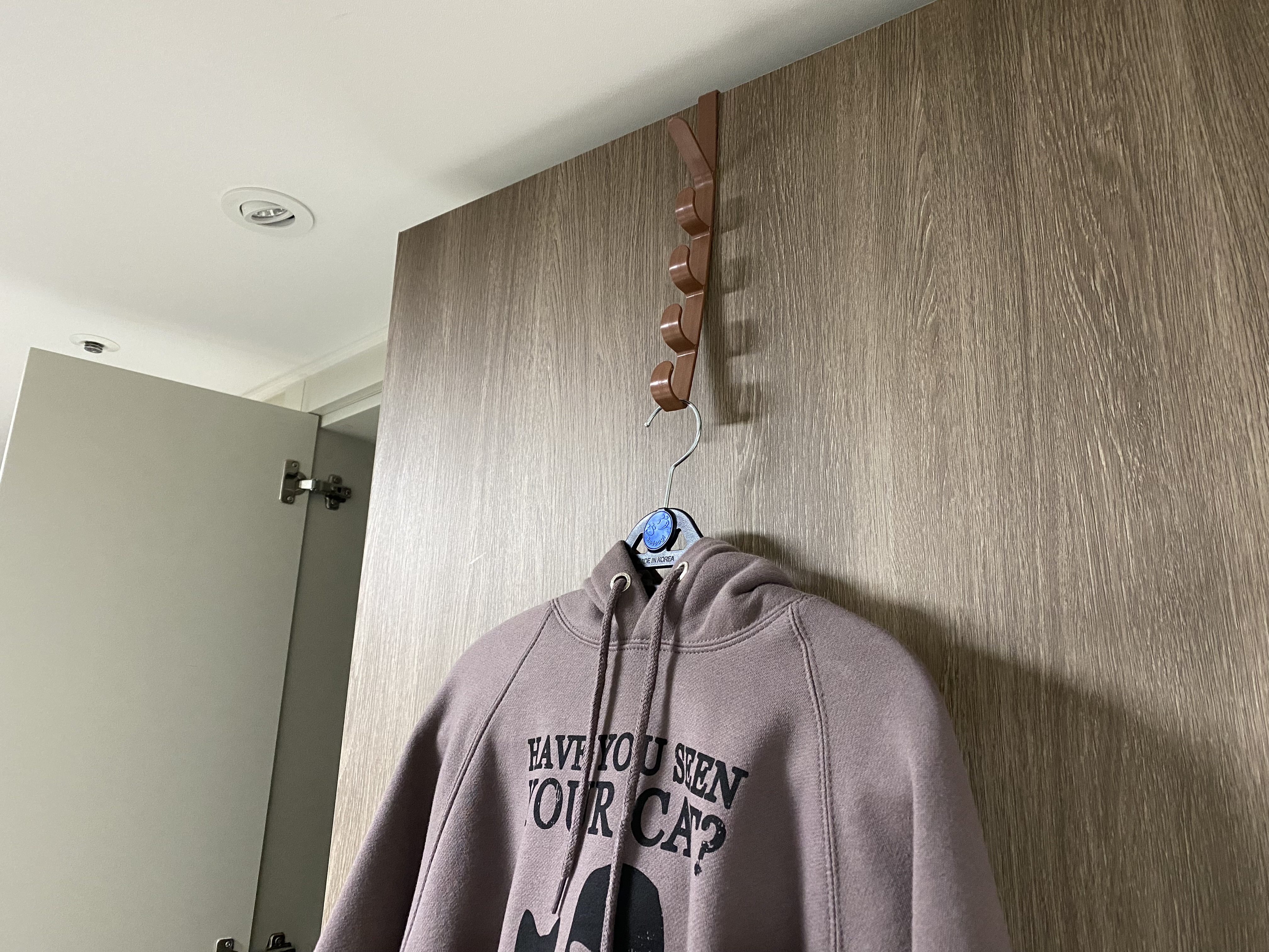 플라스틱 도어 후크가 휘어져있어도 이렇게 옷을 걸면 괜찮습니다. 천천히 펴지겠지 생각했는데 생각보다 안 펴지네요.