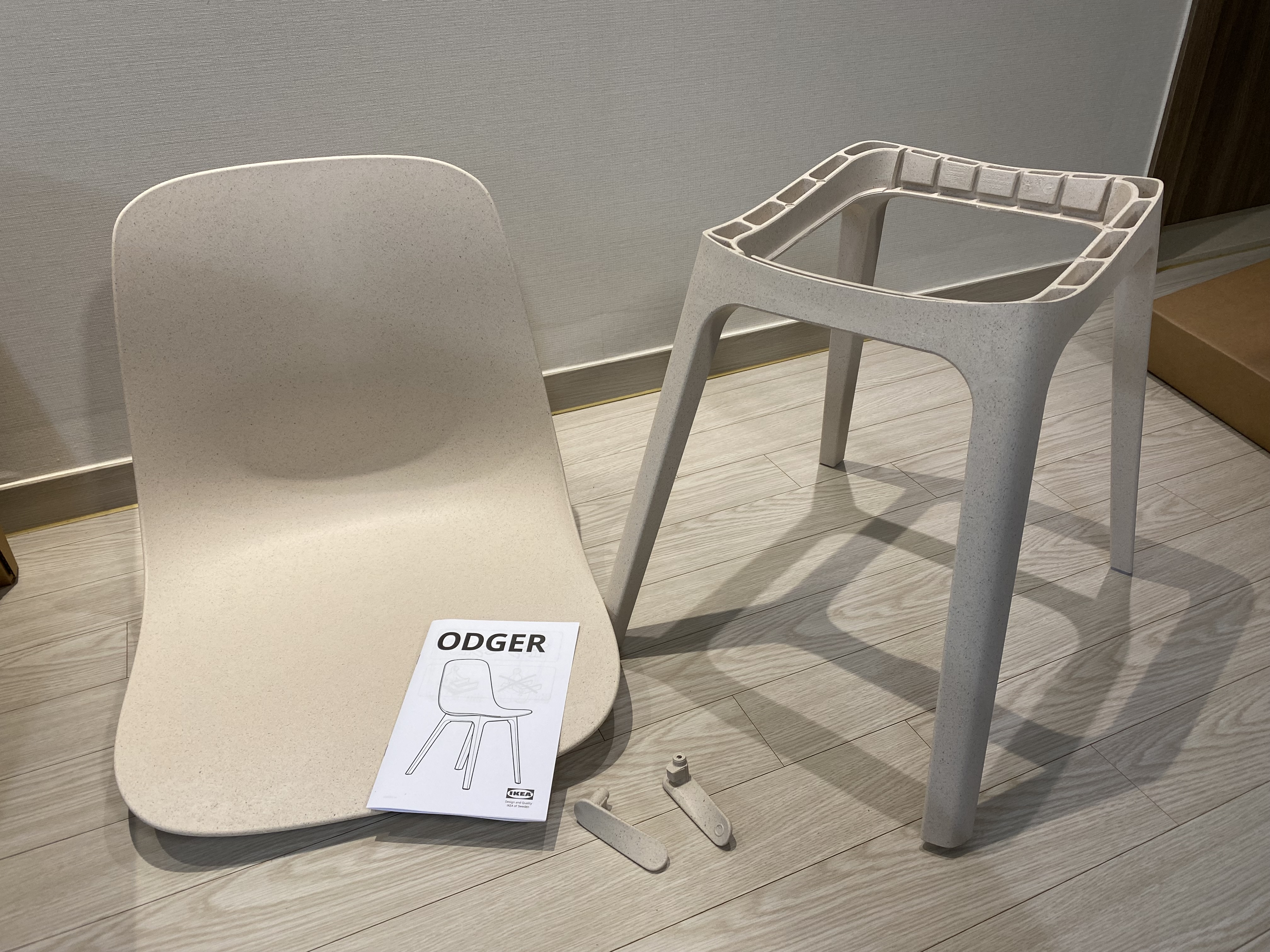 이케아 IKEA ODGER 오드게르 의자를 개봉한 모습입니다. 의자는 크게 두 부분으로 나뉘어져있고 2개의 연결 부품으로 고정을 하게 됩니다.