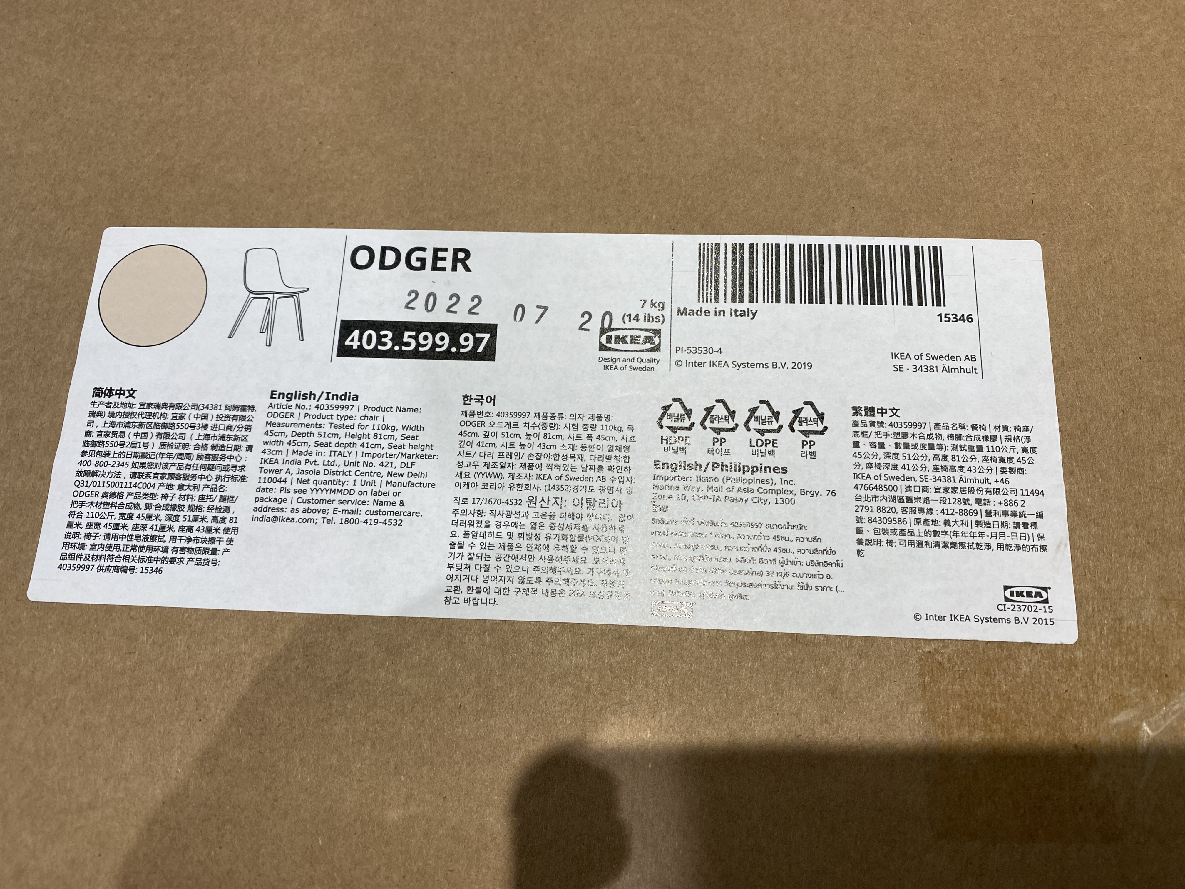 이케아 IKEA ODGER 오드게르 의자의 박스 포장이 이렇게 생겼습니다. 오드게르 의자 1개당 가격은 109,000원으로 저렴하지는 않습니다. 예전에 89,000원 정도 할 때 구매를 할걸 후회 중입니다. 역시 이런 공산품은 필요한 순간 빨리 구매를 하는 게 좋은 것 같습니다. 인플레이션으로 정말 가격이 많이 올랐습니다. 가끔 할인도 하는데 할인을 기다리다 가격이 오를 수 있으니 조심하세요. ㅎㅎ