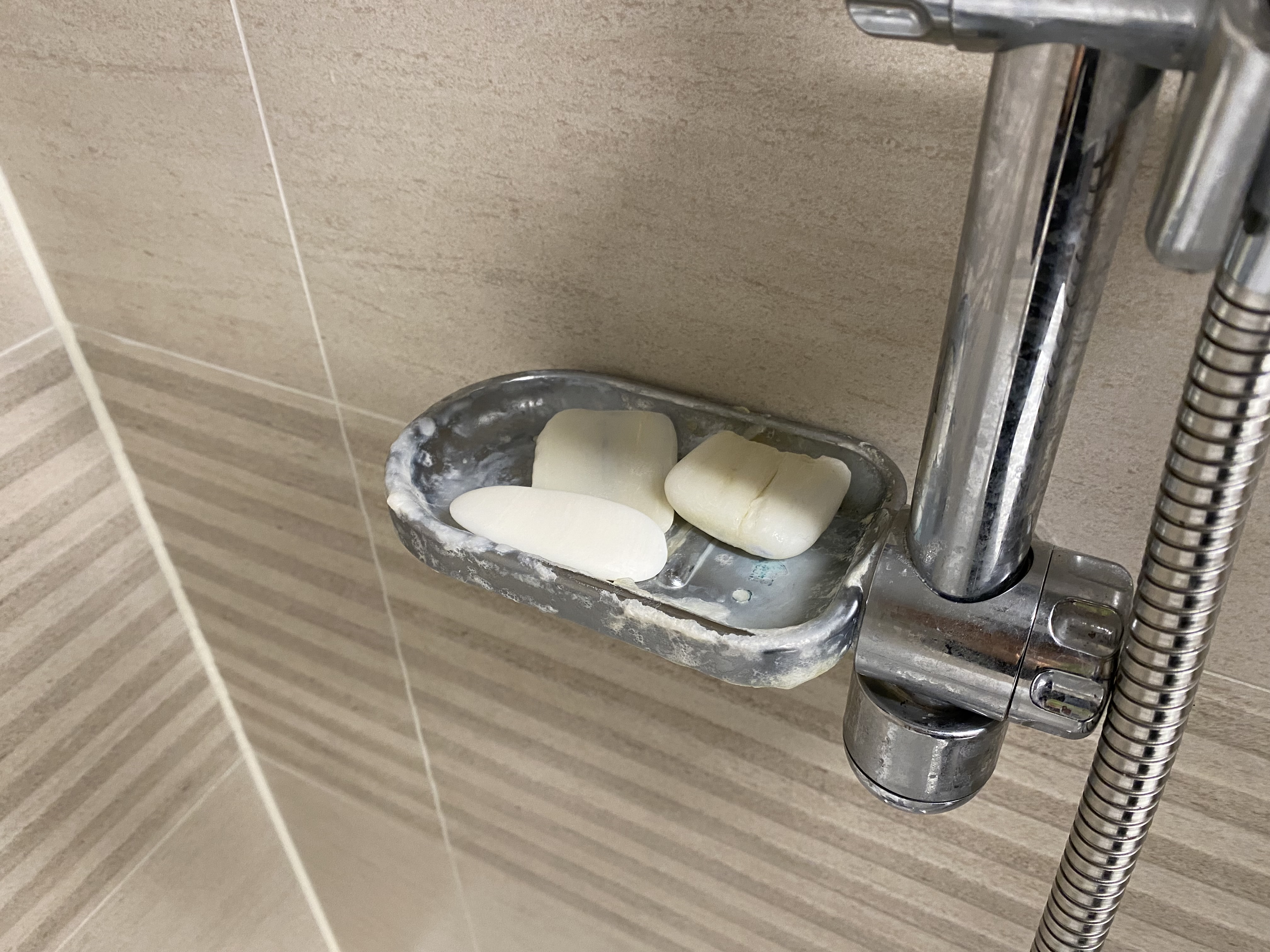 샤워기 옆에 부착된 기존에 사용하던 비누 받침은 이 모양입니다. 물도 잘 안 빠지고 청소하기도 쉽지 않아요.