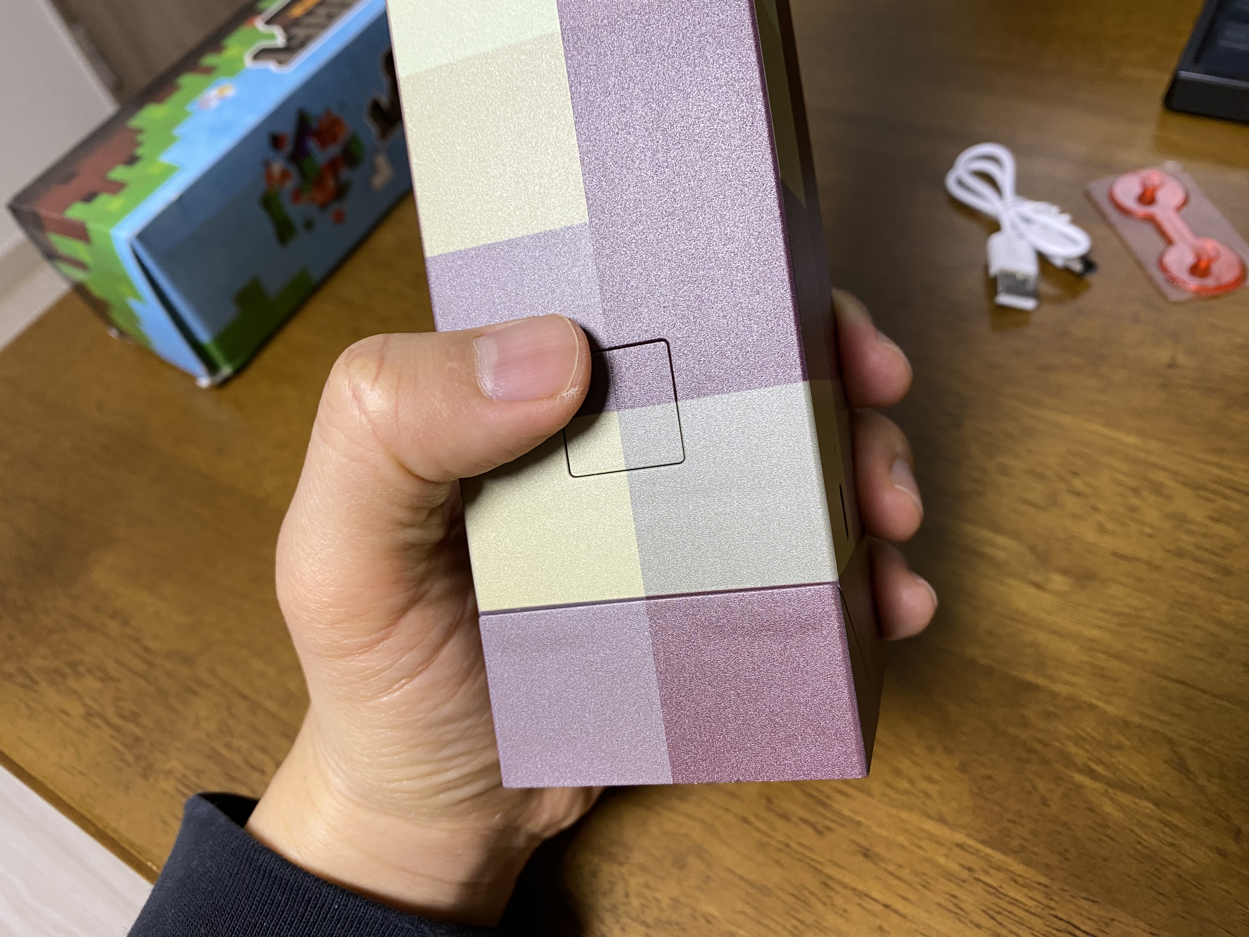 알리 마인크래프트 횃불 장난감 조명을 개봉한 모습입니다. 마인크래프트 횃불과 충전 케이블, 벽에 부착할 수 있는 부품이 들어있습니다.