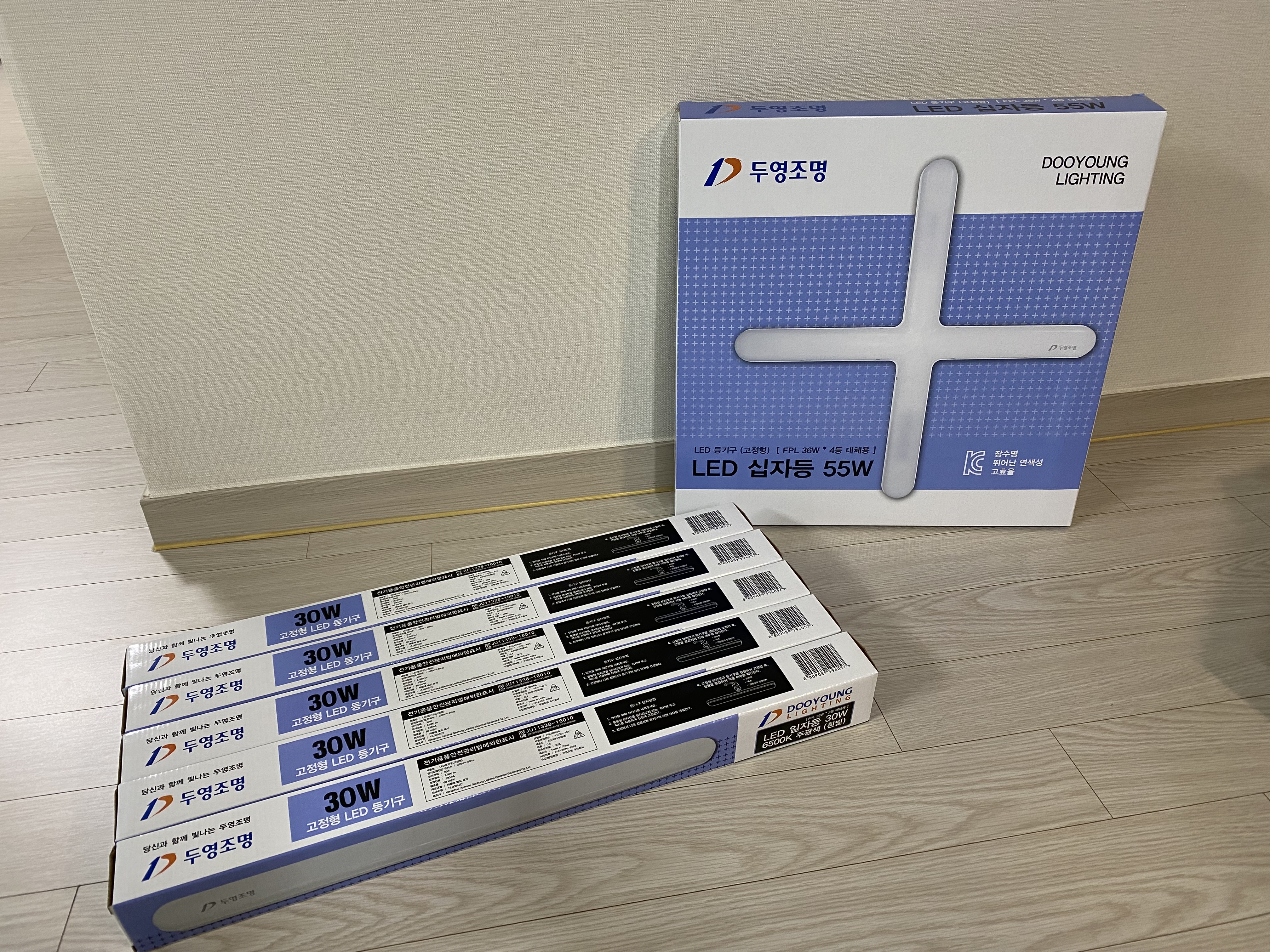 두영 LED 일자등 30W, 두영 LED 십자등 55W. 1년 정도 설치해서 사용 중인데 밝기도 적당하고 고장 없이 잘 사용하고 있습니다. 대기업 제품이 아니라서 망설일 필요는 없을 것 같네요. 기존 오래된 형광등을 교체하는 용도로 괜찮은 것 같습니다. 혹시나 나중에 고장 날 것을 생각해서 1~2개 정도 더 구매할 것은 추천합니다. 배송비 아깝잖아요.