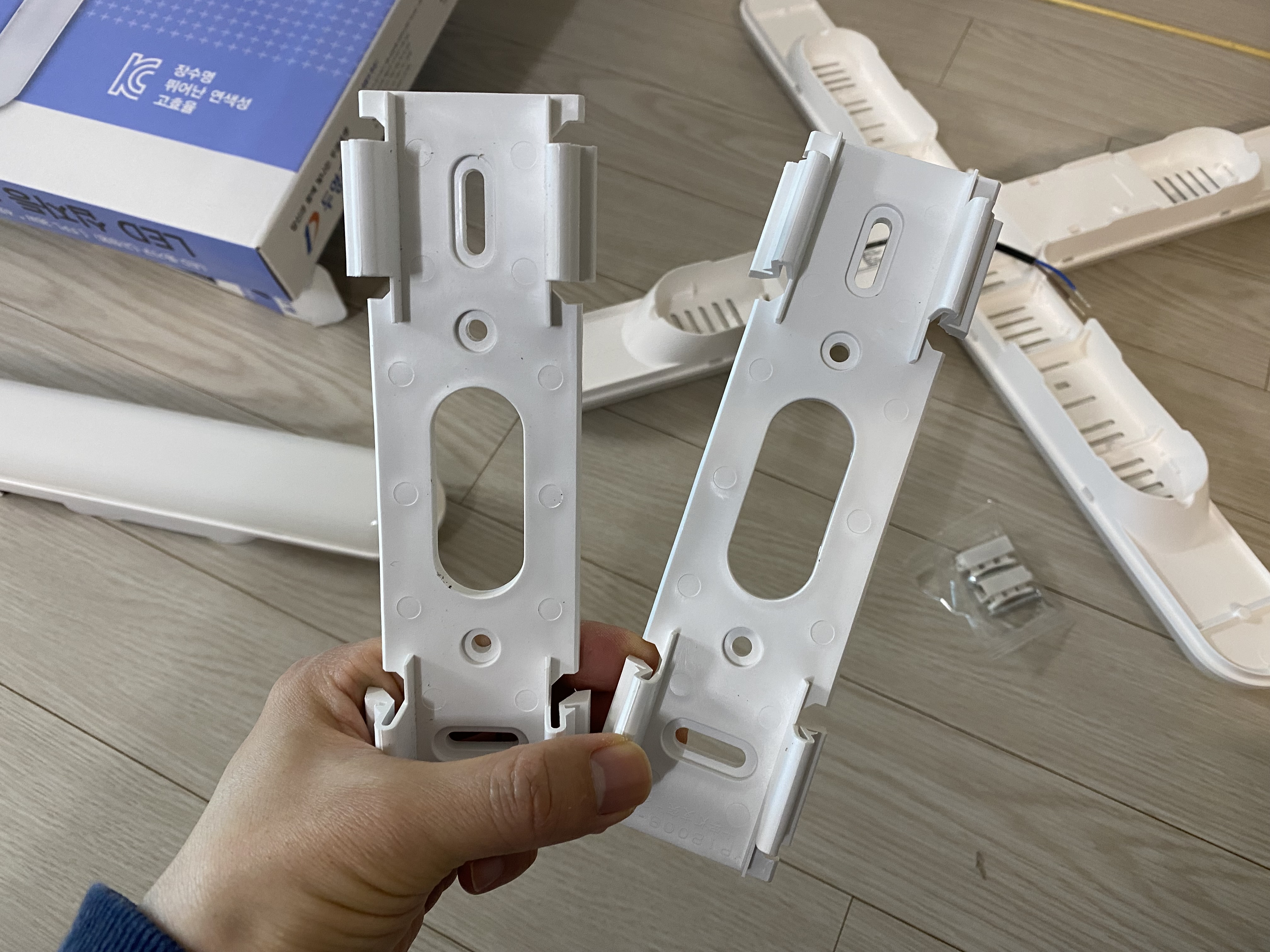 두영 제품이 그냥 쓸만한데 이 브라켓 부분은 좀 별로네요. 일단 플라스틱으로 되어 있는 것도 별로인데 이 부분 마감처리도 좋은 편이 아니라 나중에 브래킷에 LED등을 장착할 때 딸깍거리는 소리가 잘 안나 고생 좀 했습니다. 사실 가격이 저렴해서 큰 불만은 없습니다. 그러려니 합니다.
